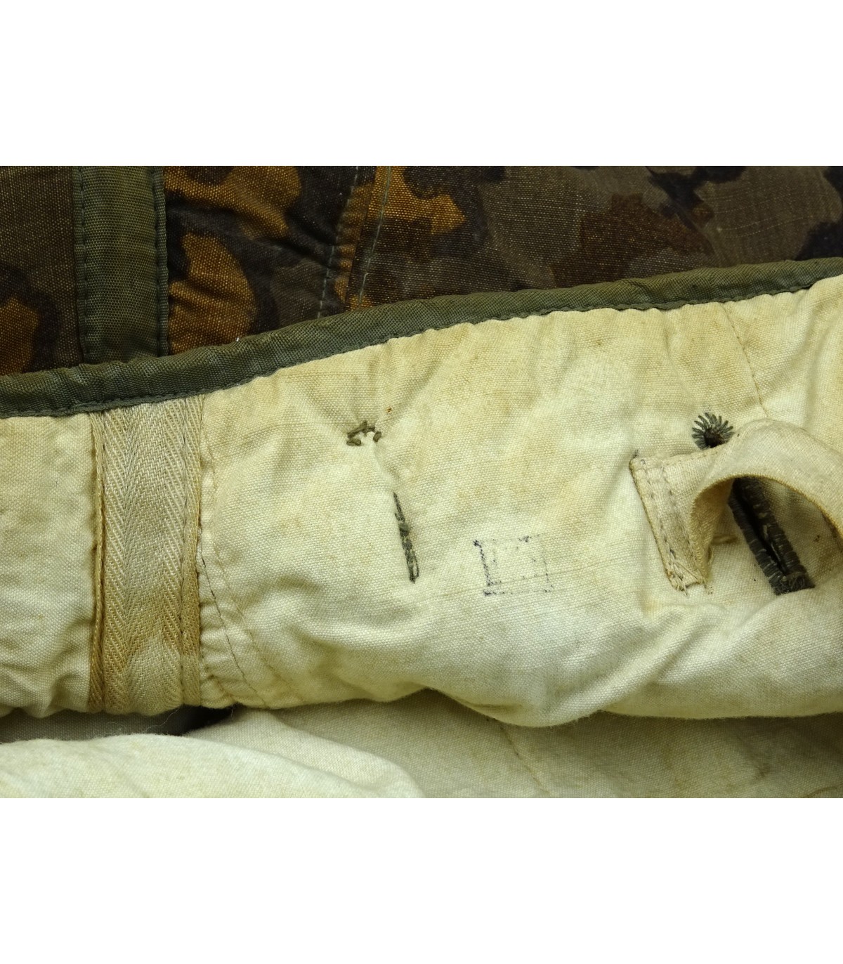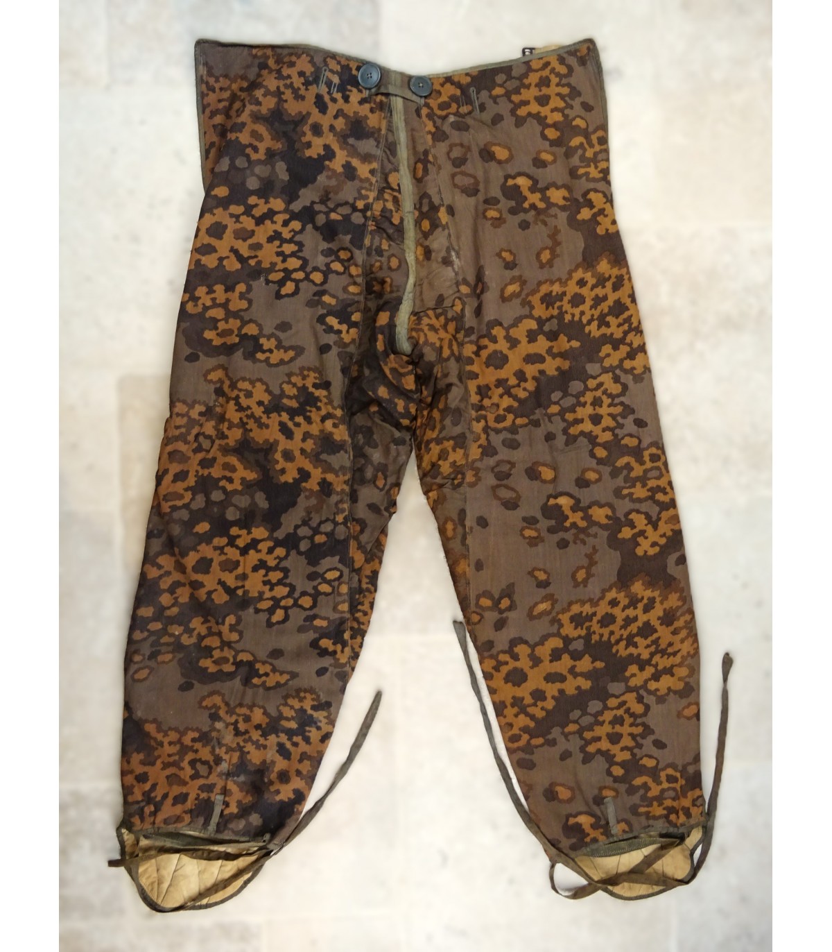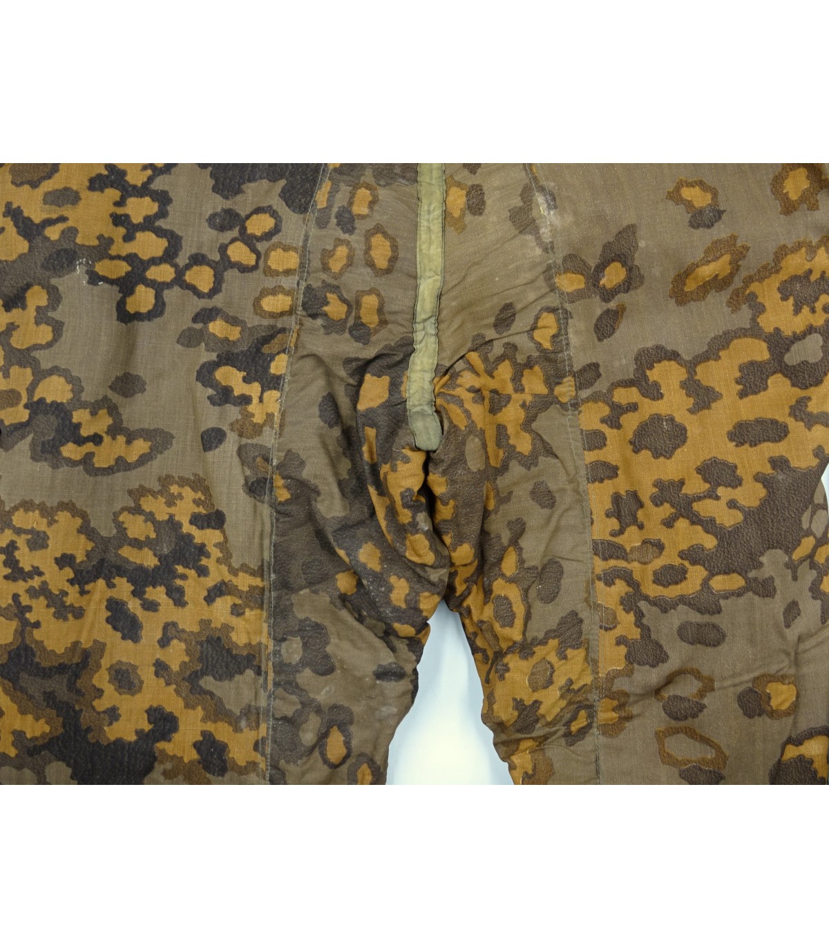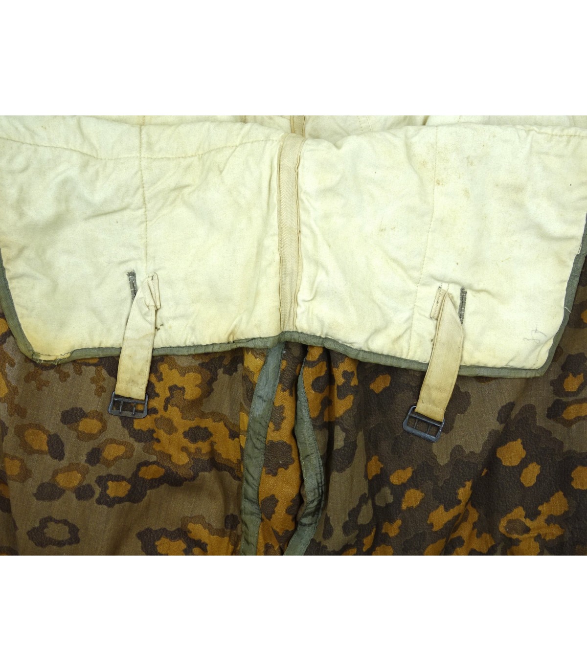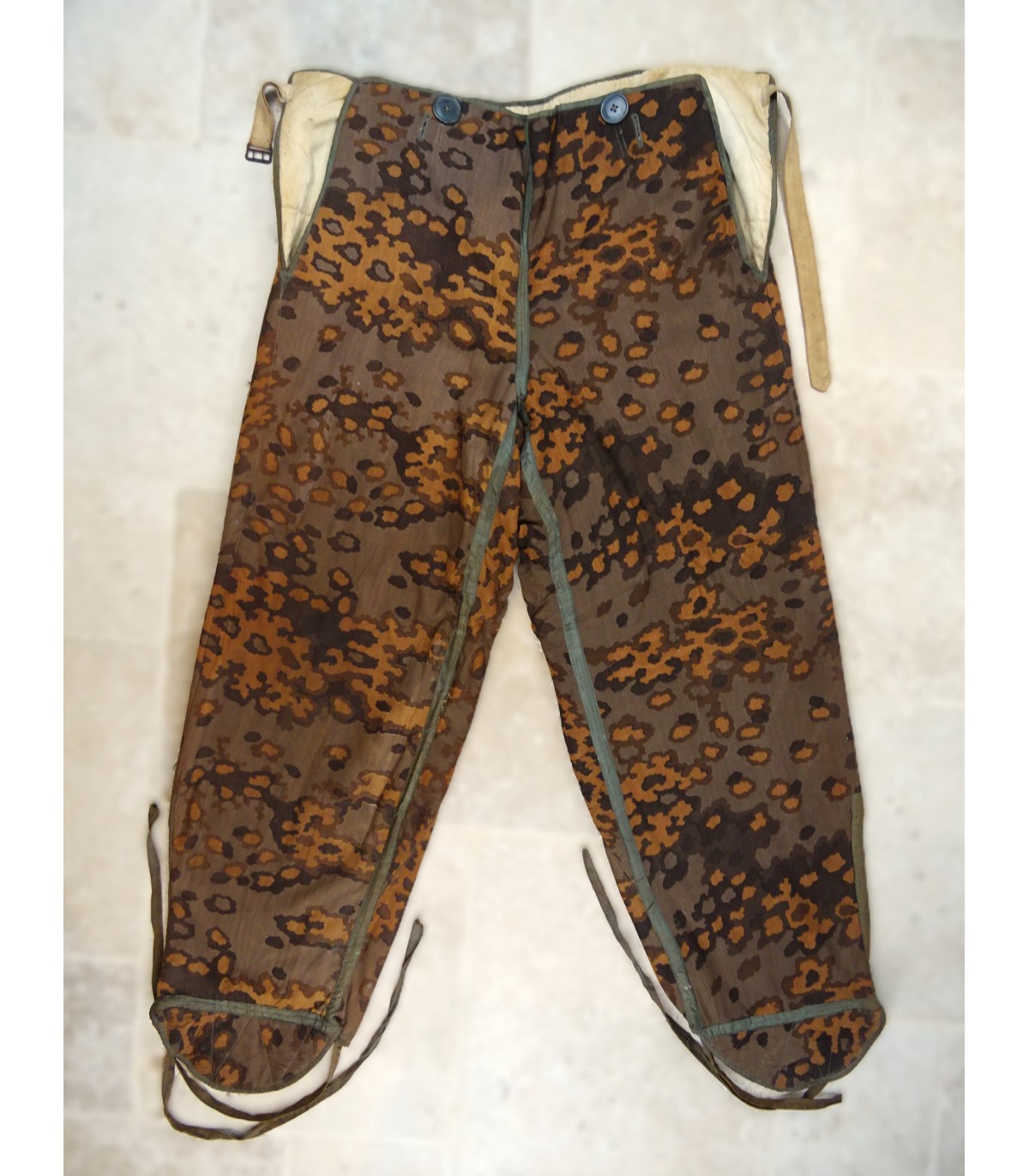 Camouflage feuilles de chêne, réversible blanc. Pour la parka verte à 4 poches, il avait été conçu un pantalon assorti, extremement rare, reconnaissable à ses couvre-pieds. Le pantalon camouflé que nous présentons est coupé sur le même modèle et se distingue des fabrications finalement adoptées par l'absence de poches et de braguette ainsi qu'à la présence des couvre-pieds. Peu porté, on peut imaginer que comme dans toutes les armées, la Waffen-SS a mis une petite série en dotation dans une unité avant de décider de l'adoption. Couleurs splendides. Pièce de musée.