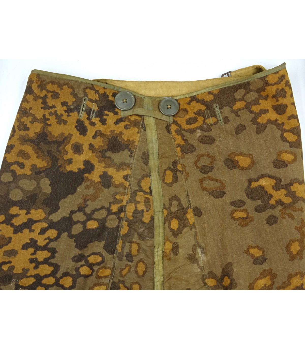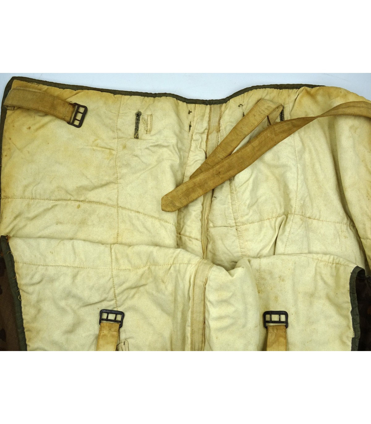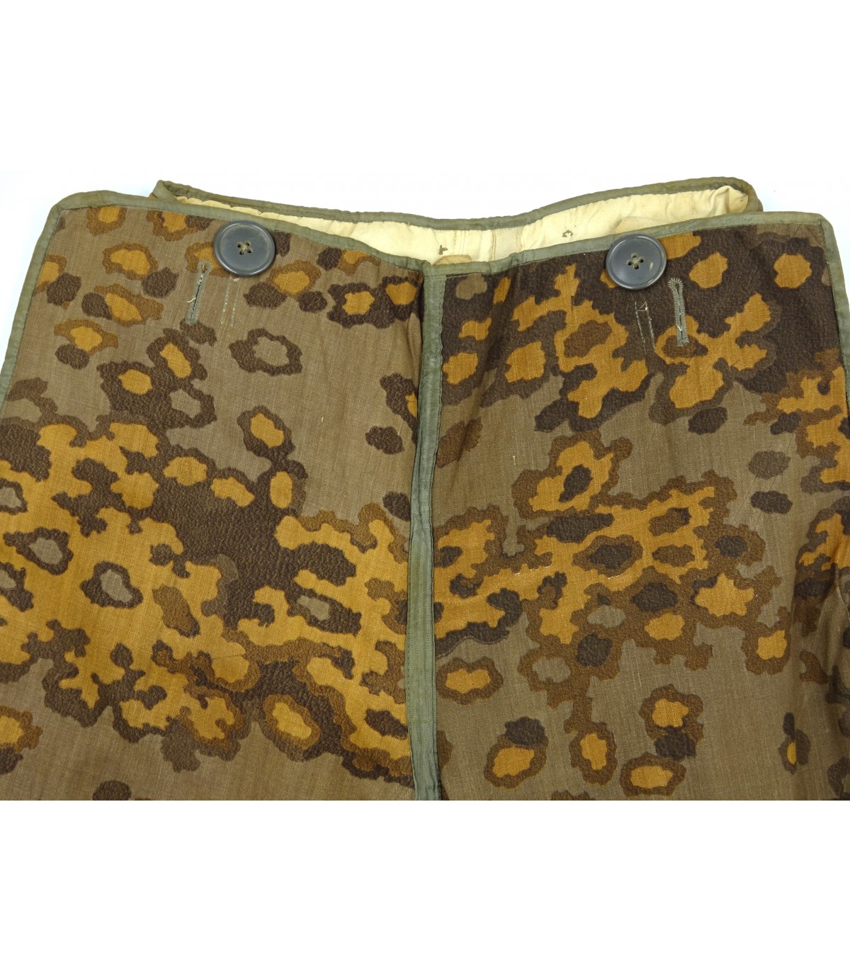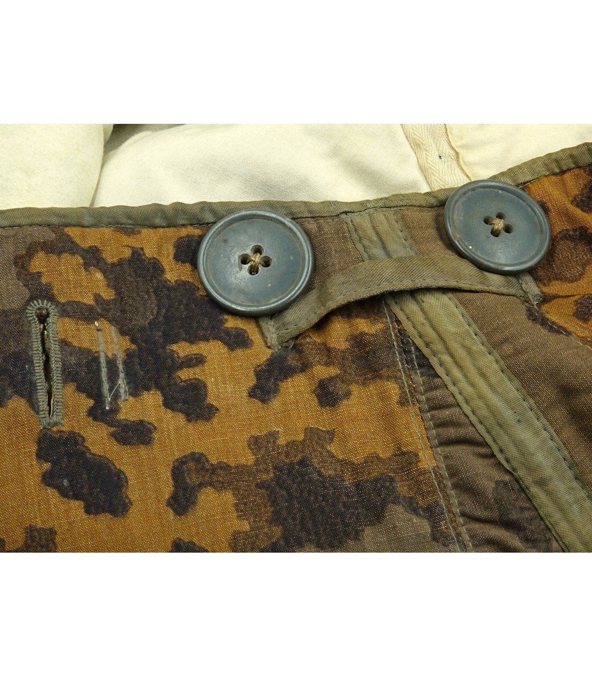 Camouflage feuilles de chêne, réversible blanc. Pour la parka verte à 4 poches, il avait été conçu un pantalon assorti, extremement rare, reconnaissable à ses couvre-pieds. Le pantalon camouflé que nous présentons est coupé sur le même modèle et se distingue des fabrications finalement adoptées par l'absence de poches et de braguette ainsi qu'à la présence des couvre-pieds. Peu porté, on peut imaginer que comme dans toutes les armées, la Waffen-SS a mis une petite série en dotation dans une unité avant de décider de l'adoption. Couleurs splendides. Pièce de musée.