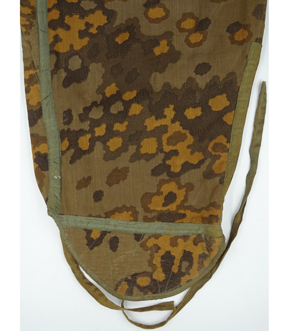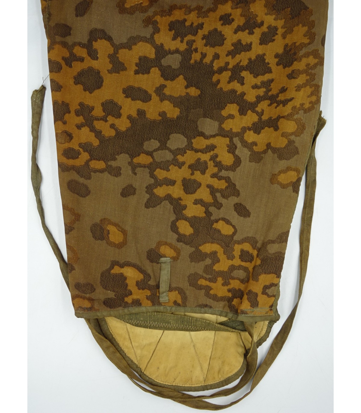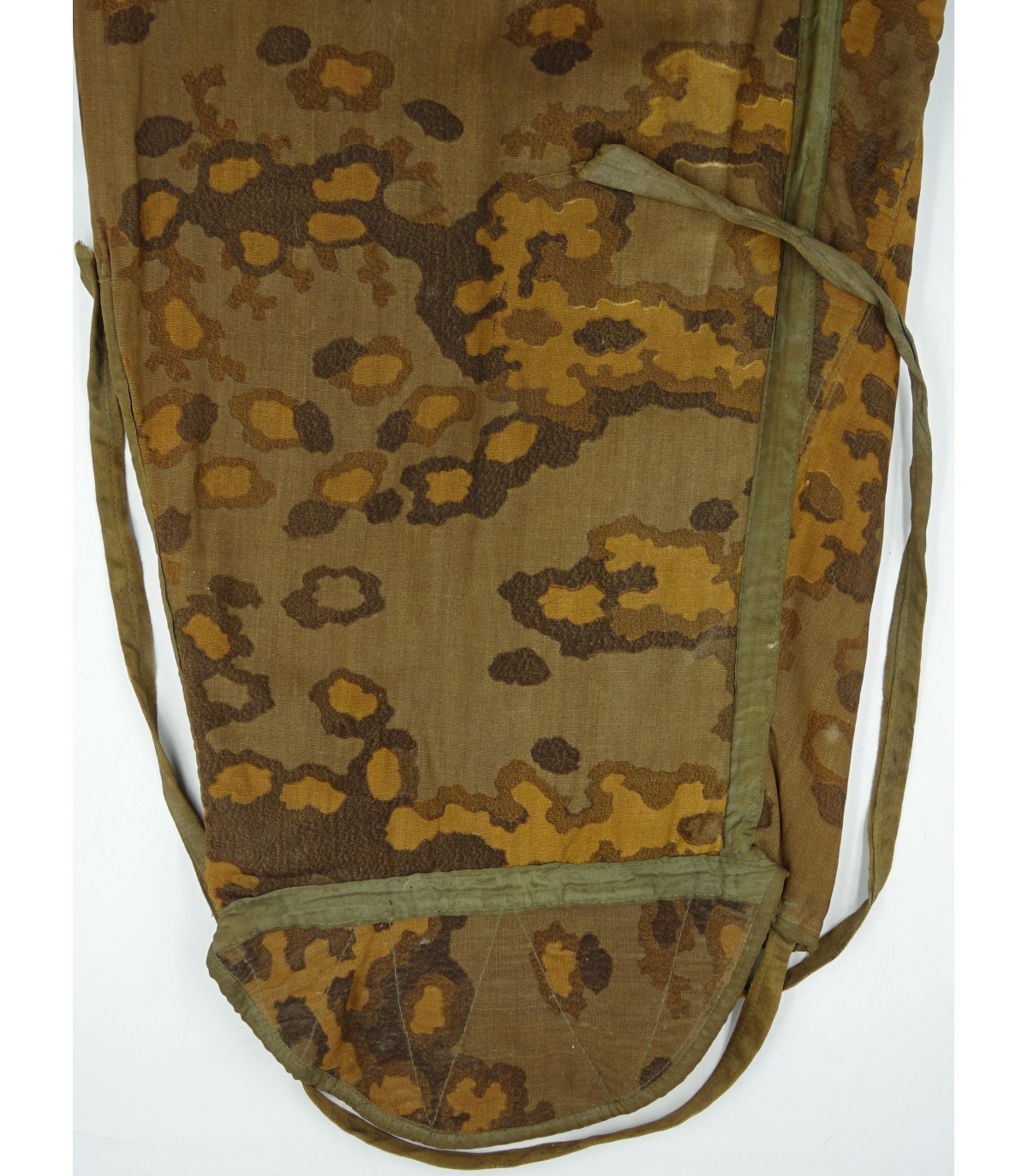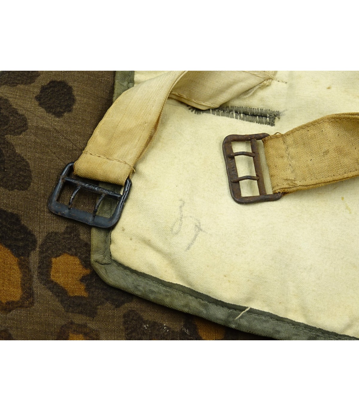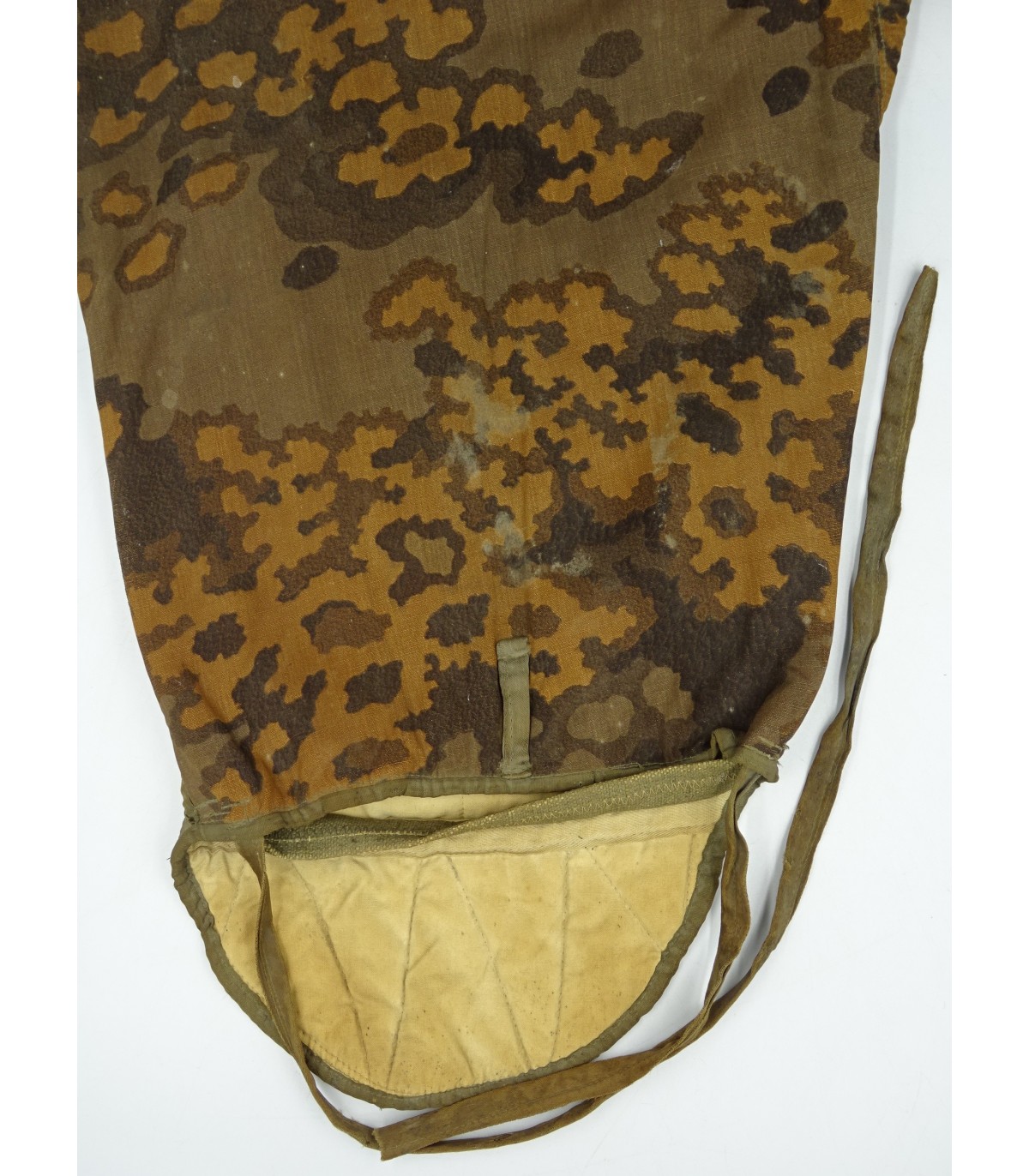 Camouflage feuilles de chêne, réversible blanc. Pour la parka verte à 4 poches, il avait été conçu un pantalon assorti, extremement rare, reconnaissable à ses couvre-pieds. Le pantalon camouflé que nous présentons est coupé sur le même modèle et se distingue des fabrications finalement adoptées par l'absence de poches et de braguette ainsi qu'à la présence des couvre-pieds. Peu porté, on peut imaginer que comme dans toutes les armées, la Waffen-SS a mis une petite série en dotation dans une unité avant de décider de l'adoption. Couleurs splendides. Pièce de musée.