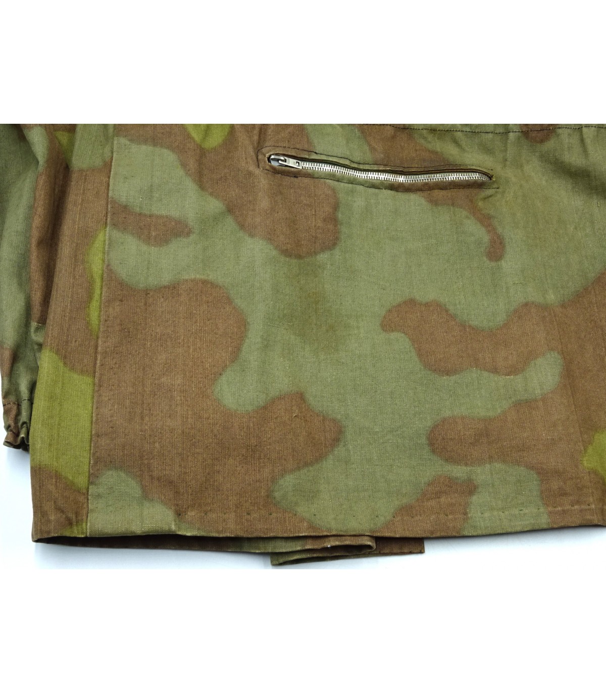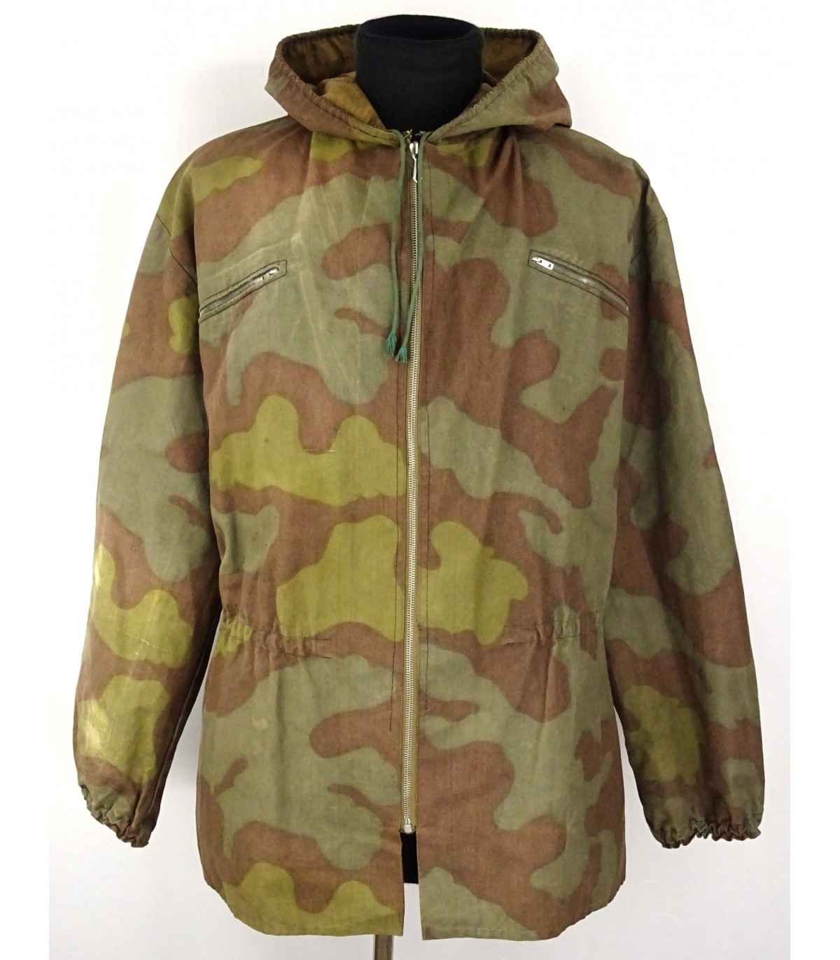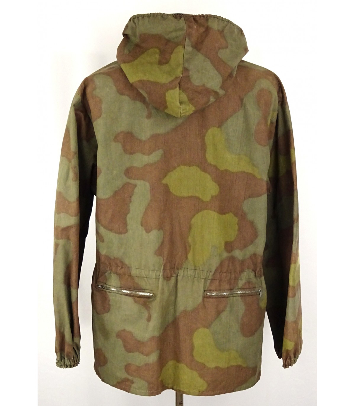 Toile camouflée italienne. Capuche incorporée. Fermeture à glissière Wico. 2 poches de poitrine et 2 poches de fesses, sur le schéma de la Windbluse de dotation. Largeur des épaules 50cm. Excellente fabrication de front en BE-TBE.