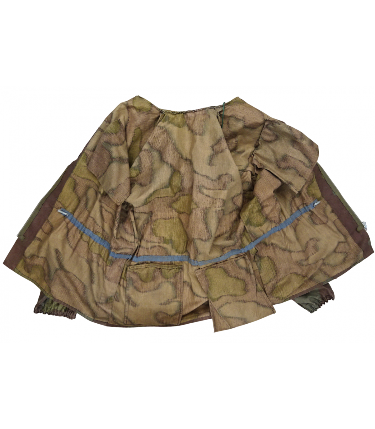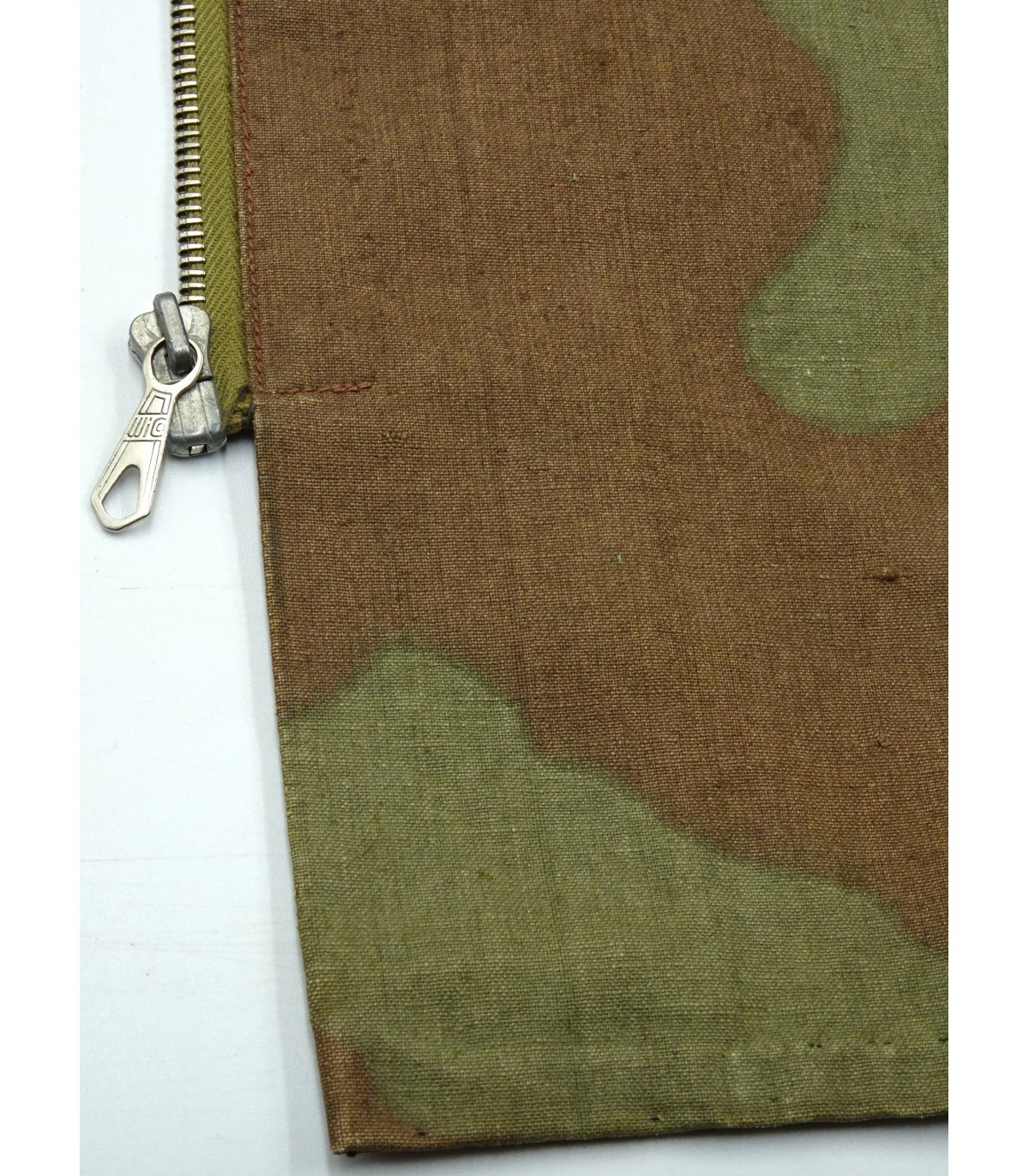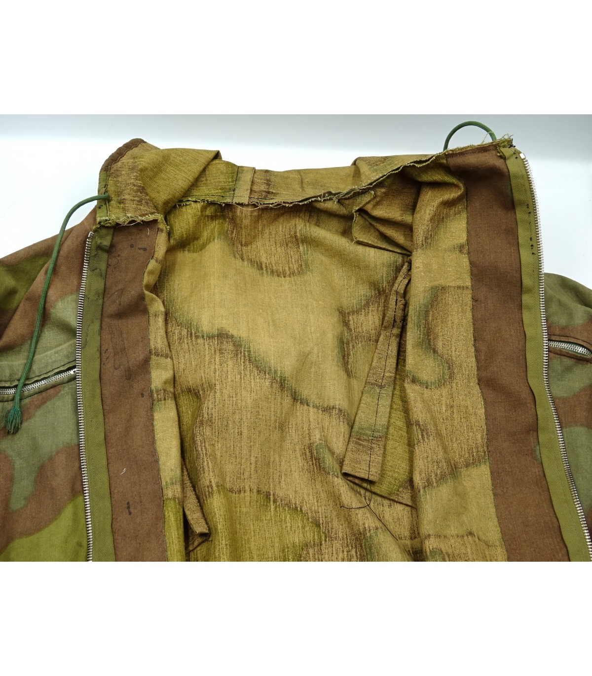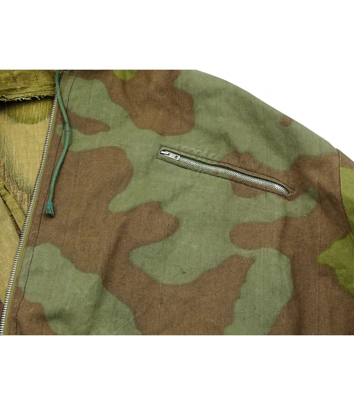 Toile camouflée italienne. Capuche incorporée. Fermeture à glissière Wico. 2 poches de poitrine et 2 poches de fesses, sur le schéma de la Windbluse de dotation. Largeur des épaules 50cm. Excellente fabrication de front en BE-TBE.