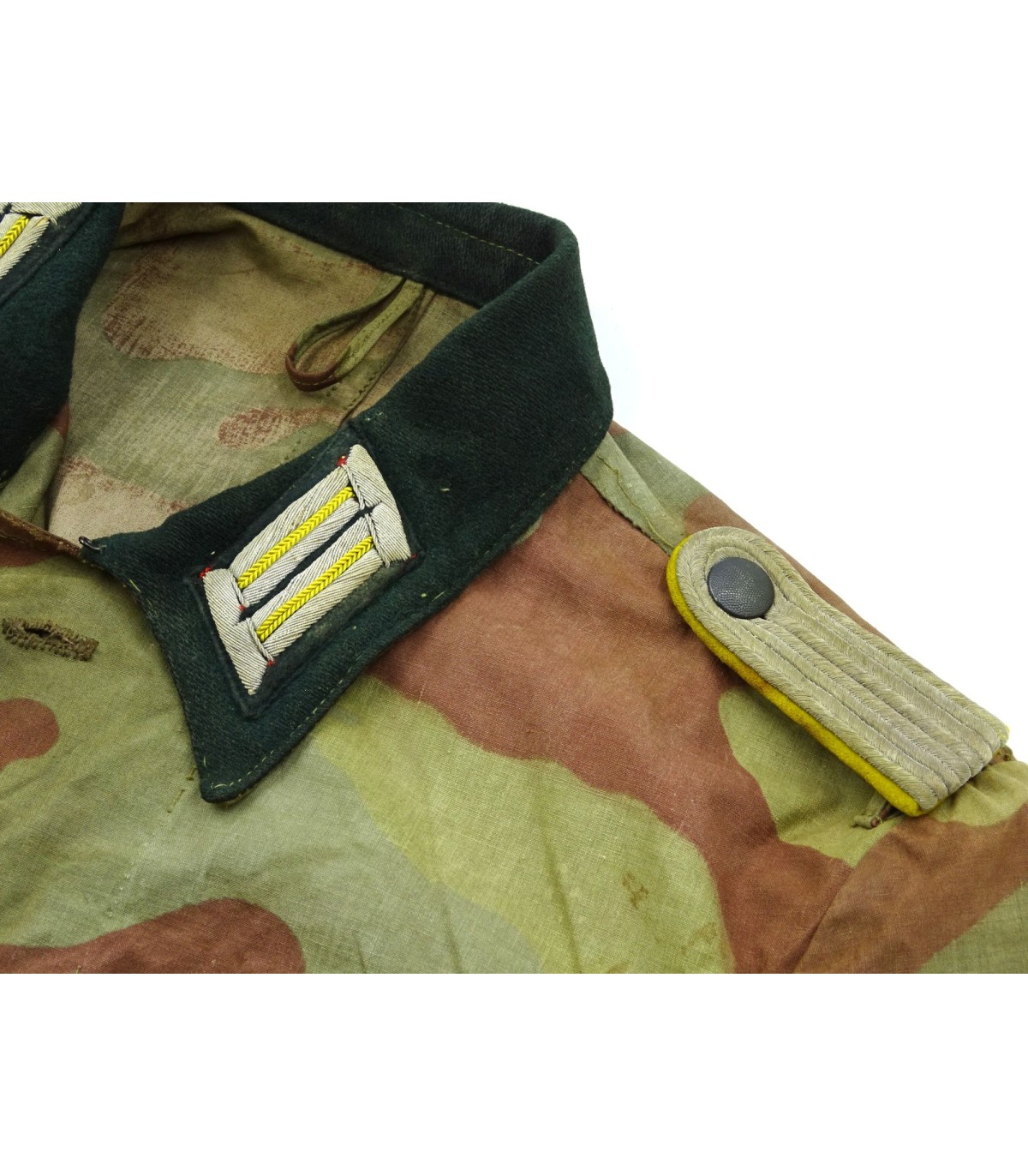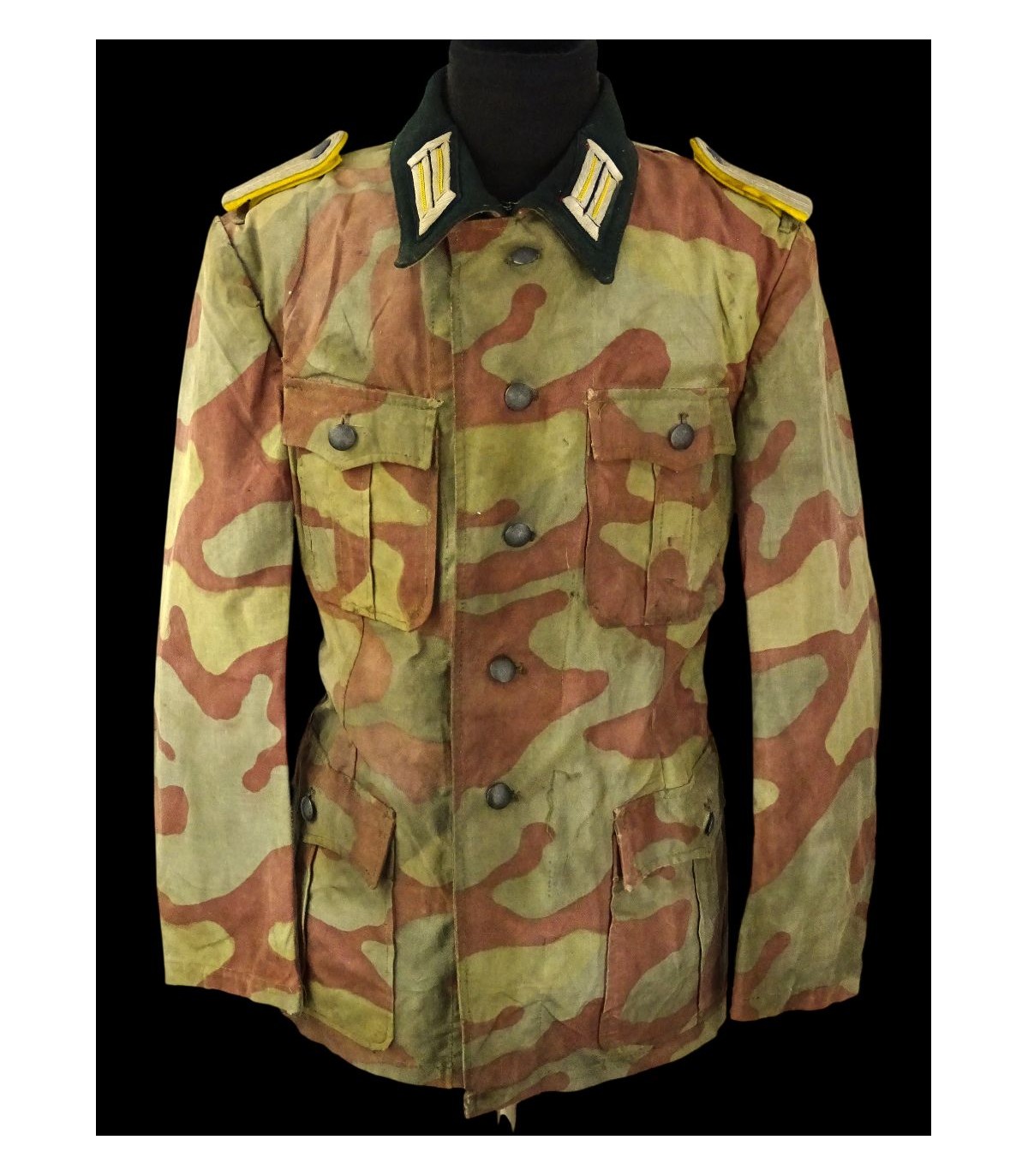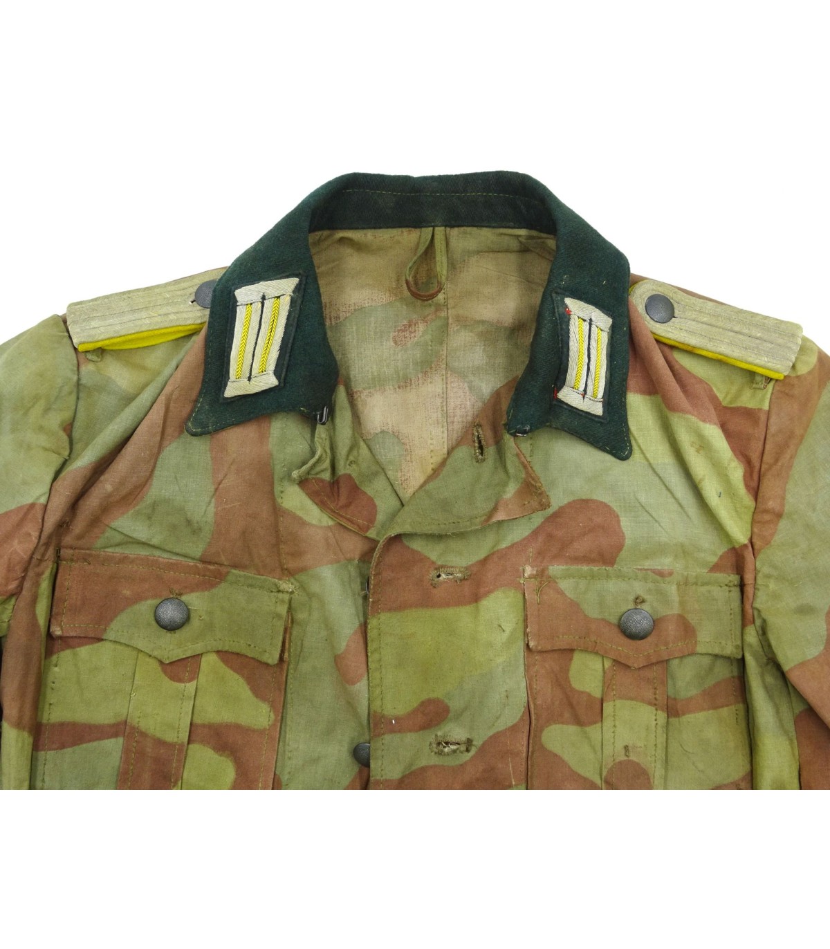 Veste 4 poches en toile camouflée italienne de fabrication de tailleur de compagnie, col vert-foncé, portant les pattes de col et pattes d'épaules d'un Leutnant WH des transmissions. Brides de décoration sur poche de poitrine gauche. On observe beaucoup de tenues en camouflage italien sur les photos des combats de Normandie. Rare. BE.