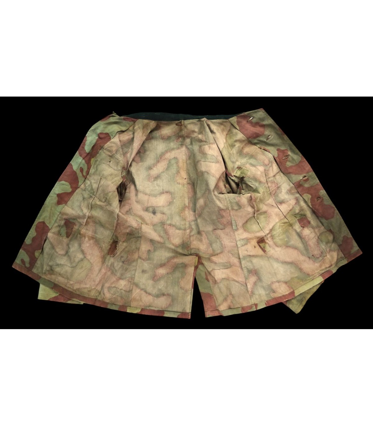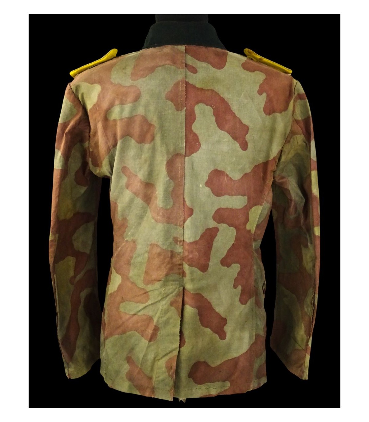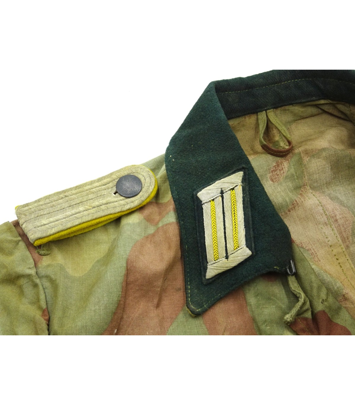Veste 4 poches en toile camouflée italienne de fabrication de tailleur de compagnie, col vert-foncé, portant les pattes de col et pattes d'épaules d'un Leutnant WH des transmissions. Brides de décoration sur poche de poitrine gauche. On observe beaucoup de tenues en camouflage italien sur les photos des combats de Normandie. Rare. BE.