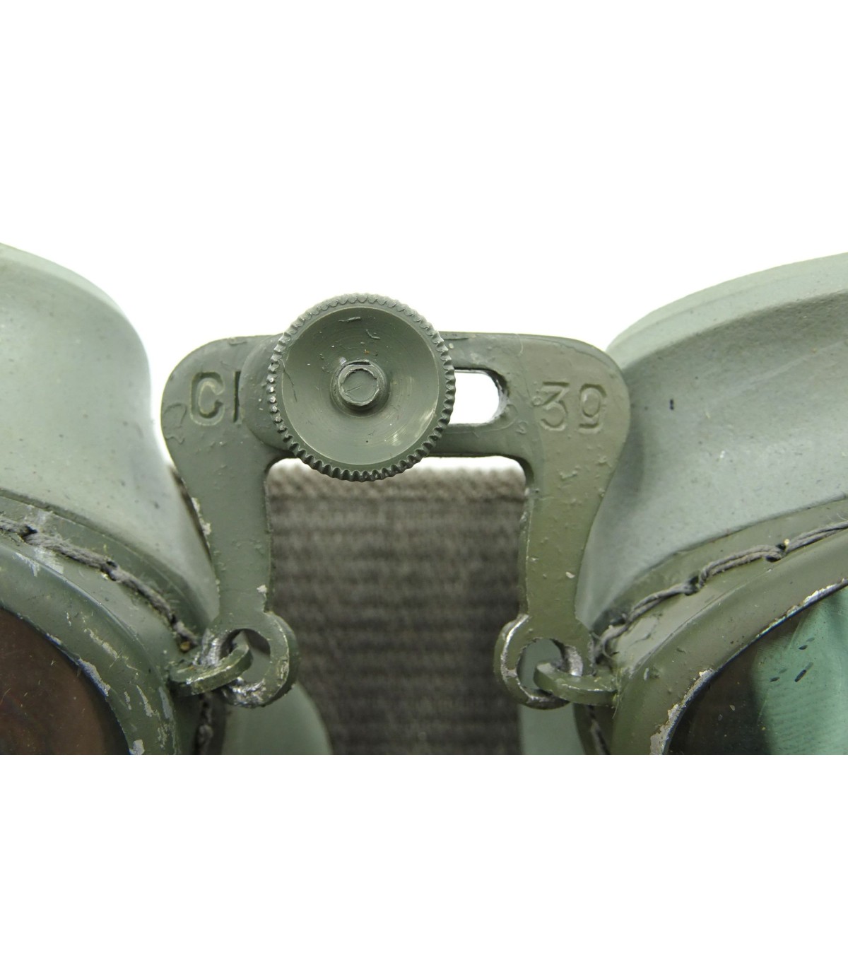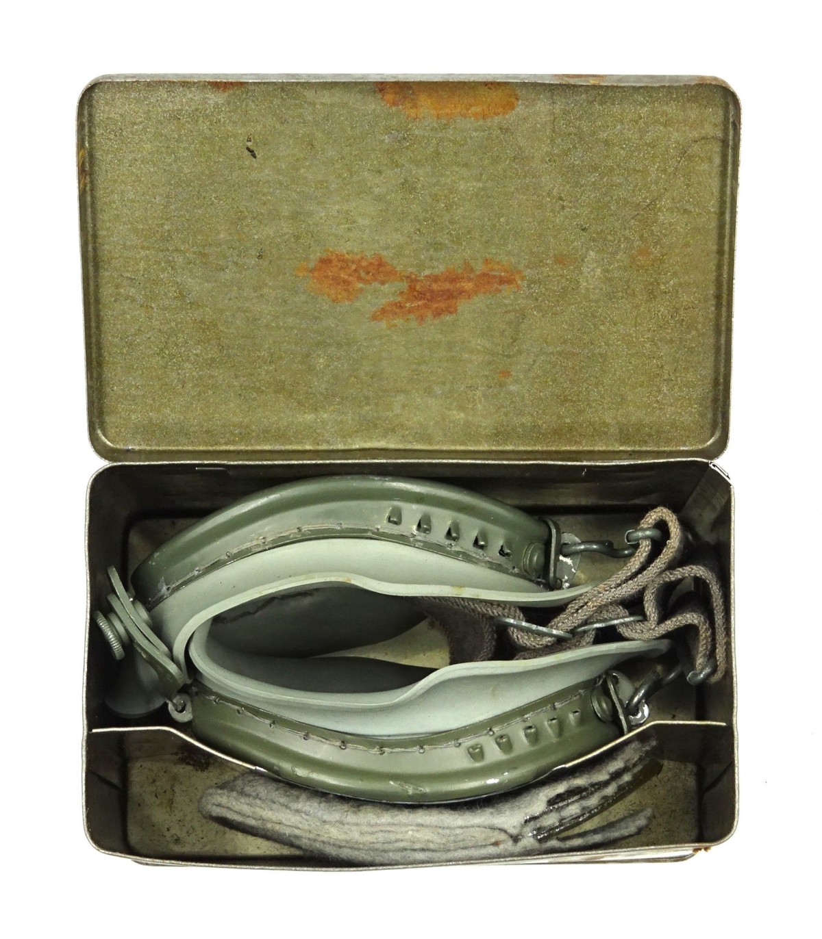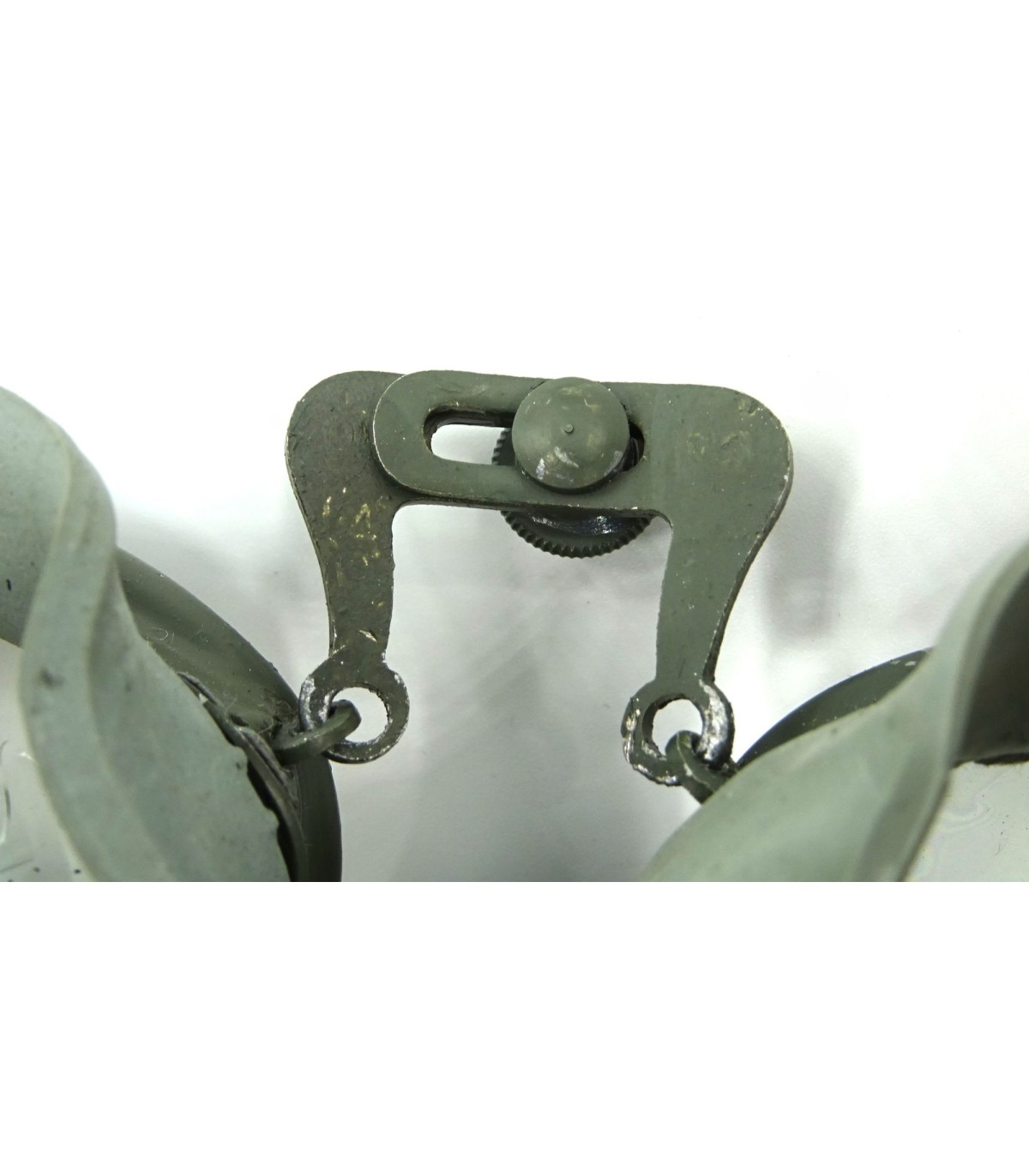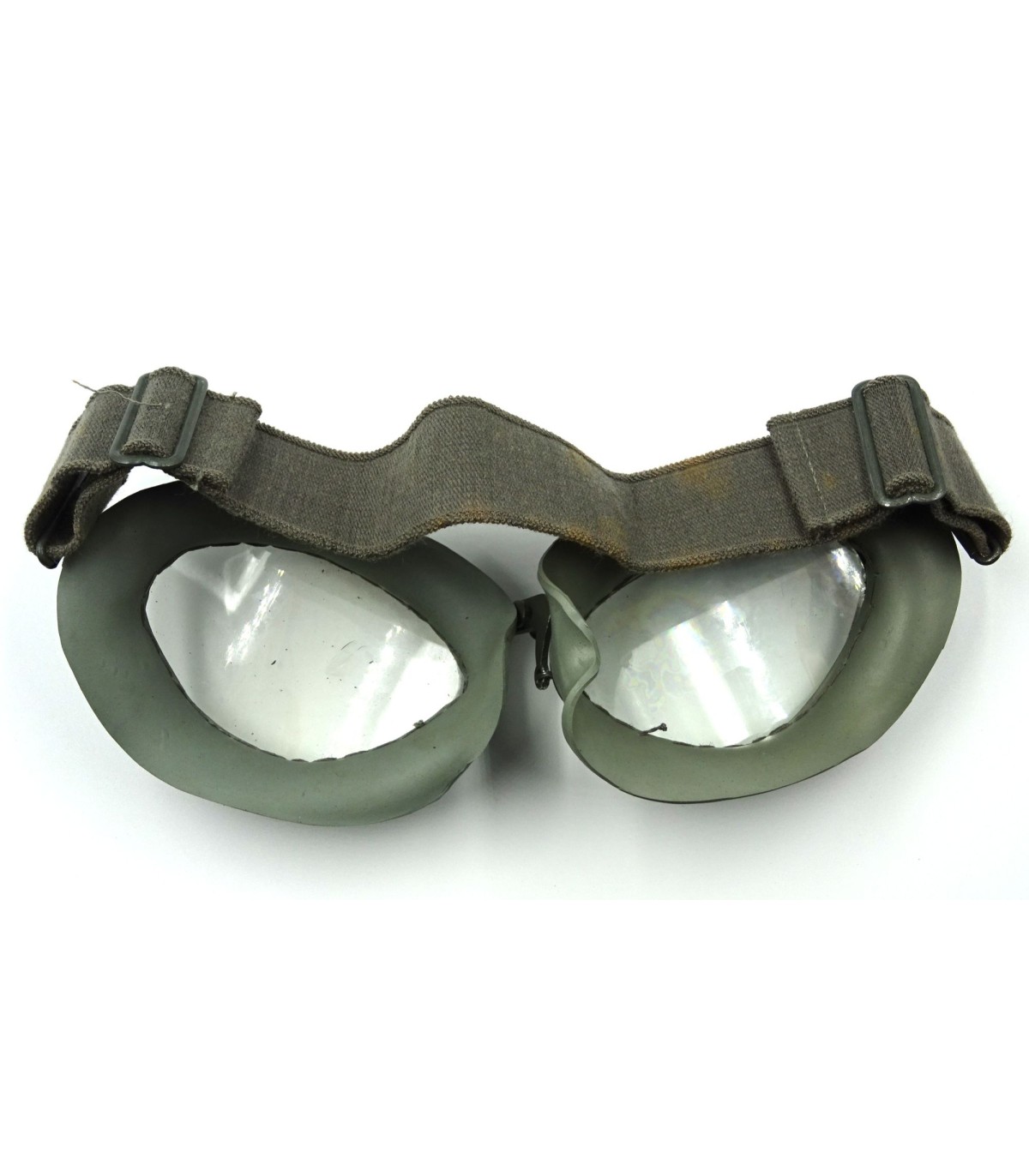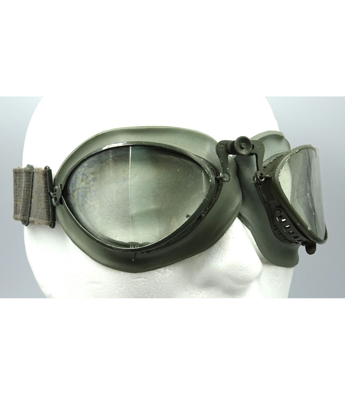Lunettes de motard WH, tour caoutchouc feldgrau, cadre alu peint feldgrau, molette centrale de réglage, marquage GS 39. Dans leur boitier tôle d'origine, contenant une paire de verre de rechange feuilleté dans étui feutre. Etat exceptionnel.