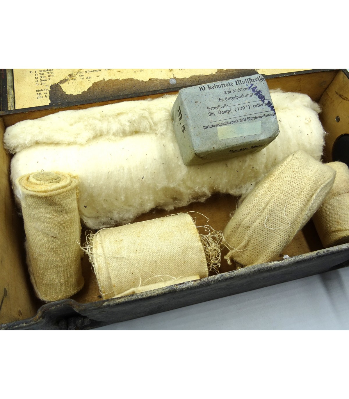 Contient 6 éléments de secours aux blessés, bande et gaze. ABE.