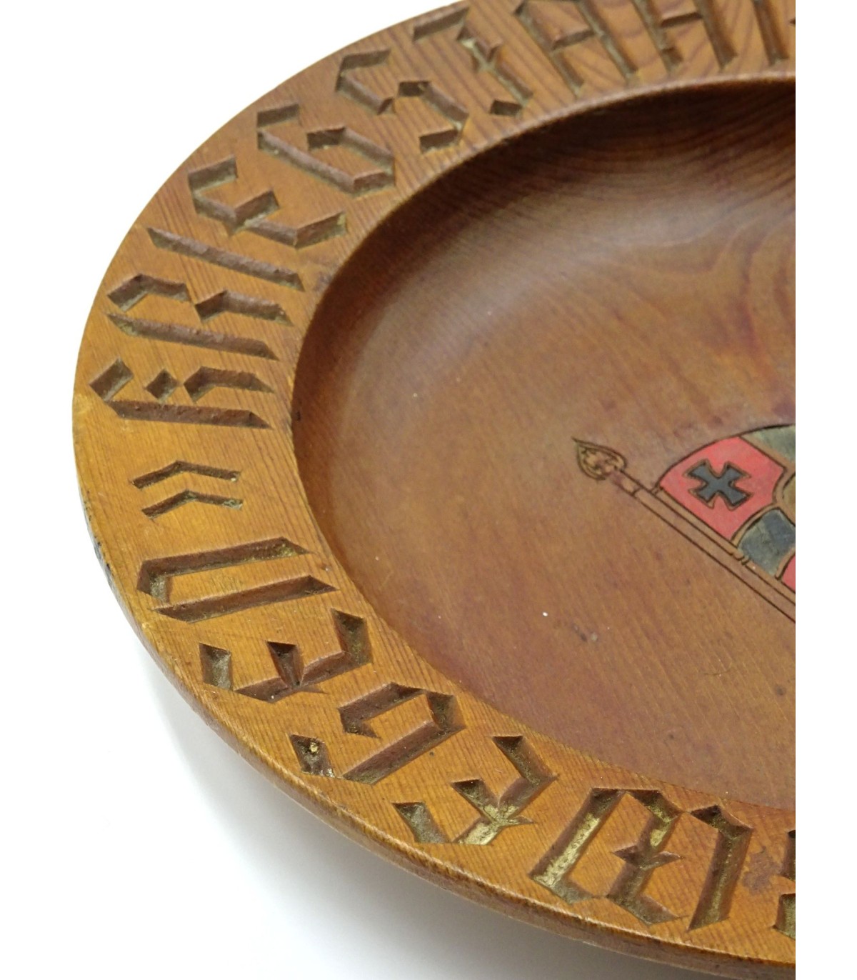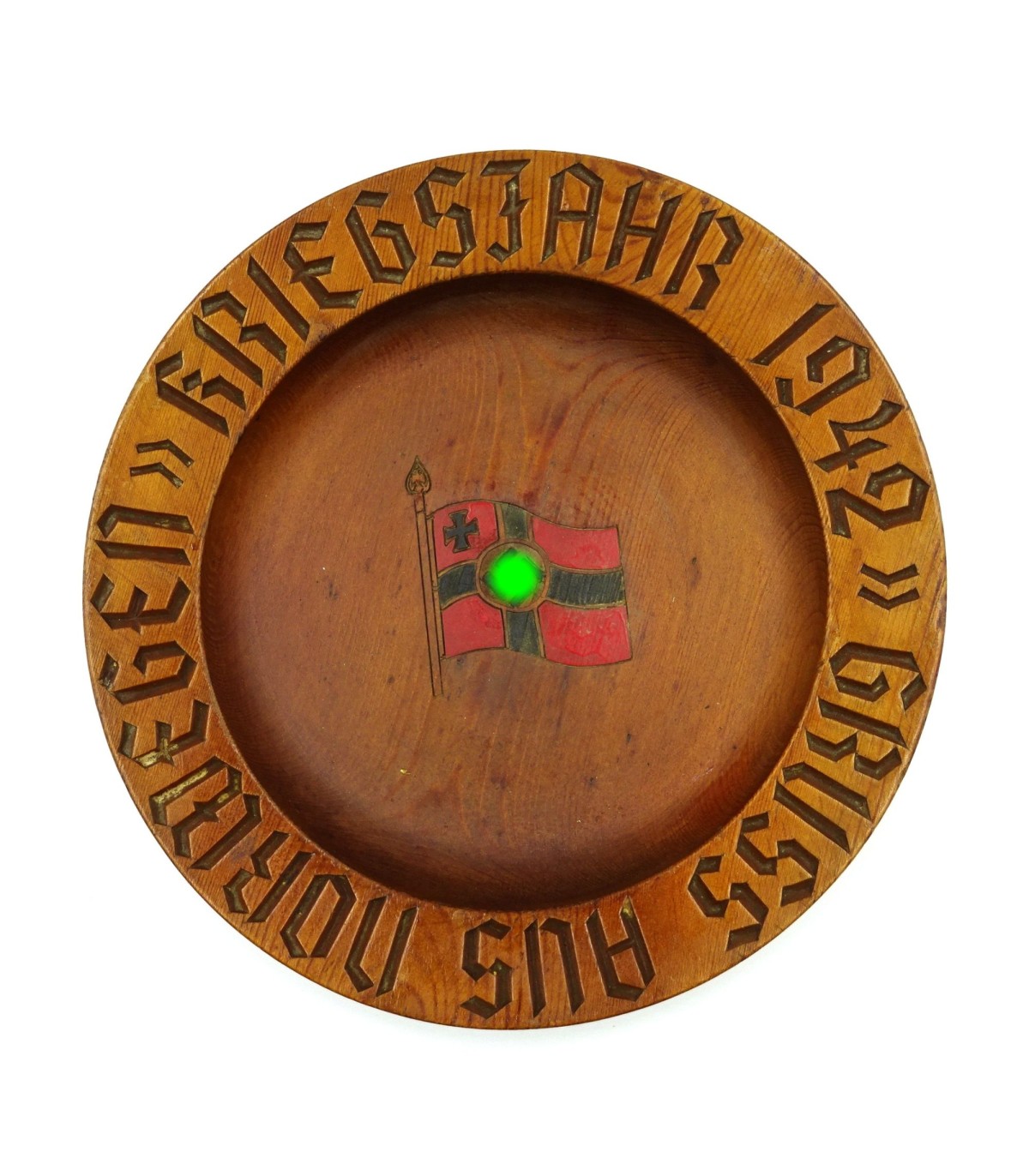 Bois. Inscription 'Gruss aus Norwegen - Kriegsjahr 1942'. Flamme de guerre au fond. Diamètre 22cm. Très beau travail, probablement en lien avec les troupes de montagne. Superbe. TBE.