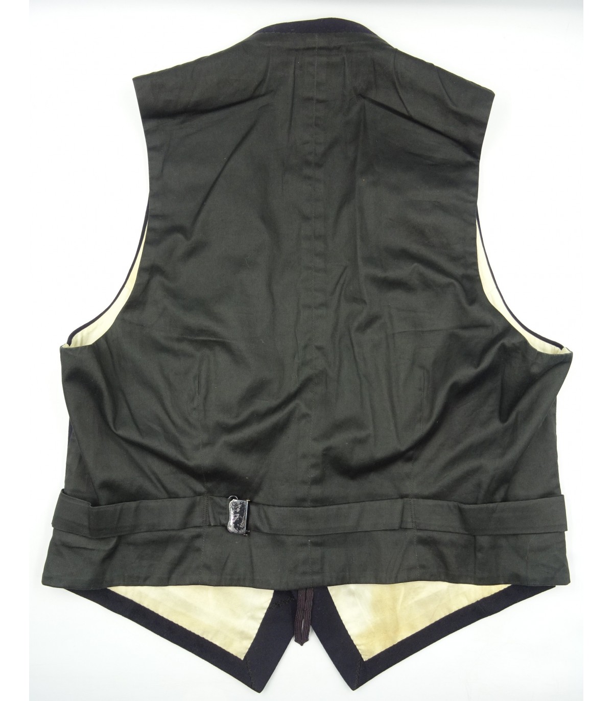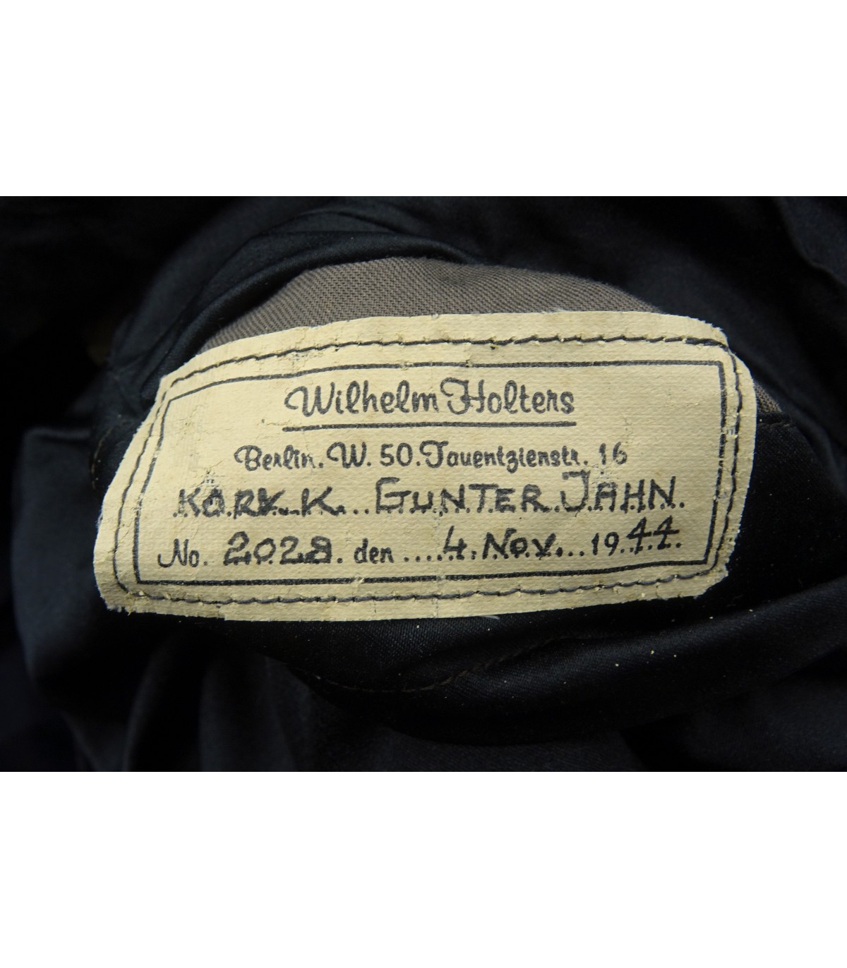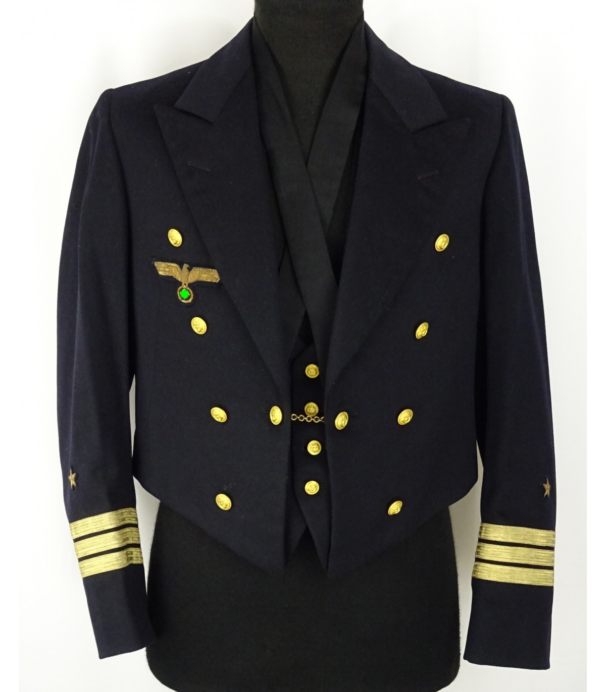 Tenue de soirée comprenant: spencer avec 3 galons de manche or, aigle de poitrine brodé main or sur fond bleu, étiquette nominative du célèbre tailleur militaire de Berlin Holters, datée de 1944. Gilet assorti et noeud papillon. On rappelle que G. Jahn était titulaire de la croix de chevalier et qu'il a commandé la 29e U-Flottille. Rarissime ensemble, digne d'un musée, et en TBE. Sur la carrière de G.Jahn, voir : https://en.wikipedia.org/wiki/Gunter_Jahn