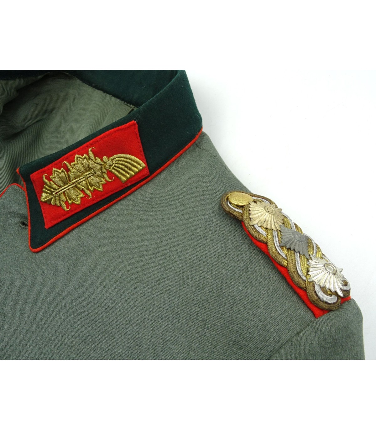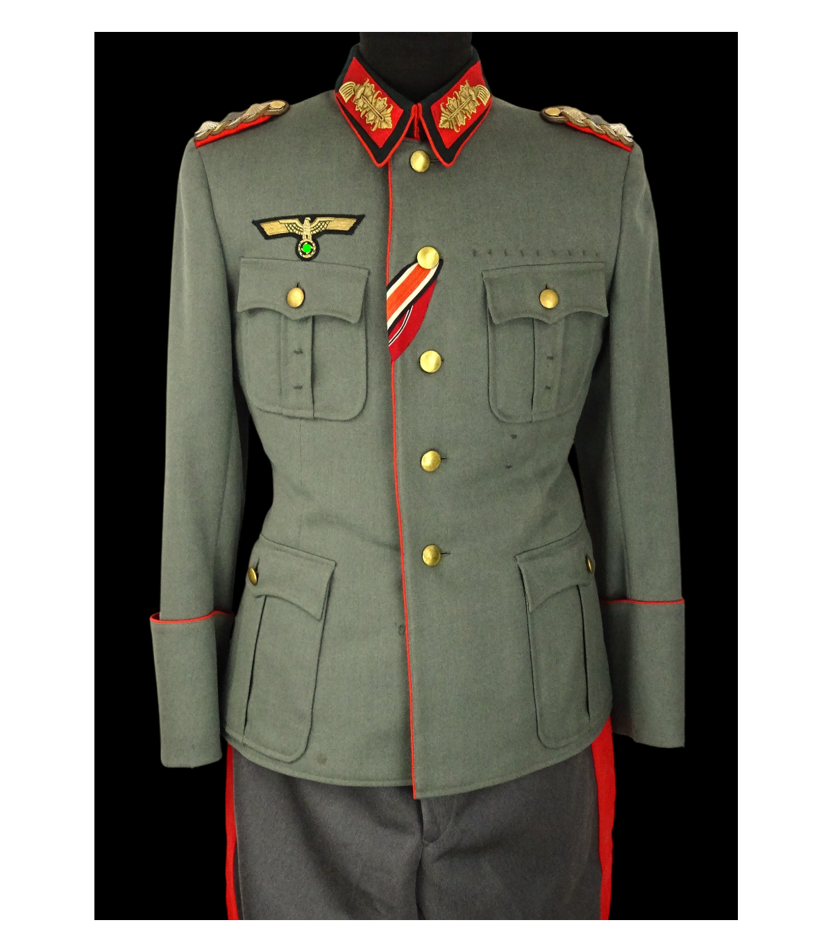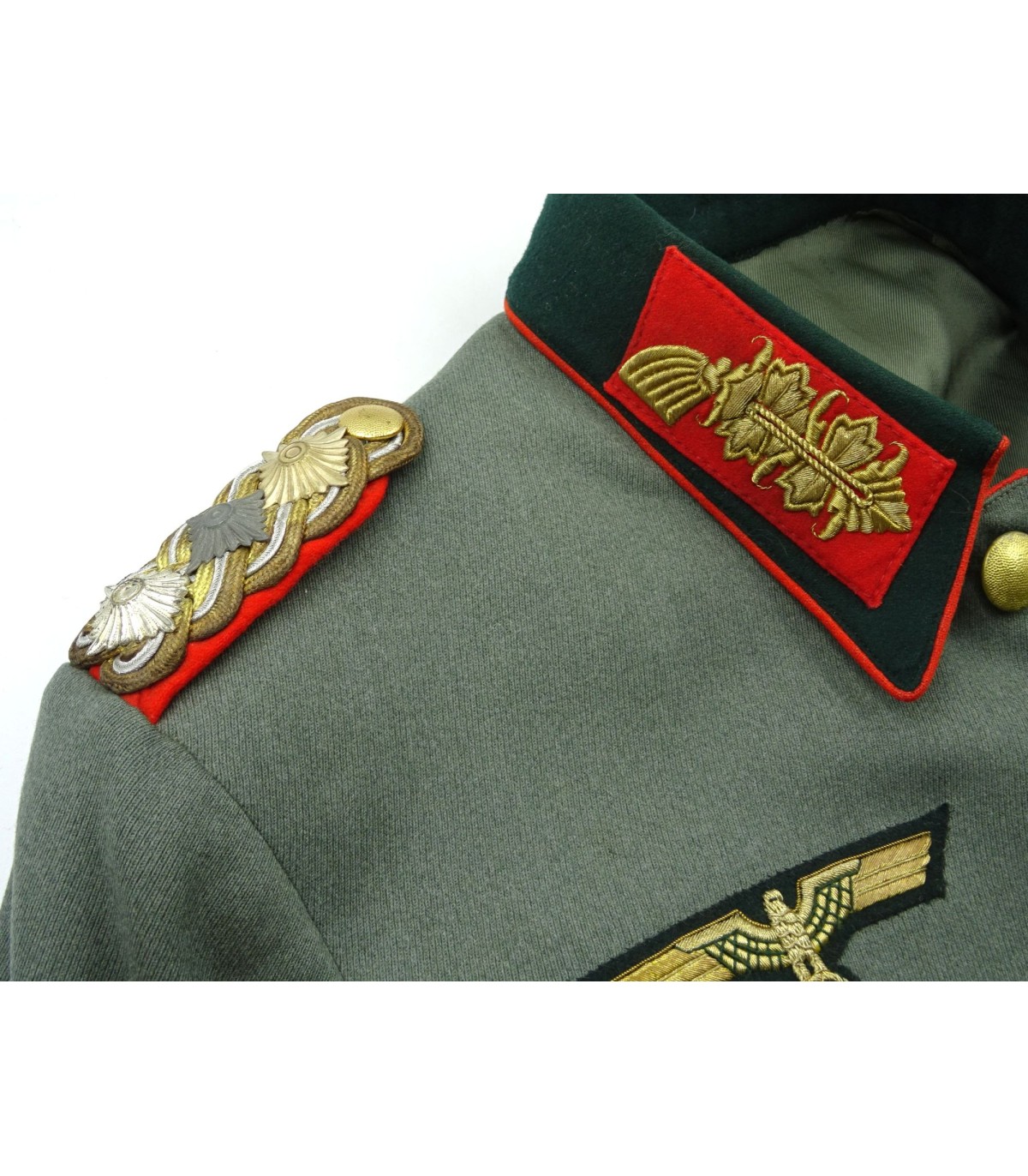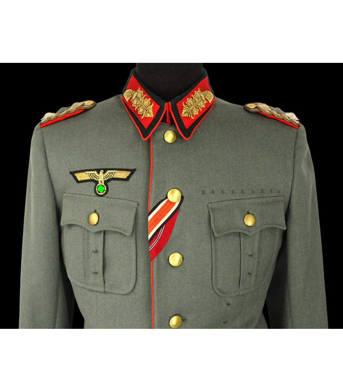 Uniforme de Generaloberst de la Wehrmacht ayant appartenu au général des Panzers Erhard Raus, titulaire de la Croix de chevalier avec feuilles de chêne et de la Croix allemande en or (dont la casquette et la dague sont en vente sous les références respectives HB001 et ES245). Comporte: vareuse en tricotine feldgrau avec étiquette nominative, col vert-foncé avec pattes de col Larisch Stickerei or sur fond rouge, passepoil rouge du col et du devant, pattes d'épaules de général avec 3 étoiles de grade, aigle de poitrine brodé main en fil or, nombreuses brides de décorations dont celles de la croix allemande, boutons or marqués Extra Fein, ruban de la croix de fer de 2e classe et de la médaille du front de l'Est. BE. Avec culotte de cheval en tricotine gris-pierre à bandes rouges. L'ensemble de cette tenue était présenté au AAF Tank Museum de Danville VA. USA jusqu'à sa fermeture en 2022. Pour la biographie du Generaloberst E.Raus, voir: https://fr.wikipedia.org/wiki/Erhard_Raus