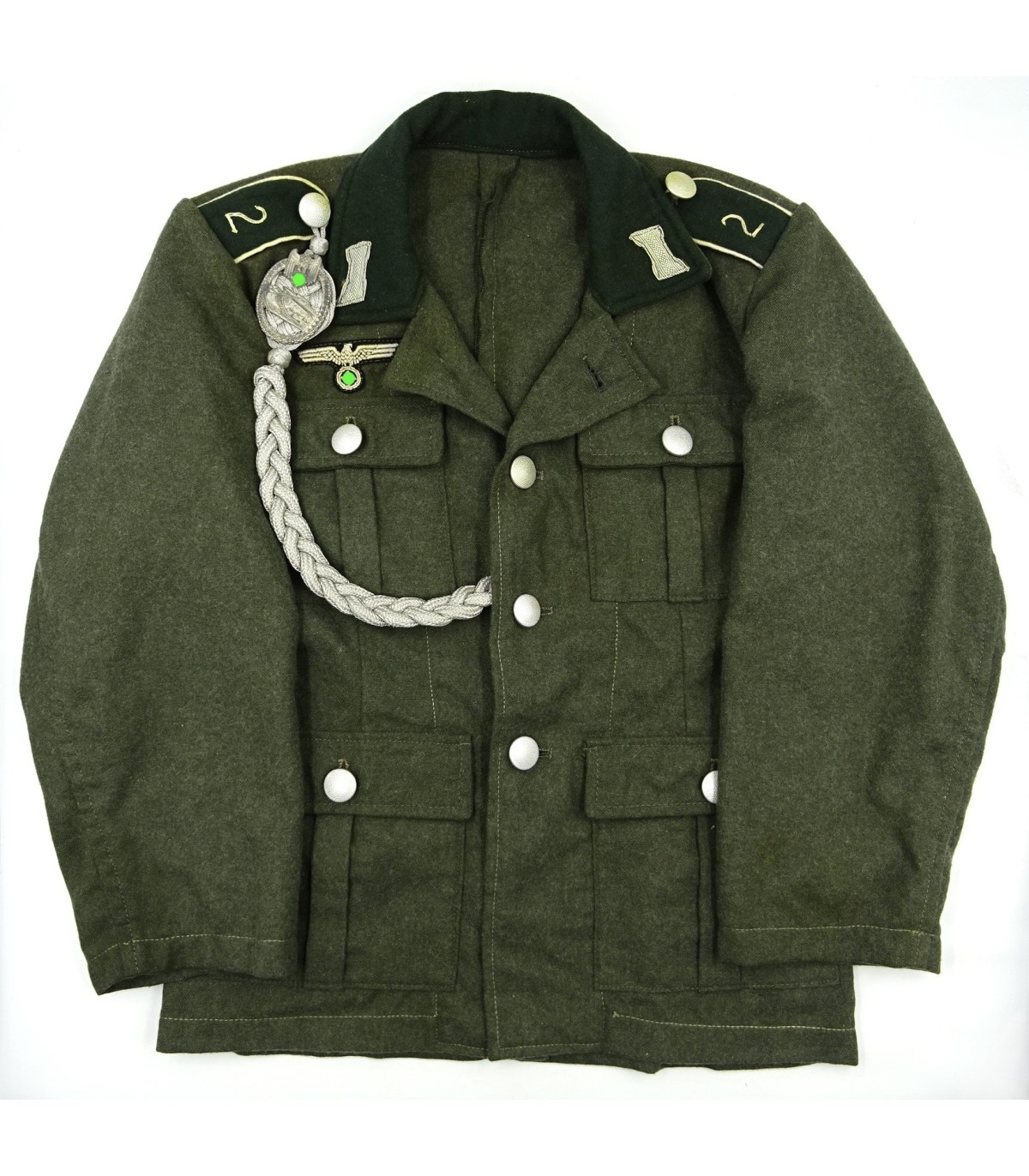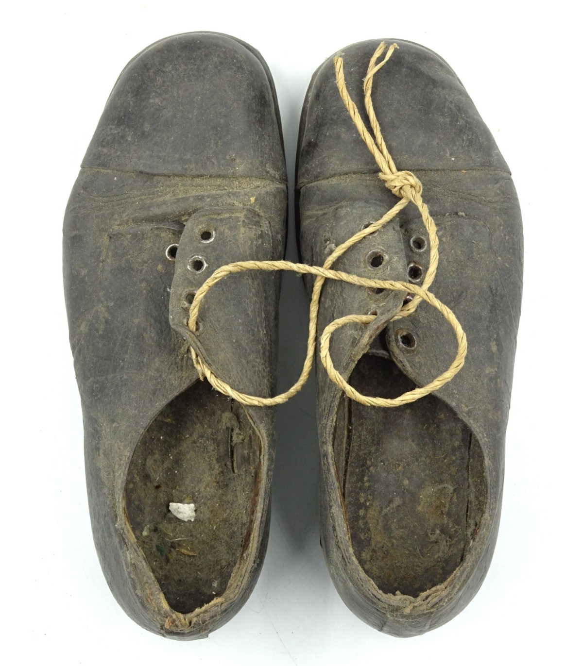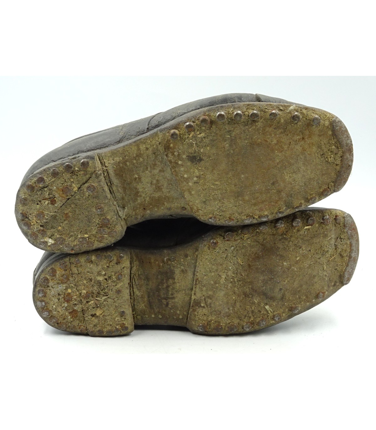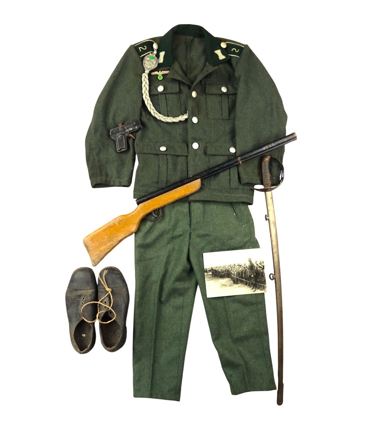 Comprend: vareuse de panoplie d'enfant sur la modèle de la veste M36 de la Heer. Col vert-foncé. Pattes de col, pattes d'épaules d'infanterie, aigle de poitrine et cordon de tireur + pantalon droit assorti. Tissu feldgrau léger, col vert-foncé. Taille enfant 6-8 ans. Chaussures cloutées. Petit fusil, sabre et pistolet. Joint une photo d'archives format 16x12 illustrant le port de panoplies de soldats par des enfants (Allemagne 1934). TBE.