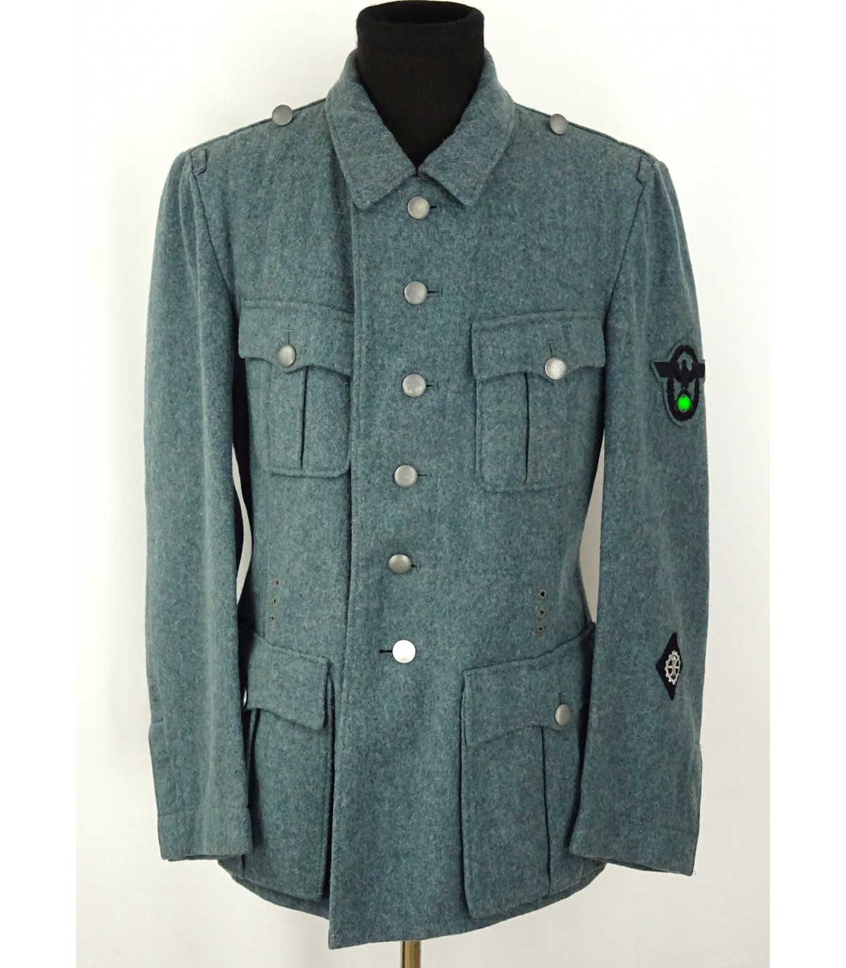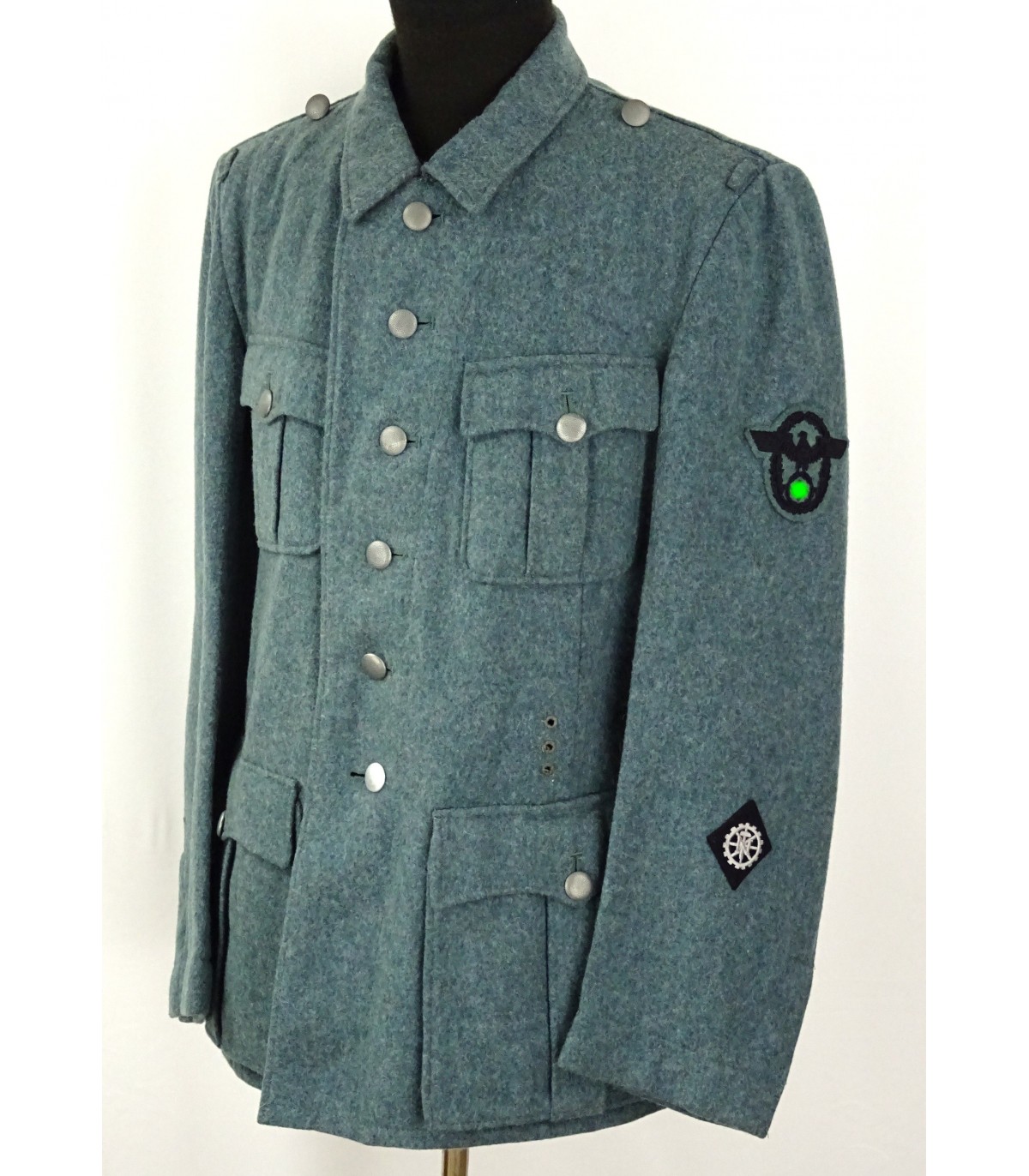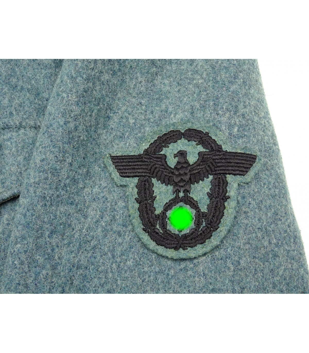 Drap police. Coupée sur le modèle de la vareuse Mle 40 de la Heer. Rarissime aigle de bras police brodé machine en fil noir (piqué d'origine). Insigne de manche du Teno. Marquage de réception du Teno. Taille 50. Corps de prévôté du Technisches Nothilfe. Pièce de musée en état exceptionnel.
