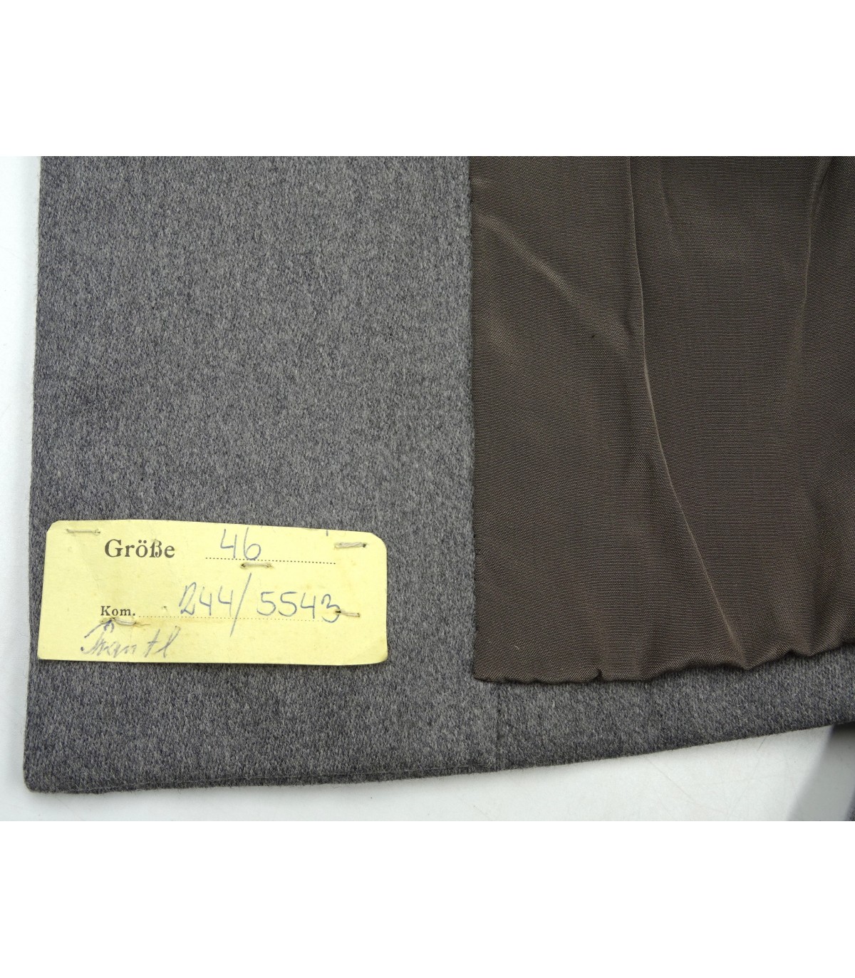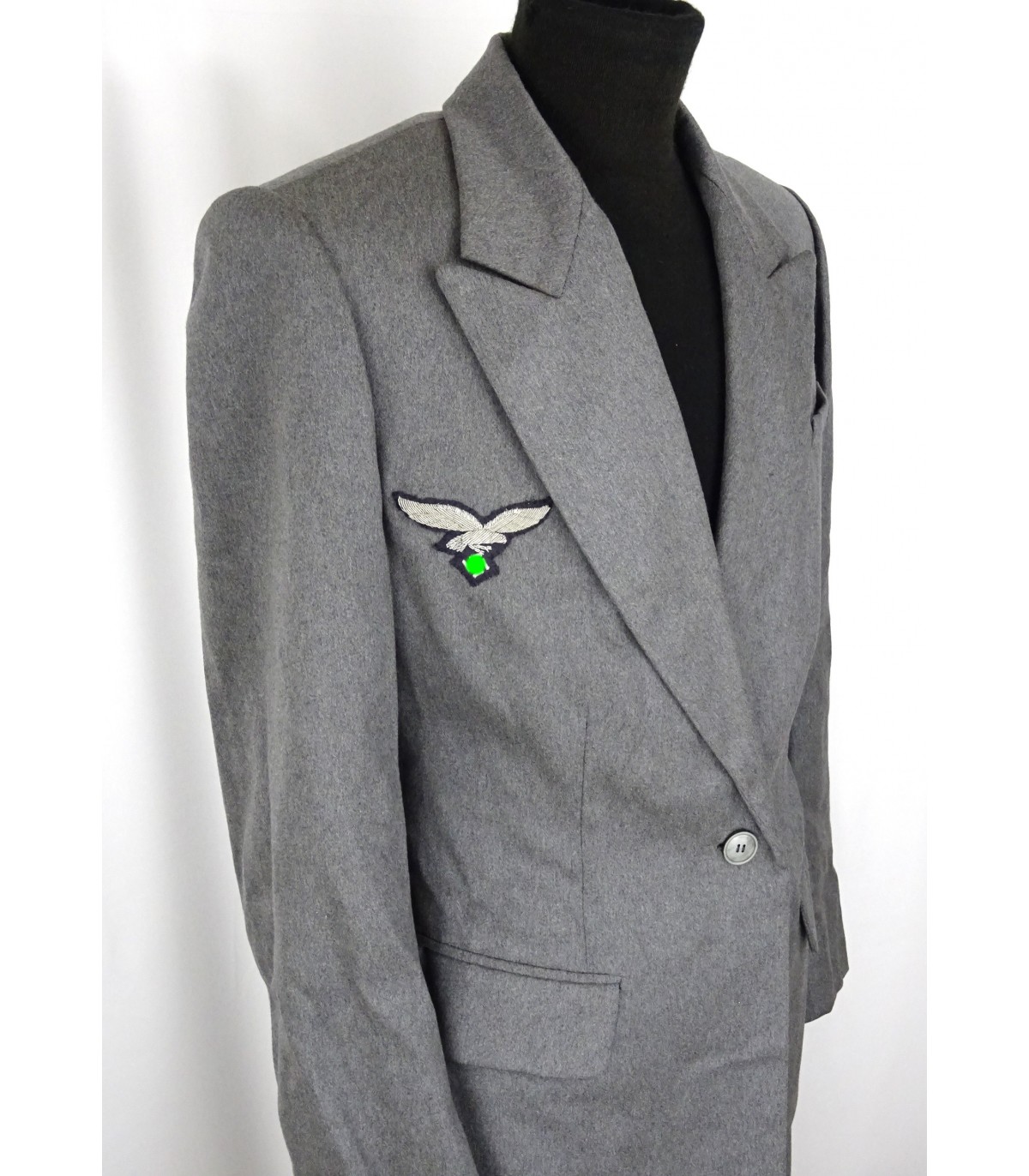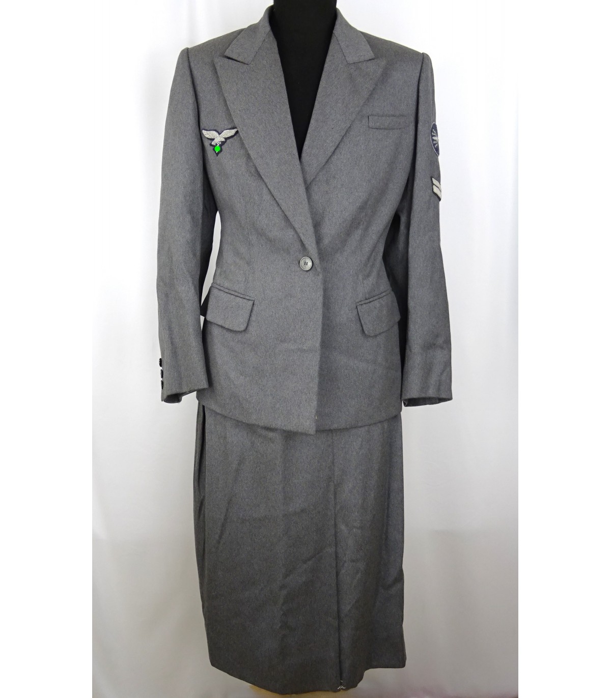 Veste de coupe spécifique, superbe aigle de poitrine brodé main. Insigne de manche des transmissions et chevron de grade de Luftnachrichten-Flugmelde-Oberhelferin (senior plane spotter auxiliary). Etiquette papier fabricant. Gabardine fine, doublure de satinette grise. avec jupe assortie. Très rare ensemble.