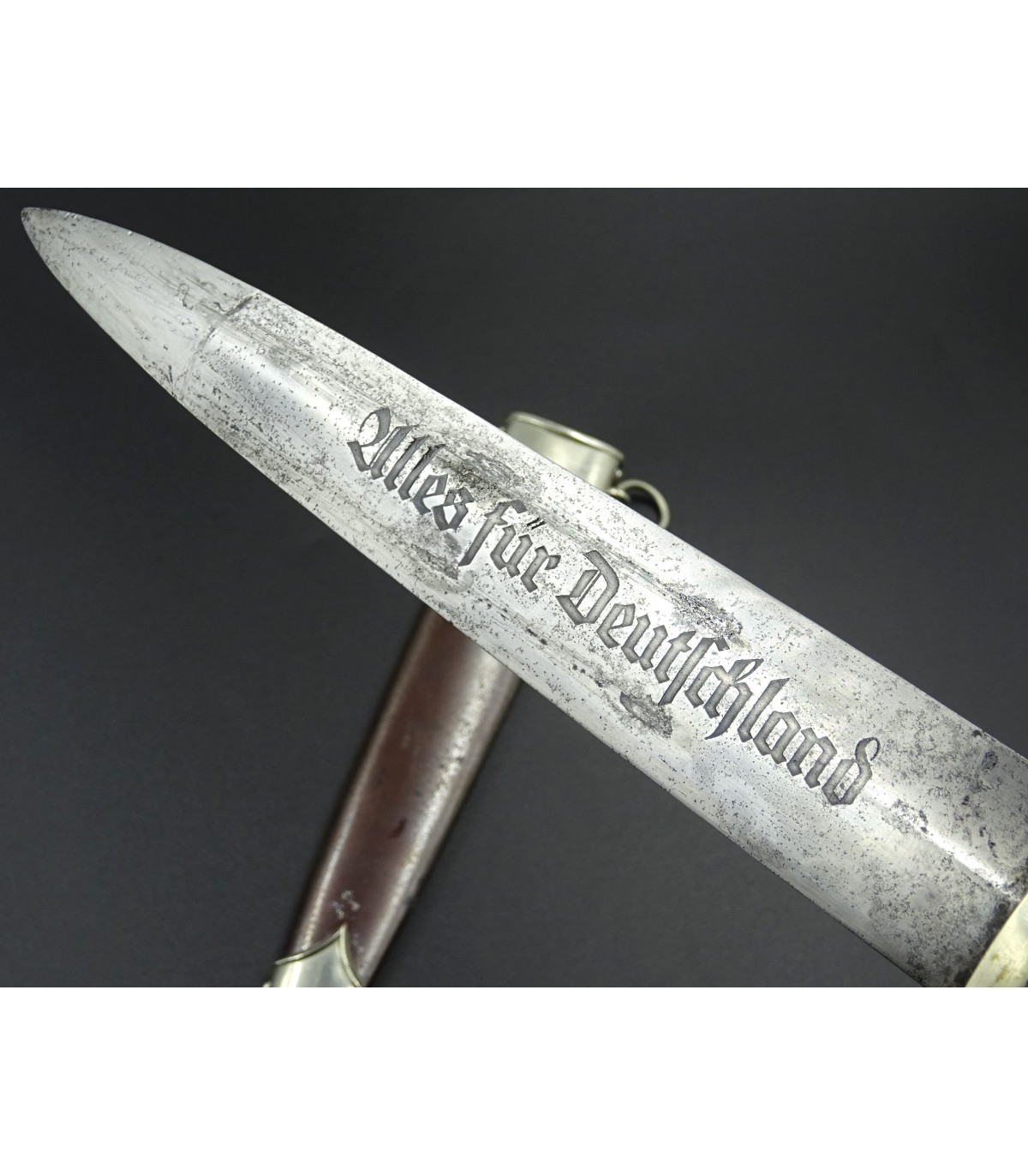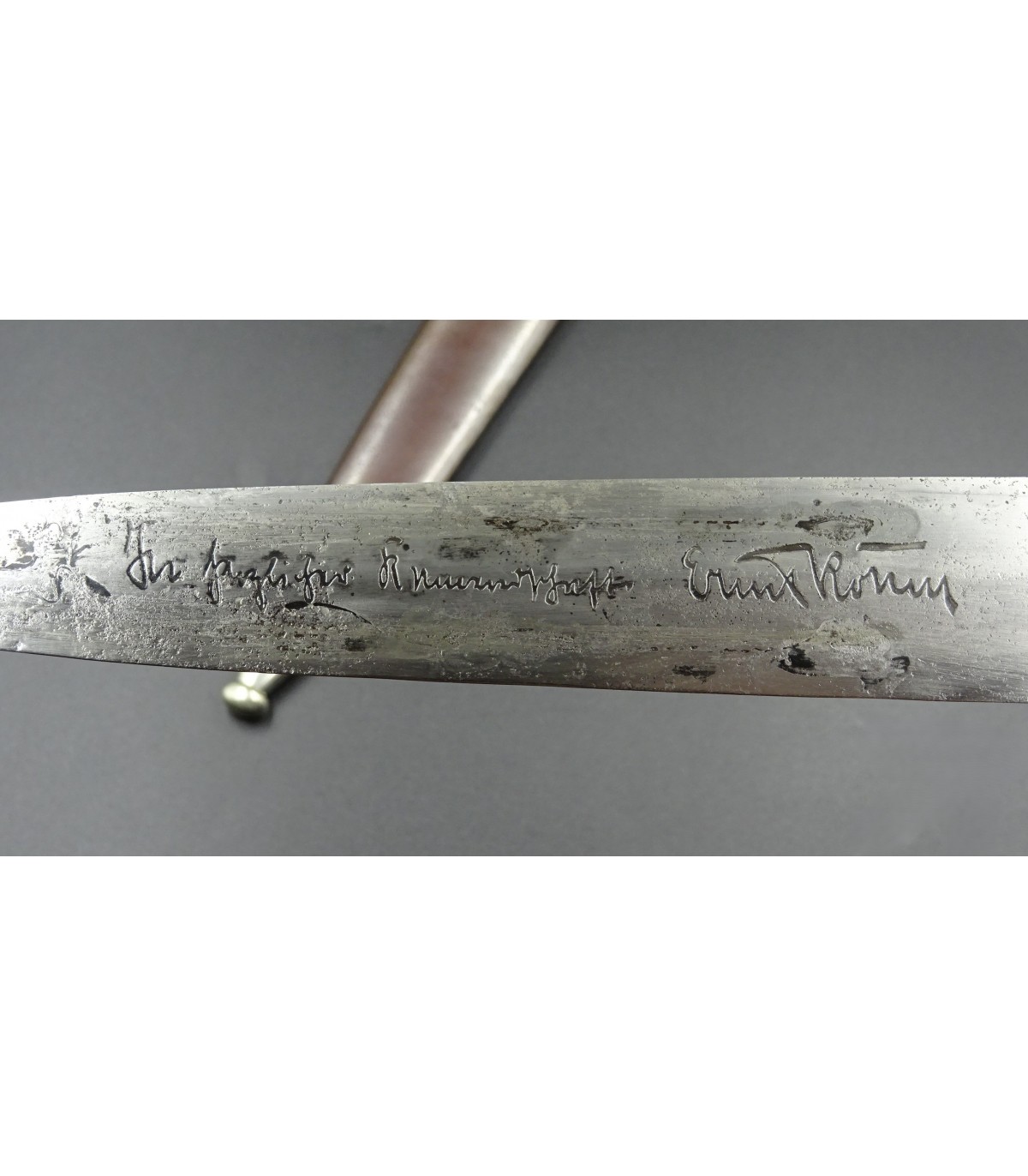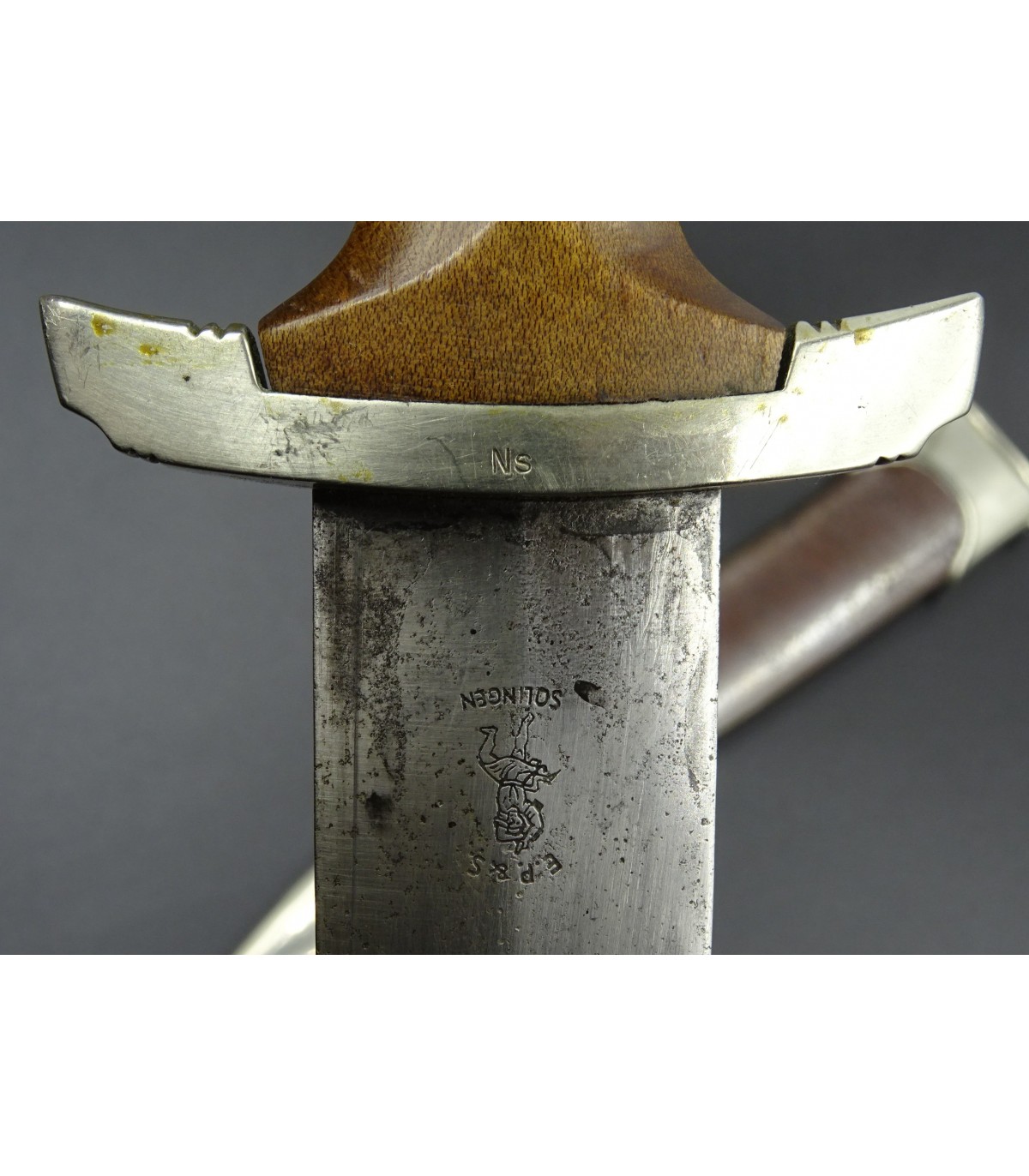 Nickel silver fitting. Gruppe Ns. Oxydation traces to the blade. Full Rm dedication (hard to find). Alles f Deutschland to the front of the blade. Average.
