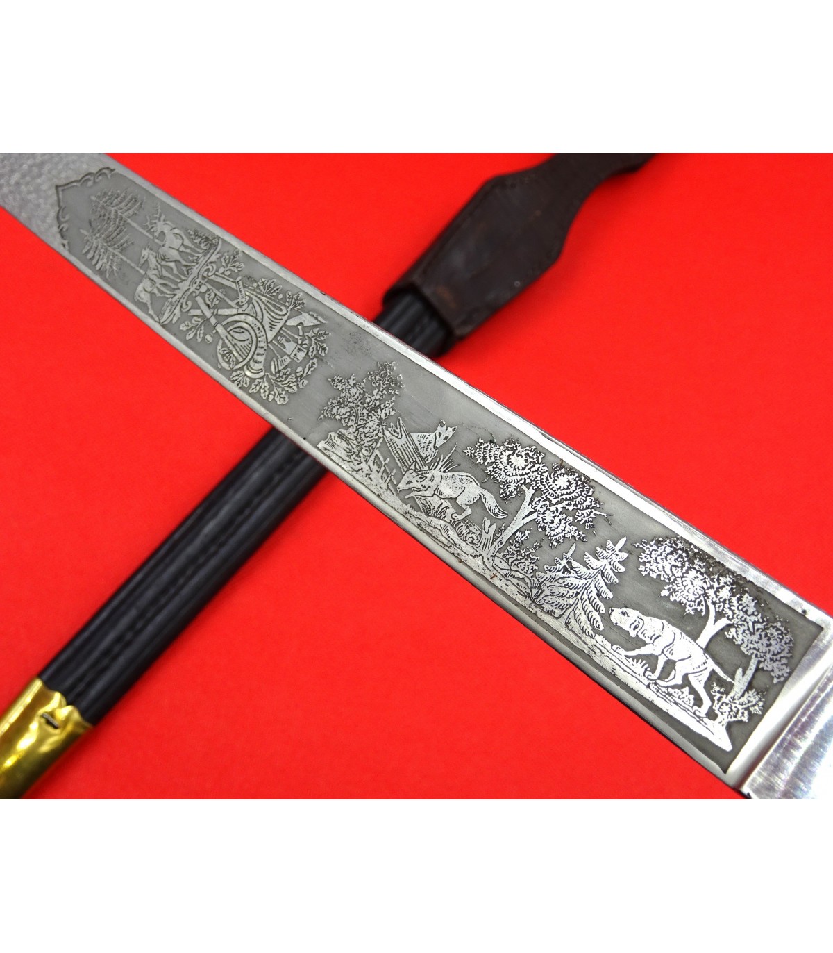Horn handle with LW eagle. Nice double engraved blade. Maker's logo. Named Samwer. Black leather scabbard. Brown frog. Very rare.