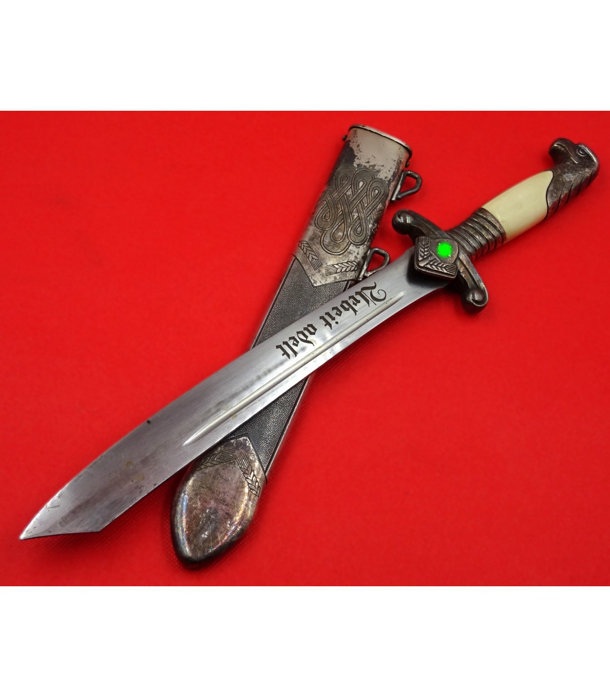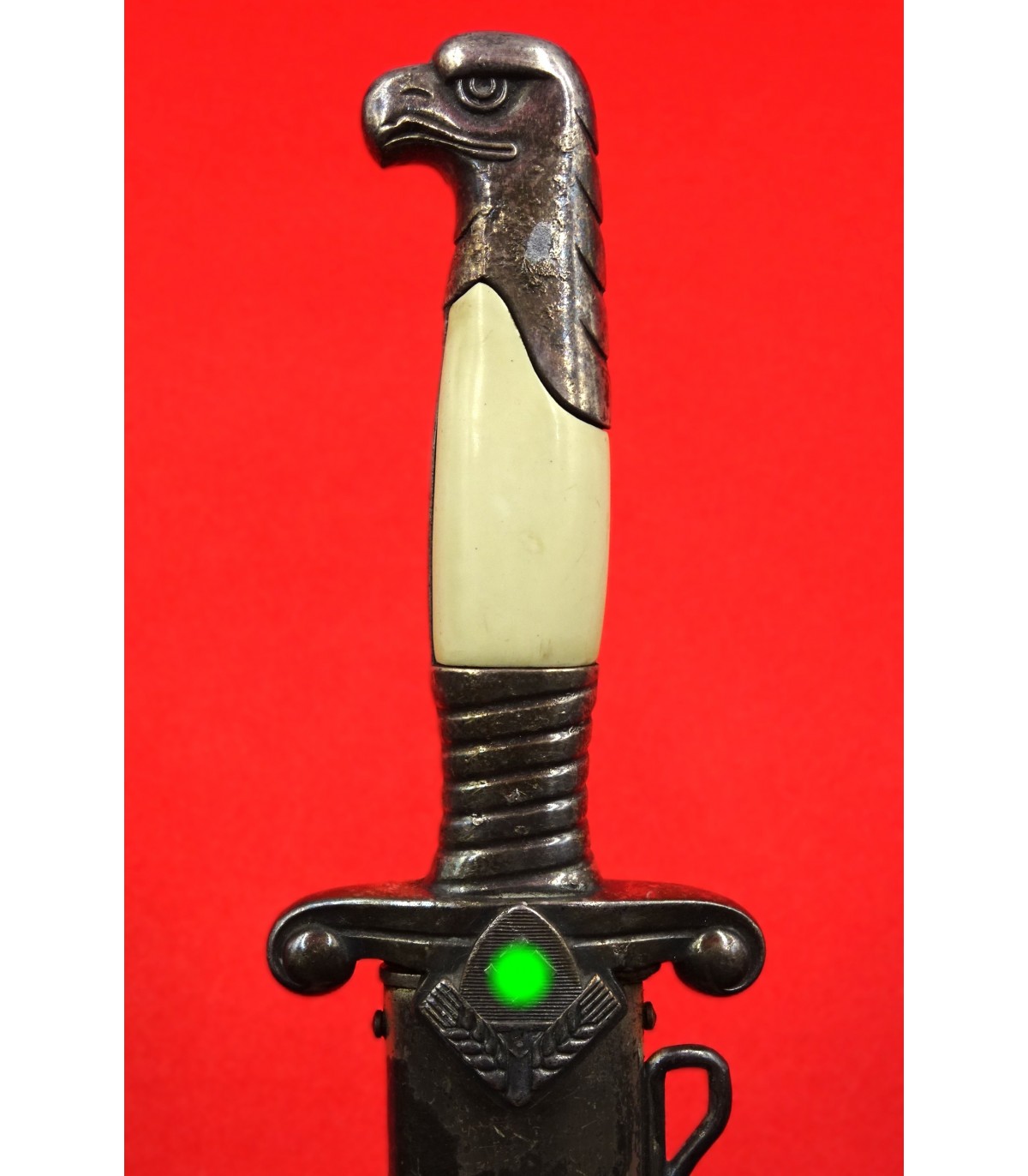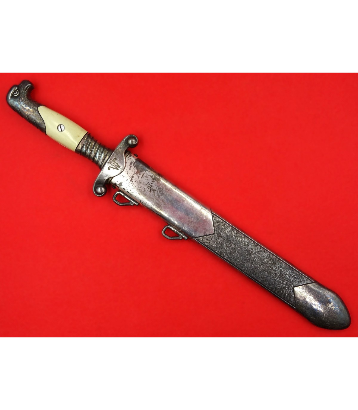 Nice blade with engraved motto 'Arbeit adelt'. White handle plates. Silvered aluminium handle. Initials of the owner F.W. to the back side of the cross guard. No damage to the scabbard. VGC.