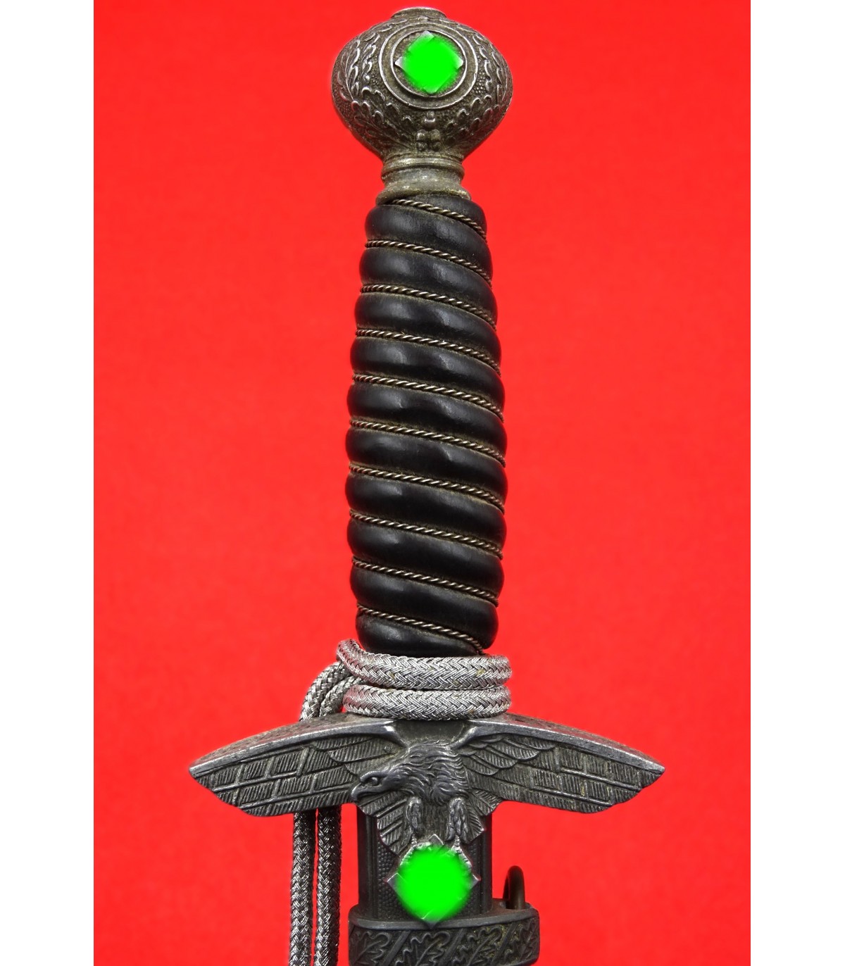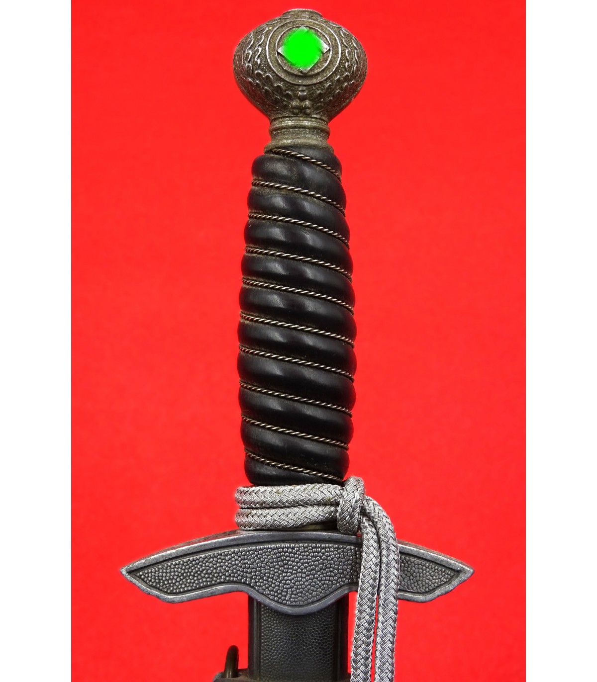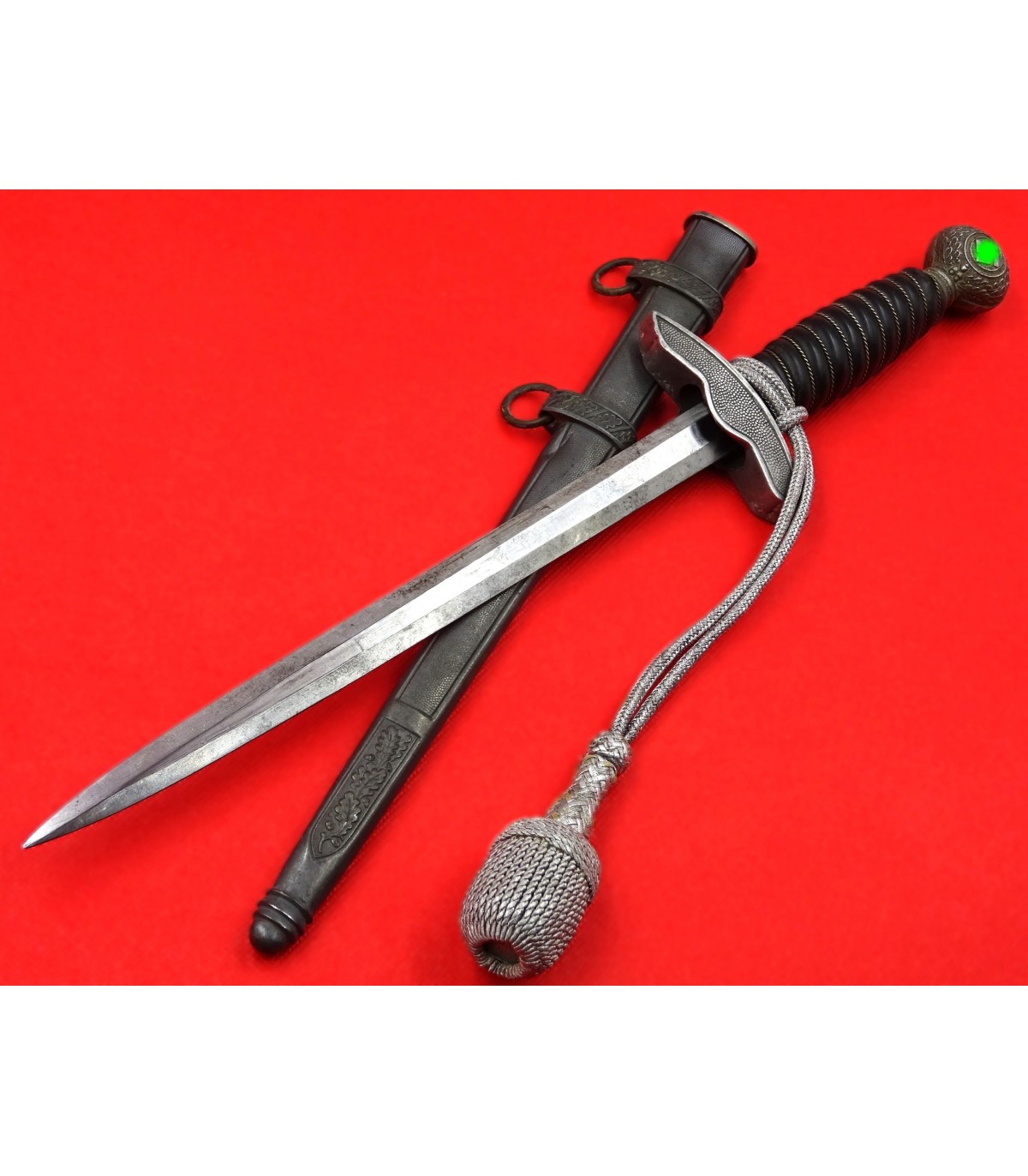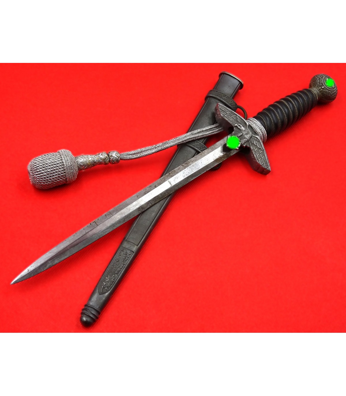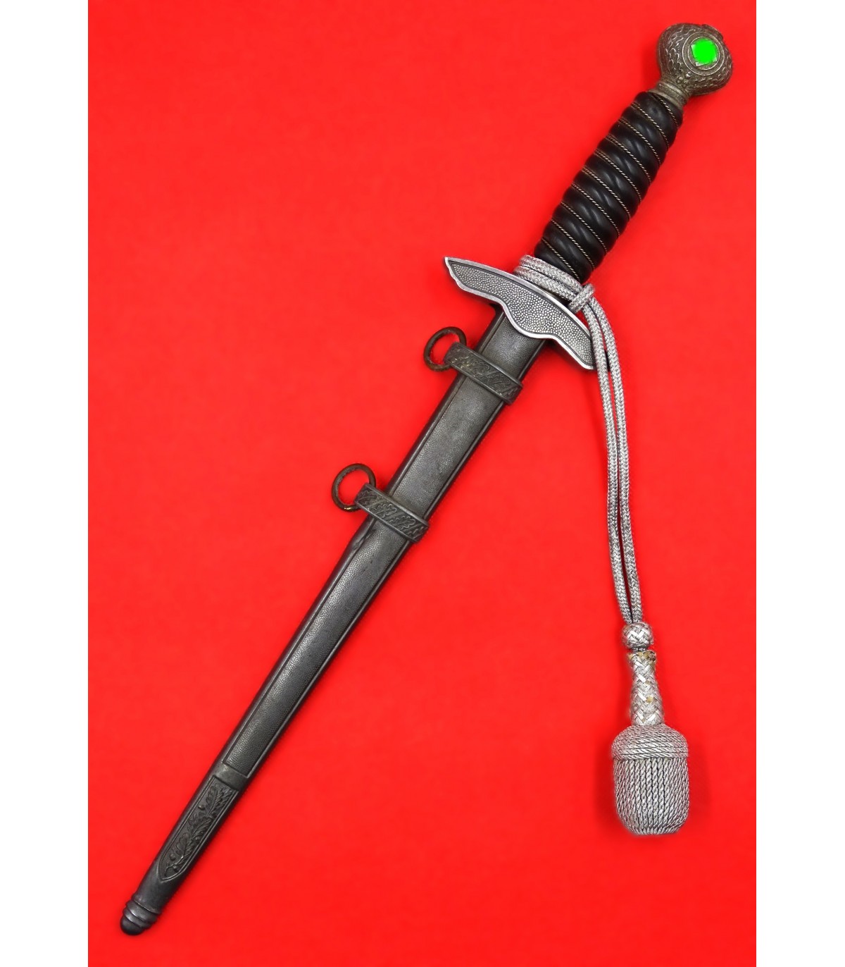 No maker. Black handle. A dent to the back of the scabbard. Good blade. With knot. Rare. GC.