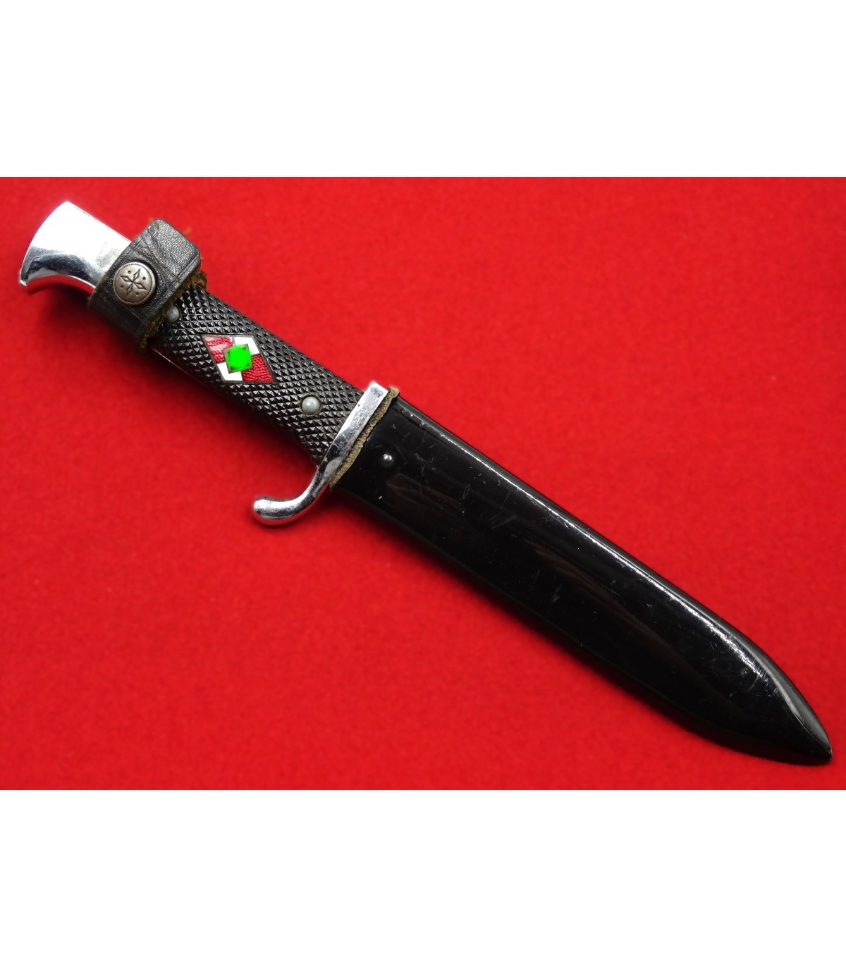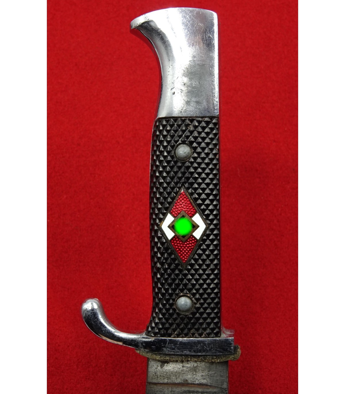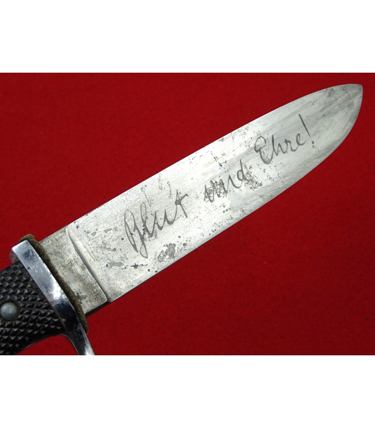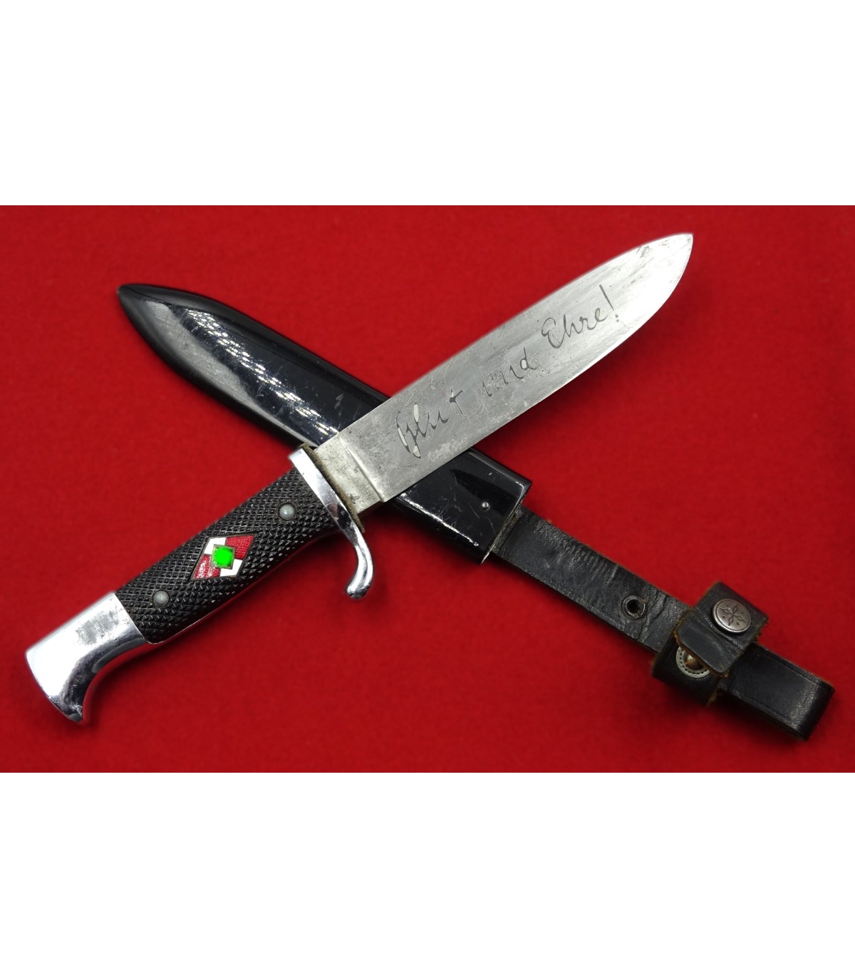 RZM M7/13. Motto 'Blut und Ehre!' engraved on the blade. Nice handle and HJ diamond. Blade is quite good. Scabbard retains almost 100% of black painting. Very good sample of the 'HJ-Fahrtenmesser'.