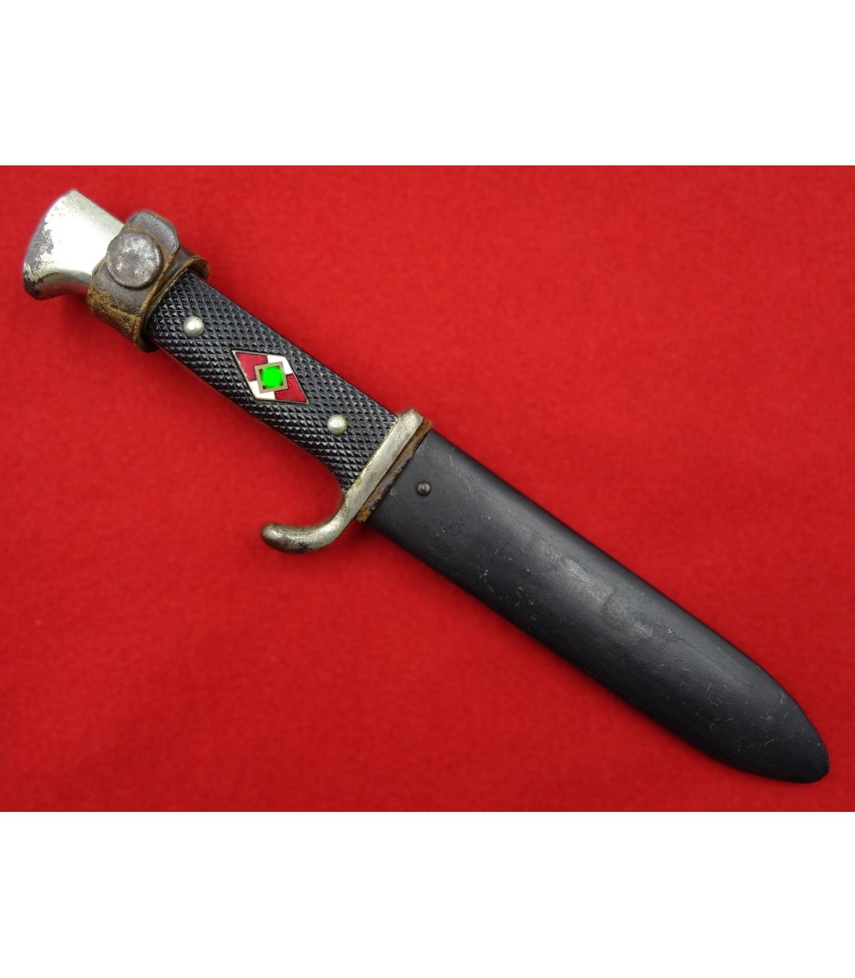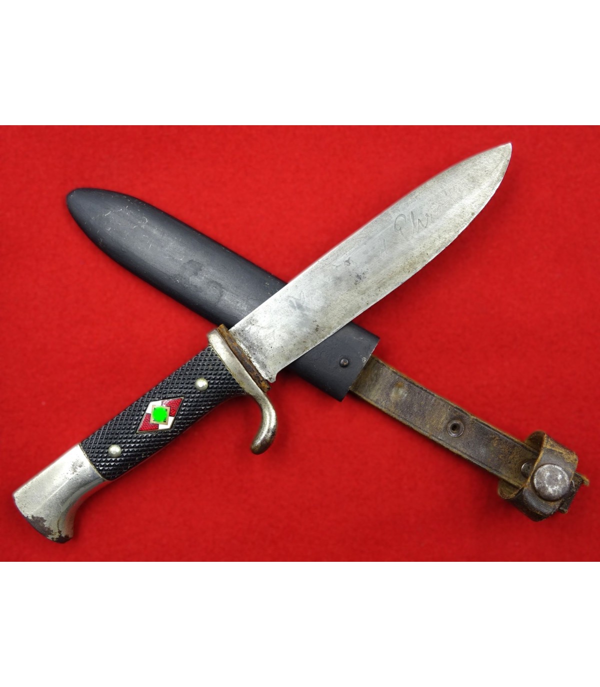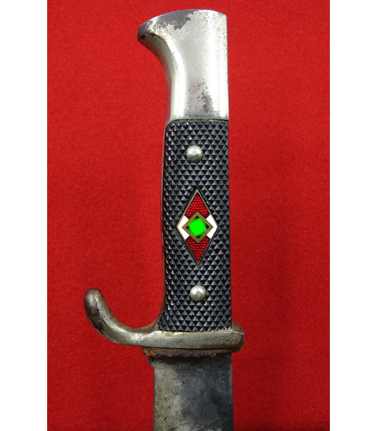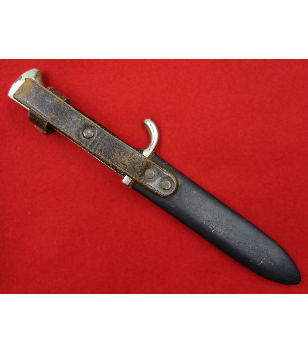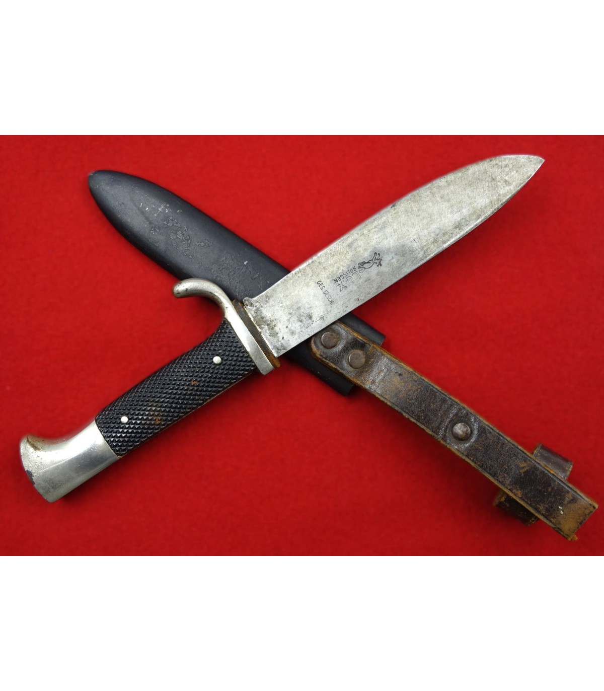 Early made without ricasso. Maker LUX Solingen (very small and rare maker). Motto 'Blut und Ehre!'. Good handle, no damage to the enamel of the diamond. Used blade. Scabbard retains 95% of black painting. GC.