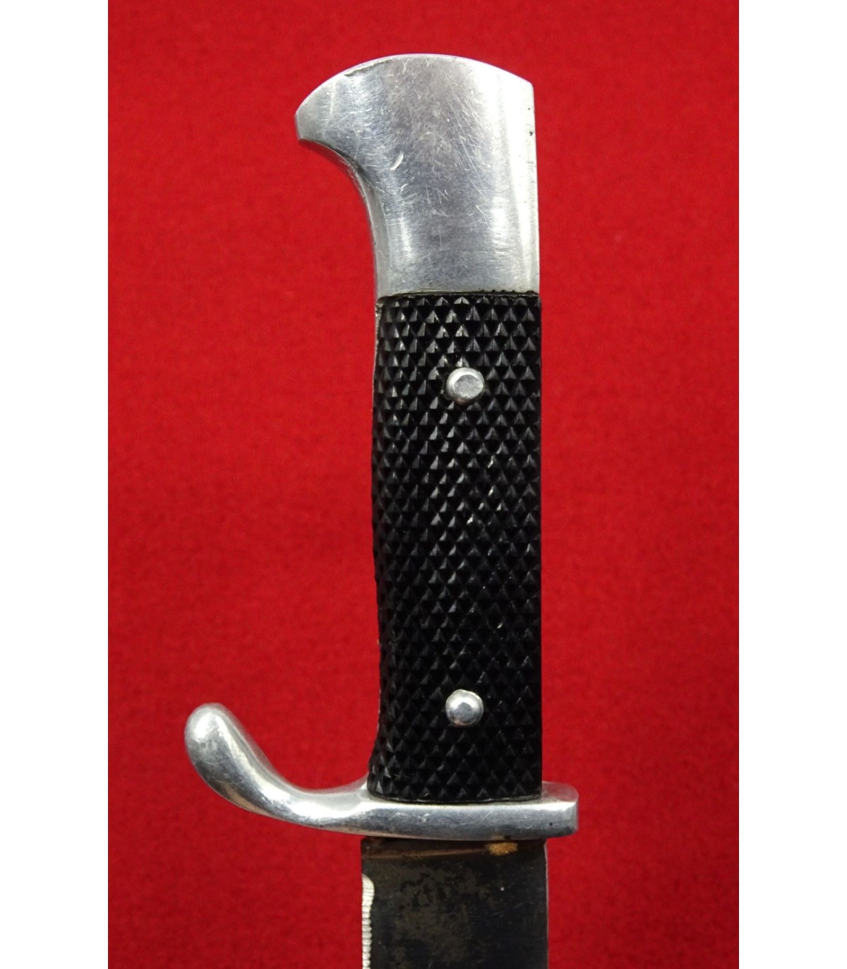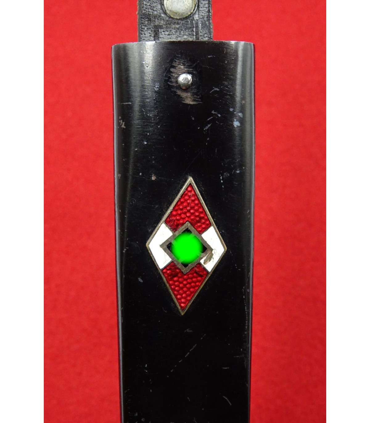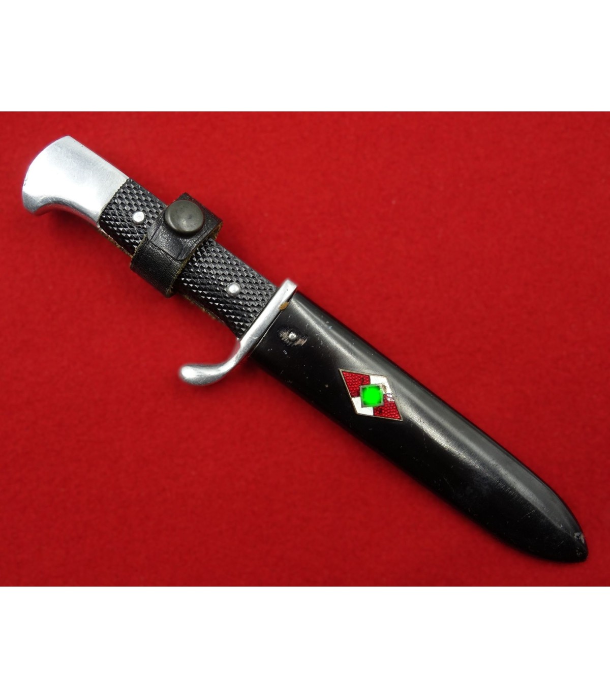 HJ knife style, aluminium handle. HJ enameled diamond on the scabbard. Quite good blade. Scabbard retains almost 100% of black painting. One small chip to the enamel. Quite rare. GC-VGC.