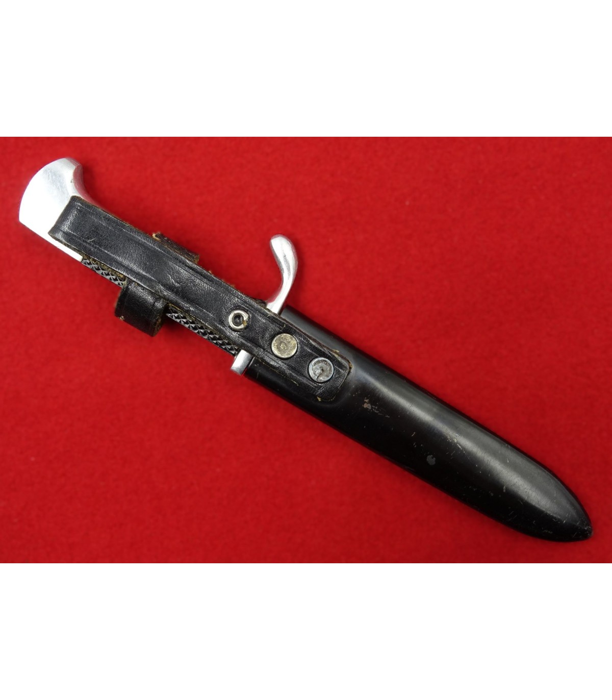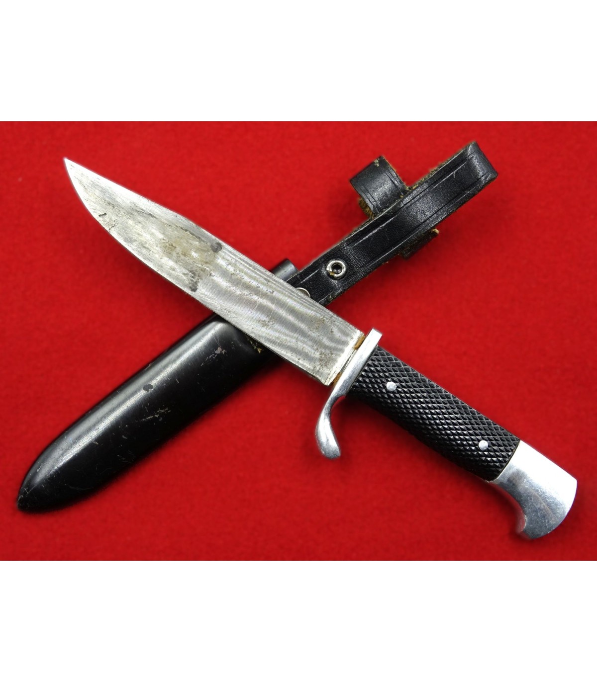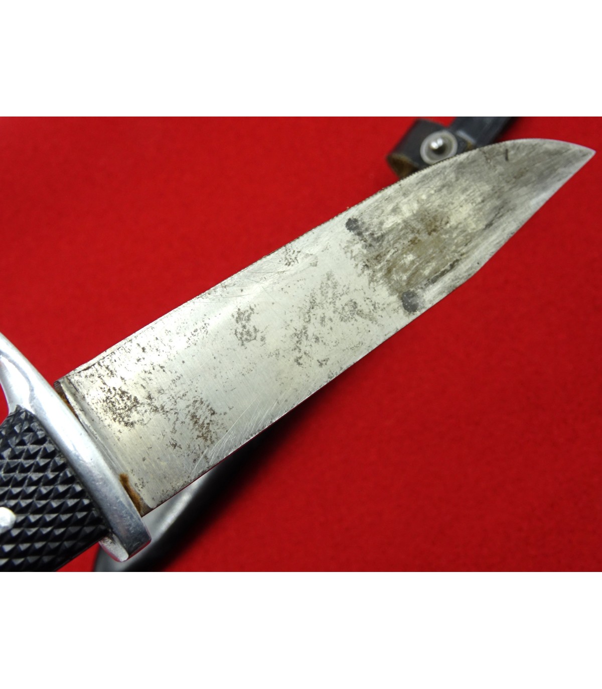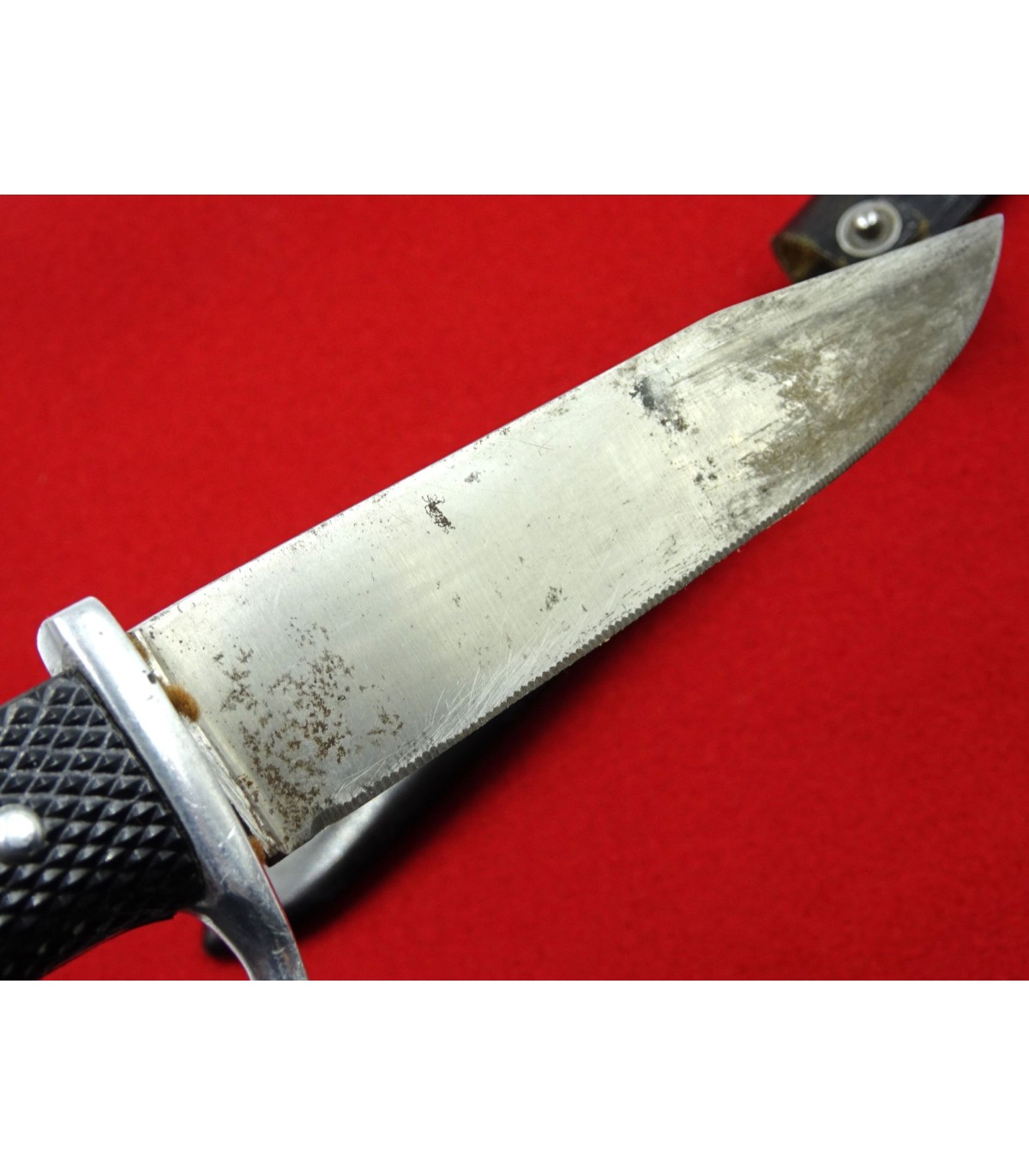 HJ knife style, aluminium handle. HJ enameled diamond on the scabbard. Quite good blade. Scabbard retains almost 100% of black painting. One small chip to the enamel. Quite rare. GC-VGC.