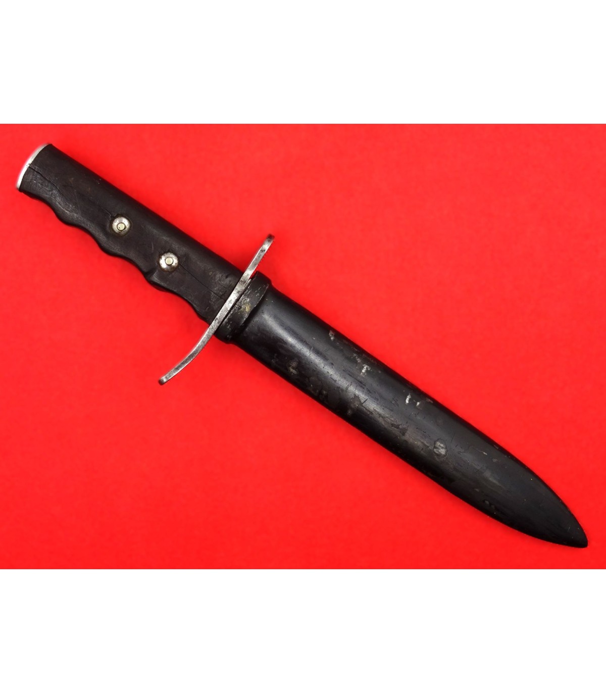 Wooden grips. Strong and large blade. Scabbard retains 95% of black painting. GC.