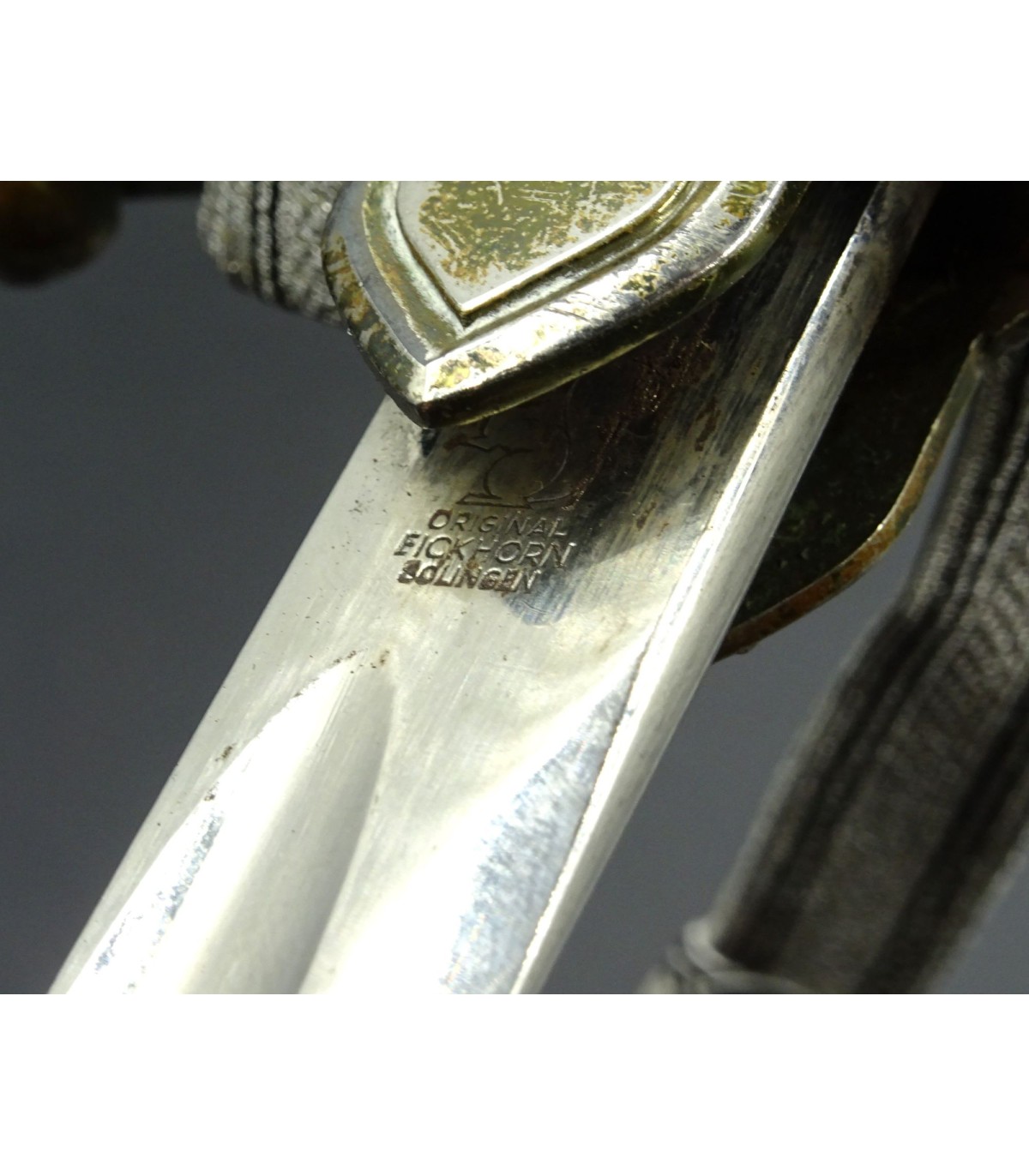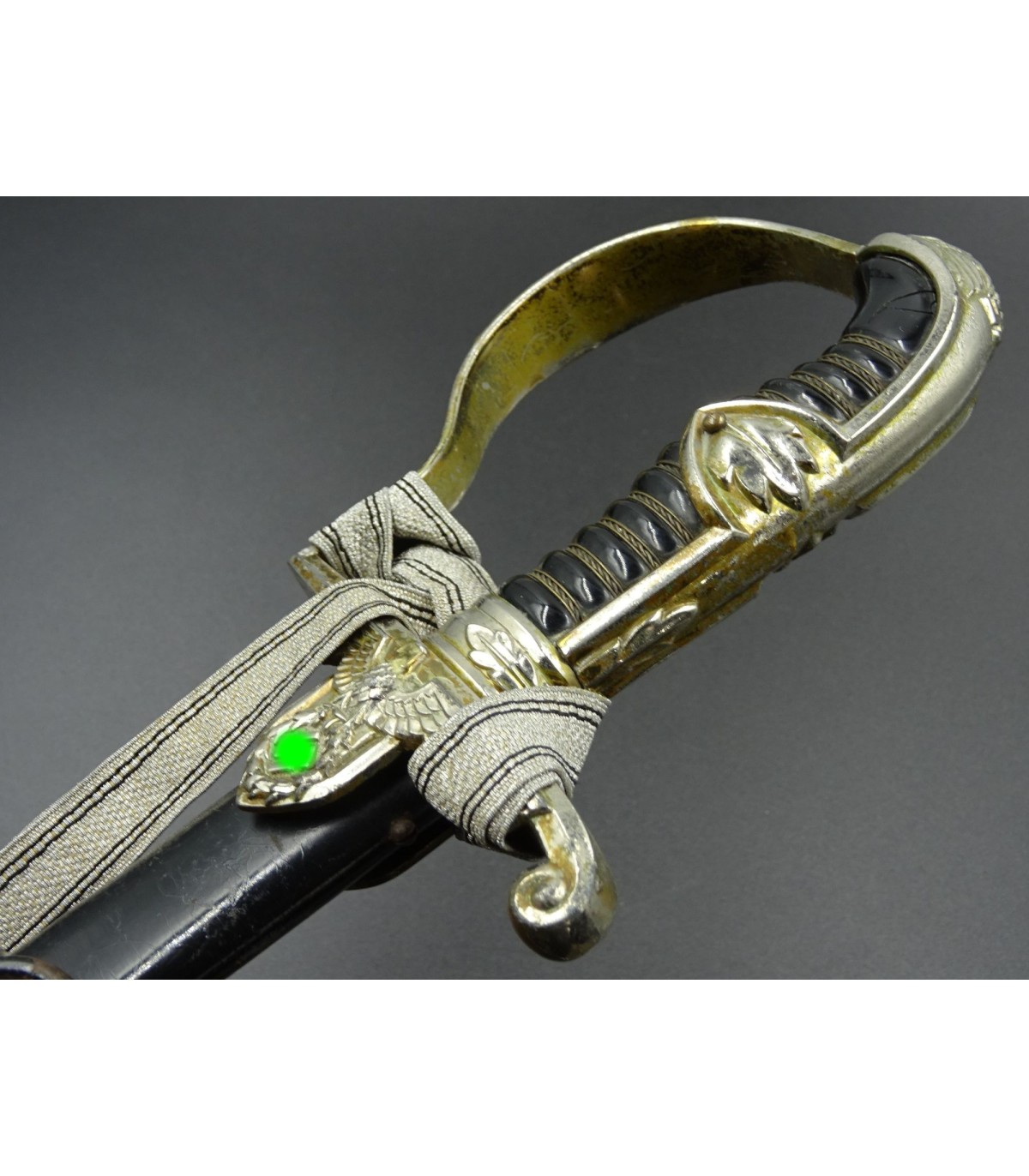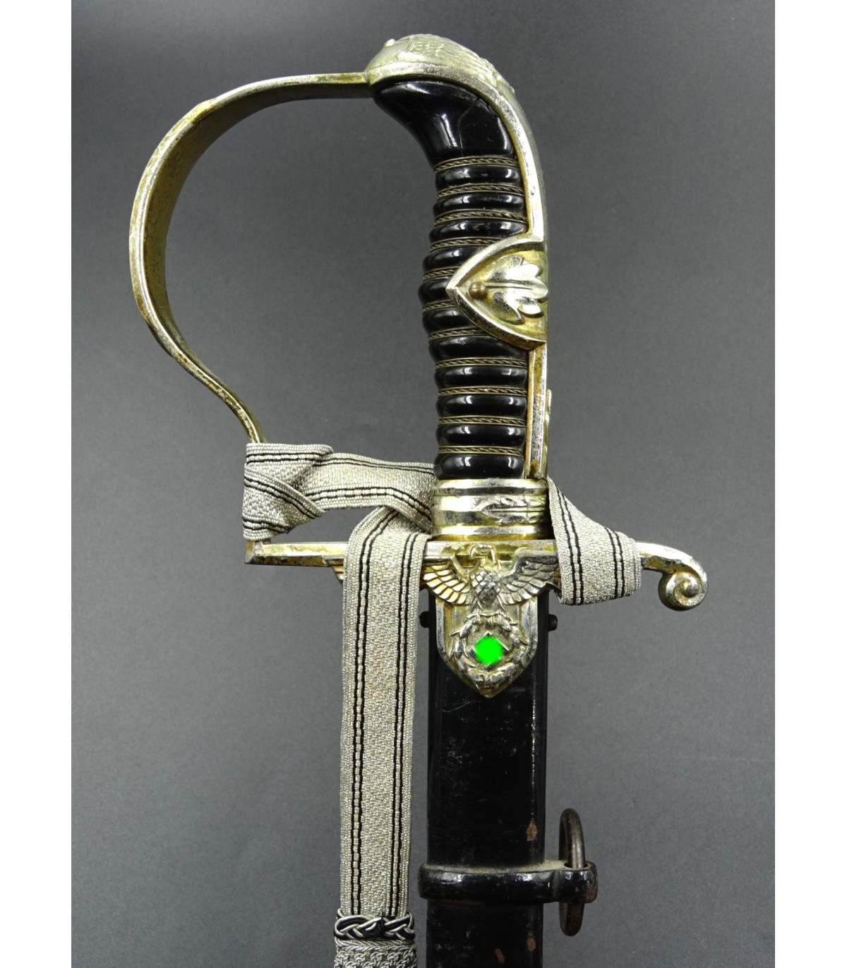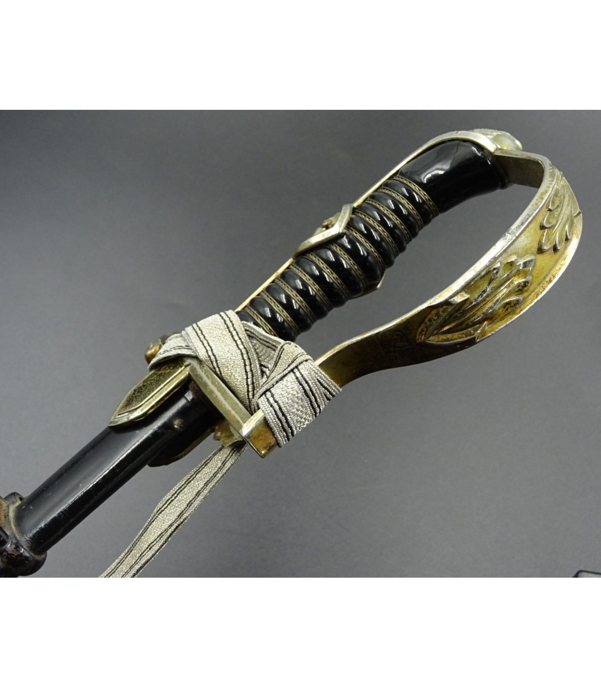 Prestigious sward, common to the Army and the SS (before a specific SS-Degen was adopted). Aluminium cross guard. Good blade. Scabbard retains 90-95% of black painting. Comes with a SS knot for low rank officers and NCO. VGC.