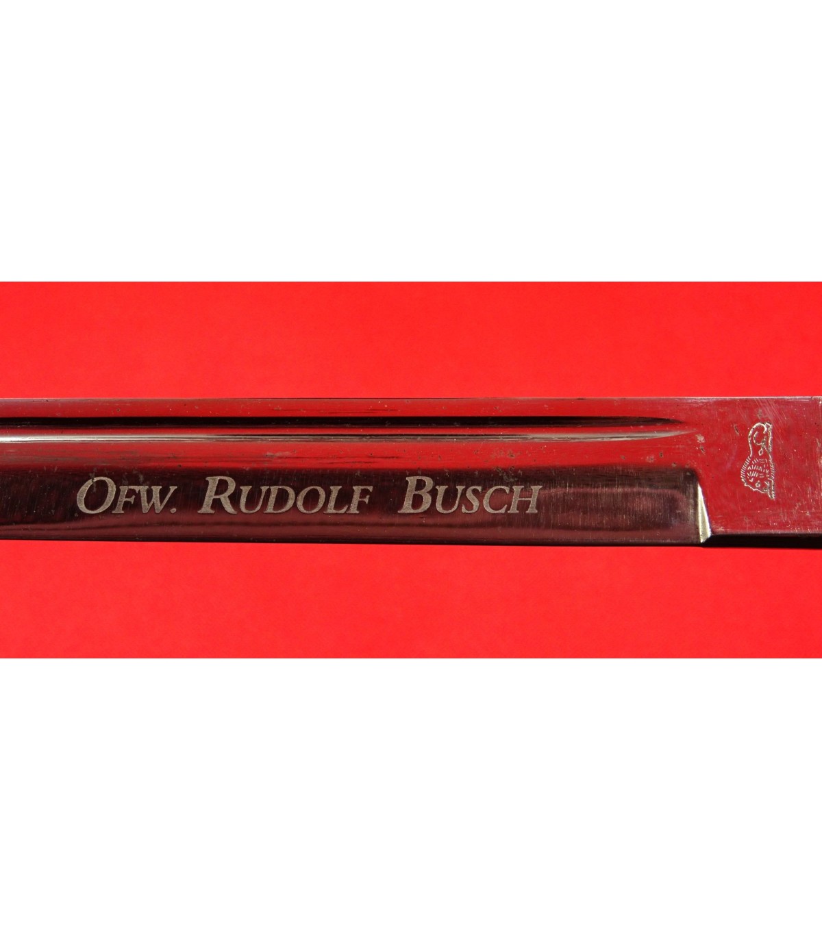 Short non-commissioned officer's bayonet, attributed to 'Ofw (Oberfeldwebel) Rudolf Busch'. Obverse with large WH eagle, arabesque decoration and 'Zur Erinnerung an meine Dienstzeit'. Scabbard lacquer 100%. GC.