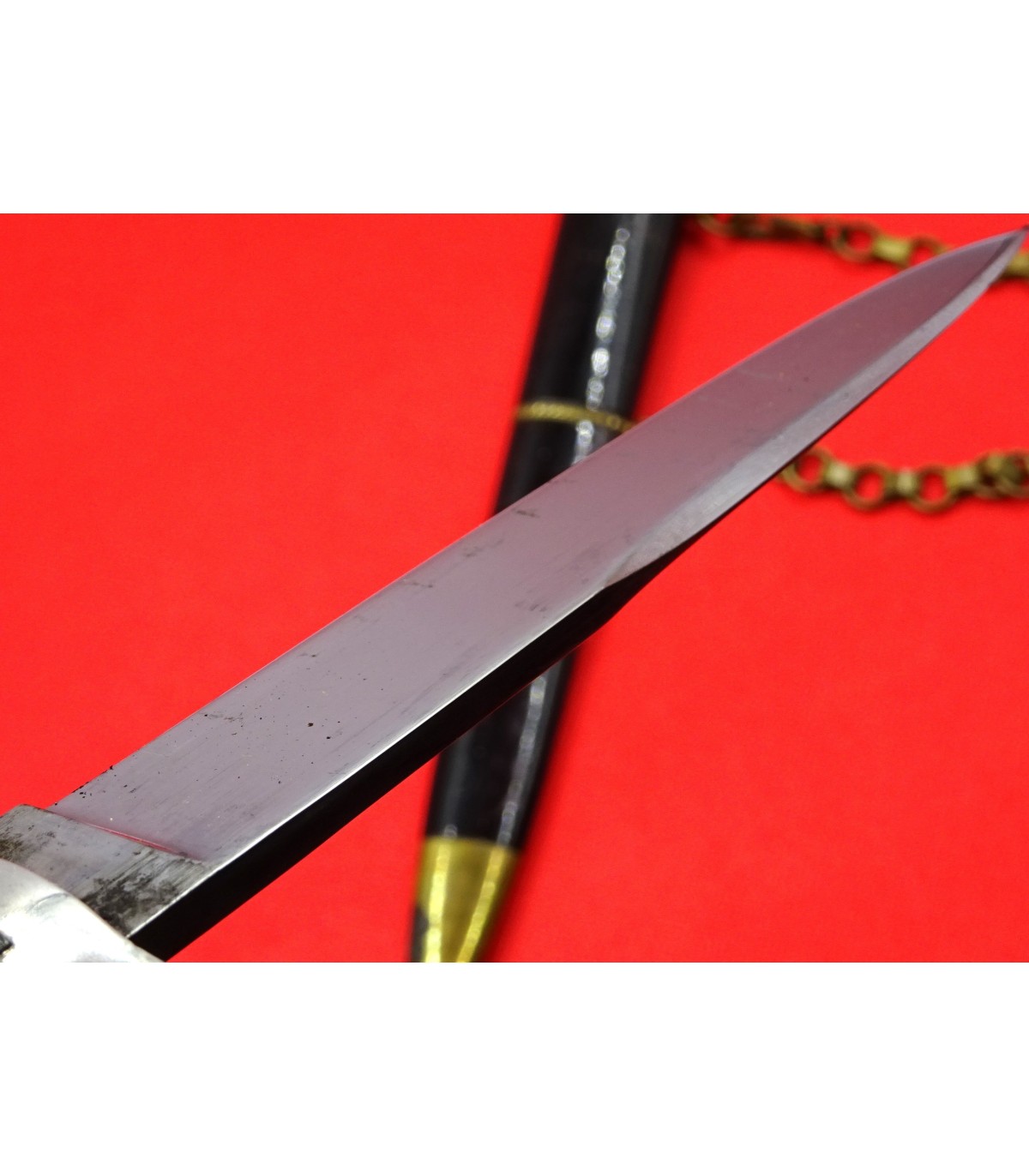 A fine example with ornate hanger's suspension rings and a separate pommel ball, a hallmark of high-ranking officers. Superb blade, scabbard lacquer nearly 100% intact. Black ebonite scales with a gold fascio, aluminum grip. Chain with SPQR eagle snap hook. VGC.