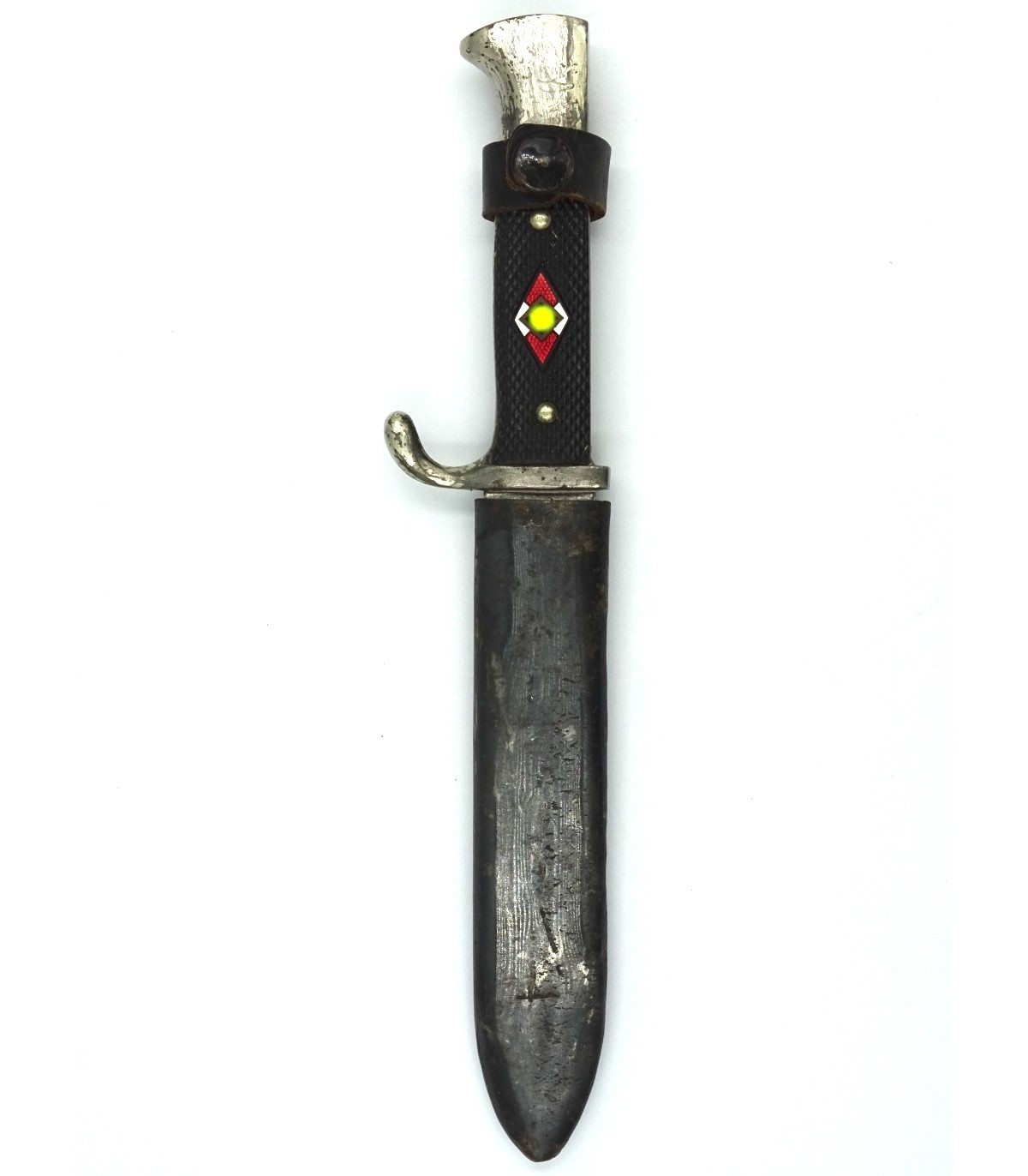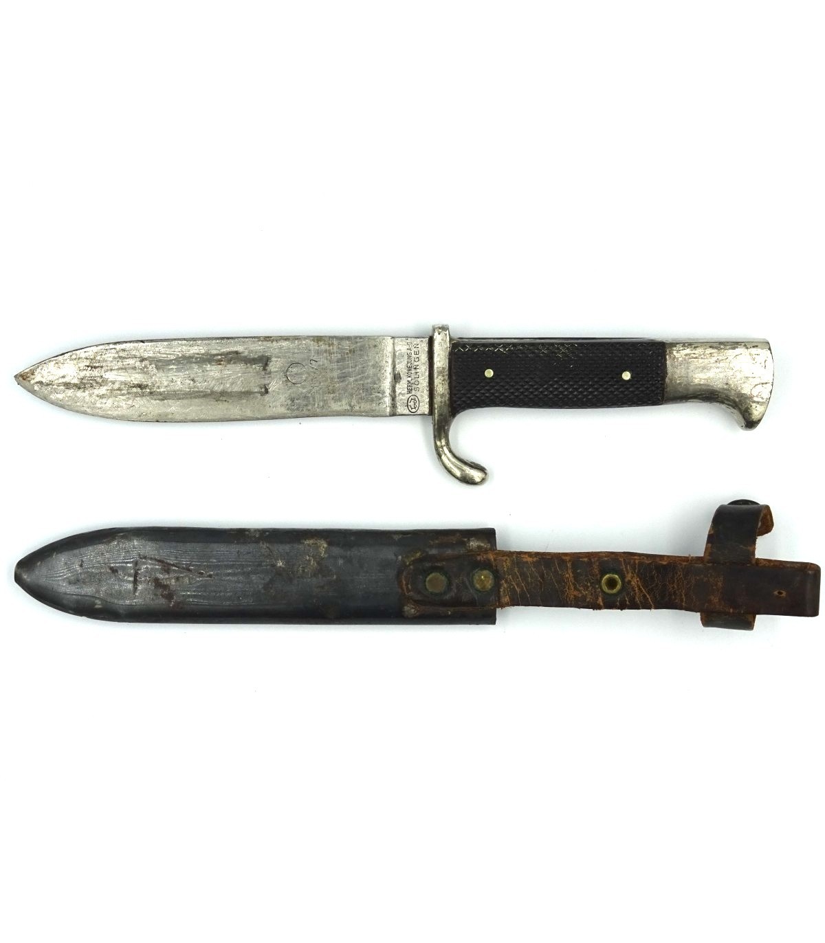 Rare maker. Nice handle and insignia. Deep motto Blut und Ehre!. 70% of the black finish to the scabbard. GC-.