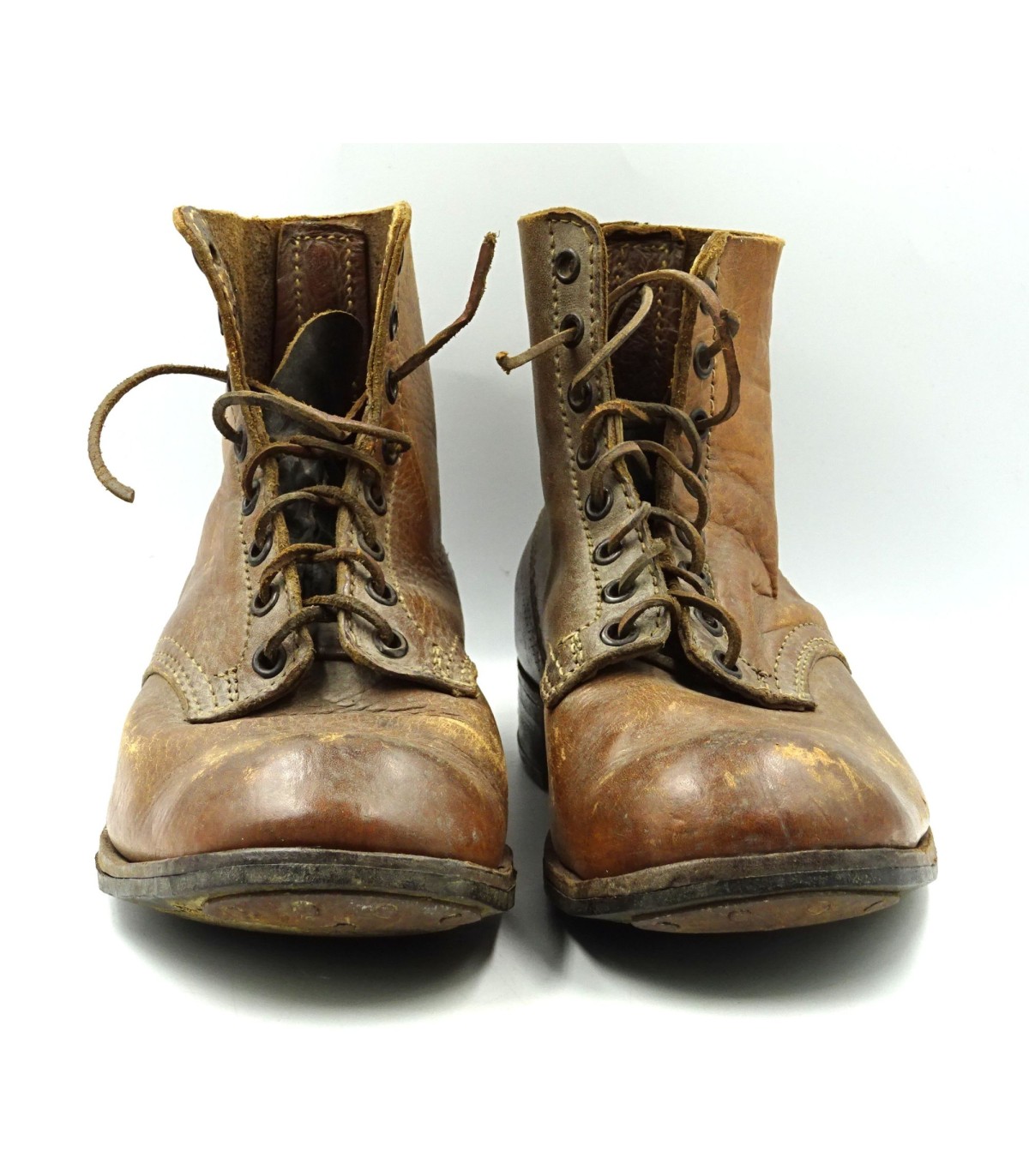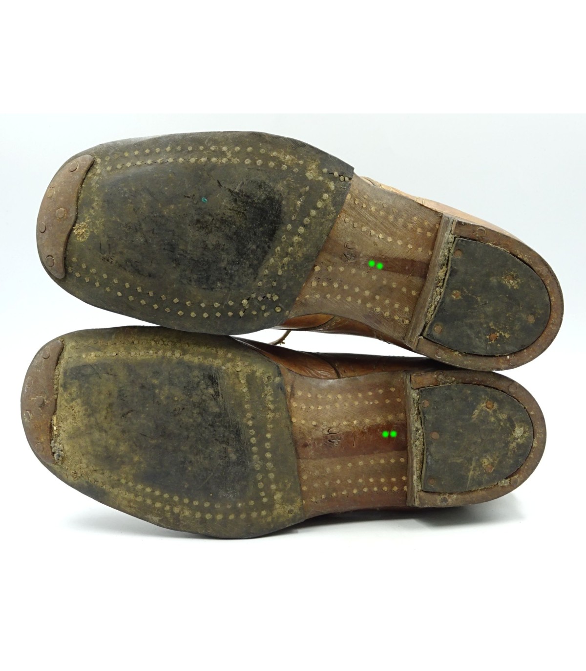 Light brown leather, wooden peg soles, 40 marked. SS-BW (Bekleidungswerke) stamped on the sole (very few ligible) and at the ankle height. Never had nails. U-shape irons. 8 grommets. Leather laces. Lenght 28cm. Very few worn. Gorgeous.