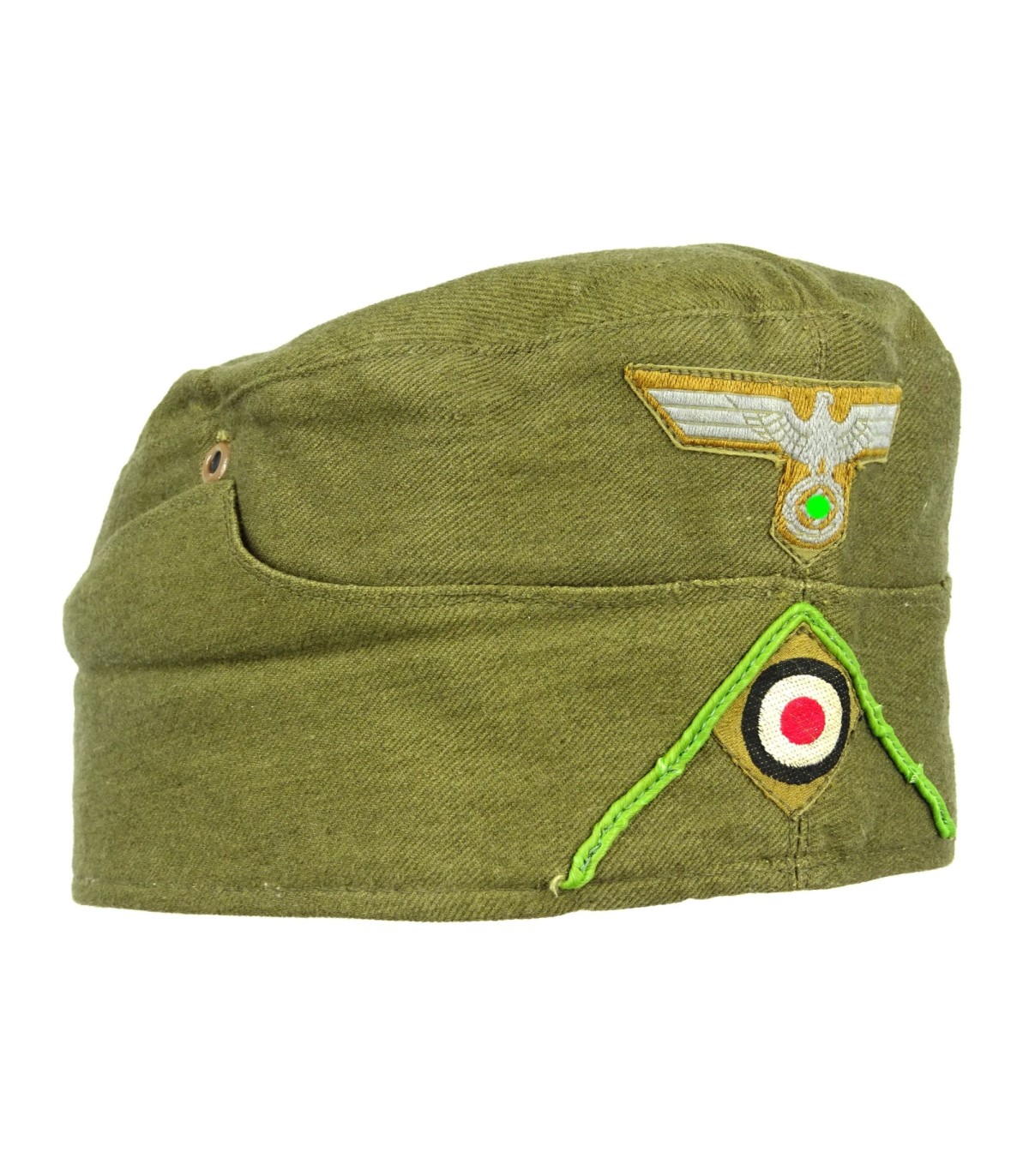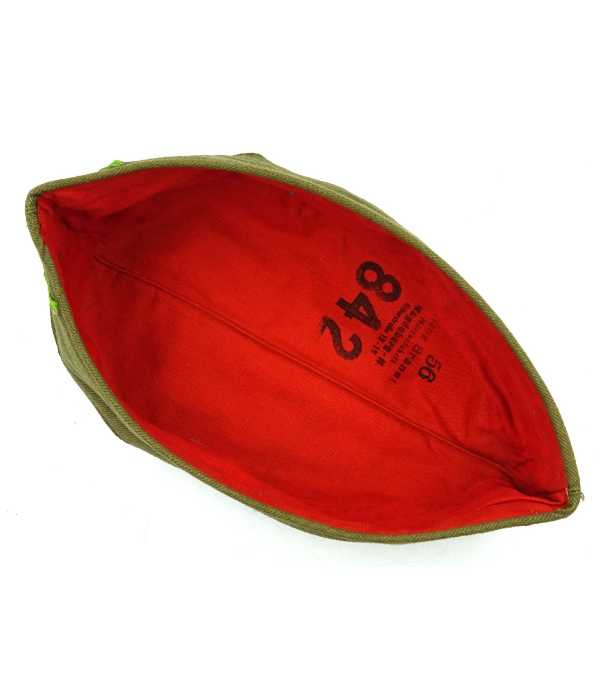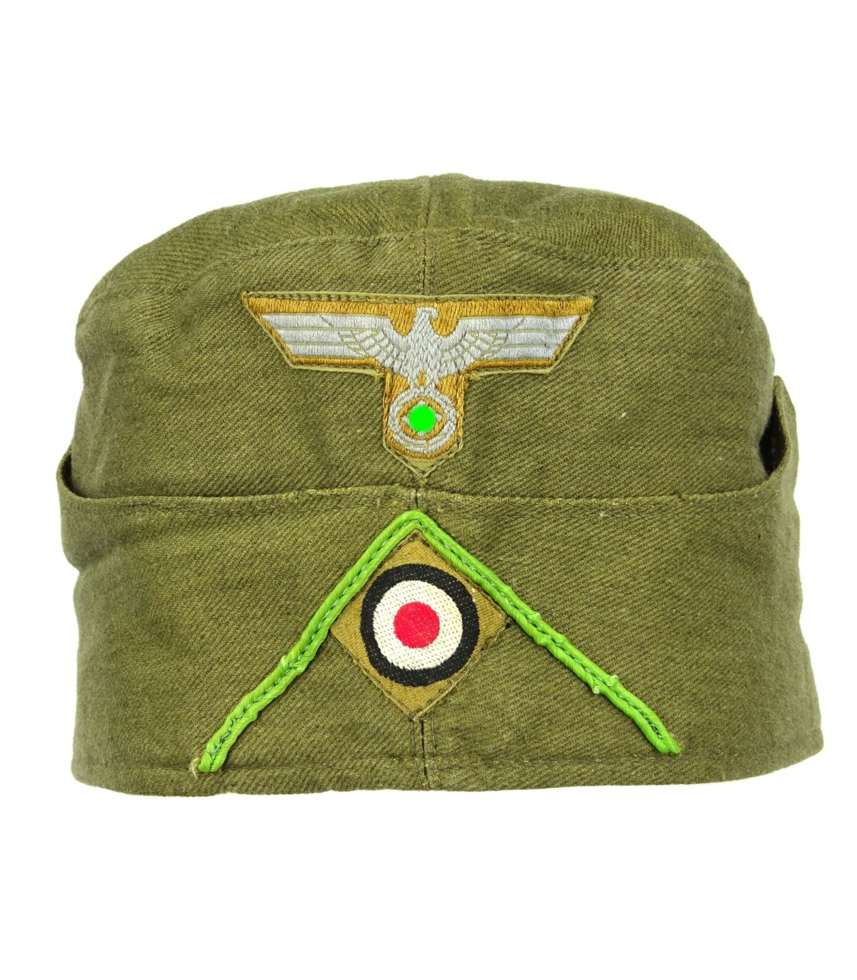 Complete. Machine woven bevo insignias. Green Panzergrenadier chevron. Red lining, well marked. Size 56. Grey pot metal grommets. Unissued.