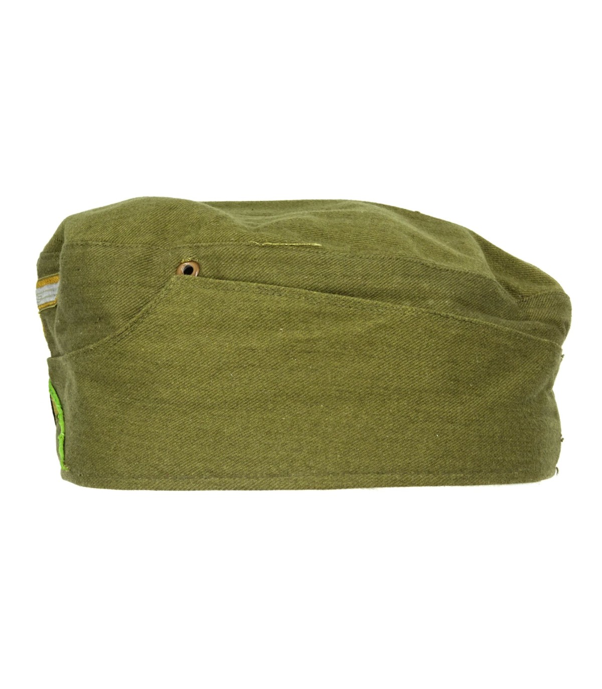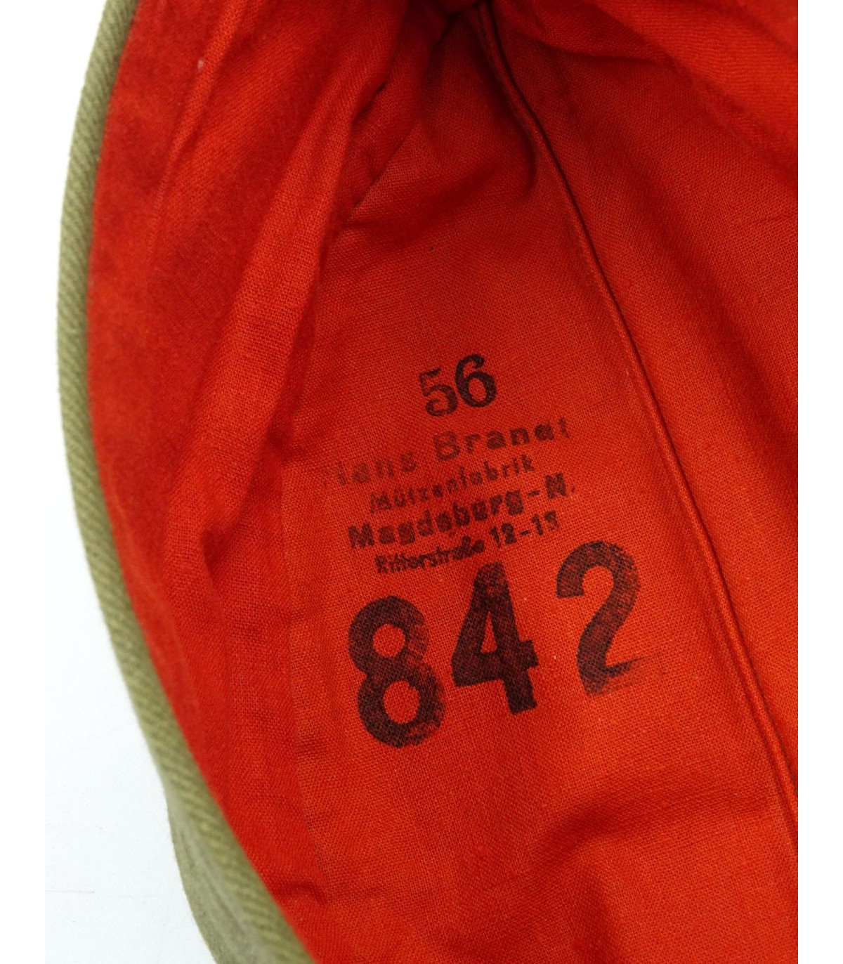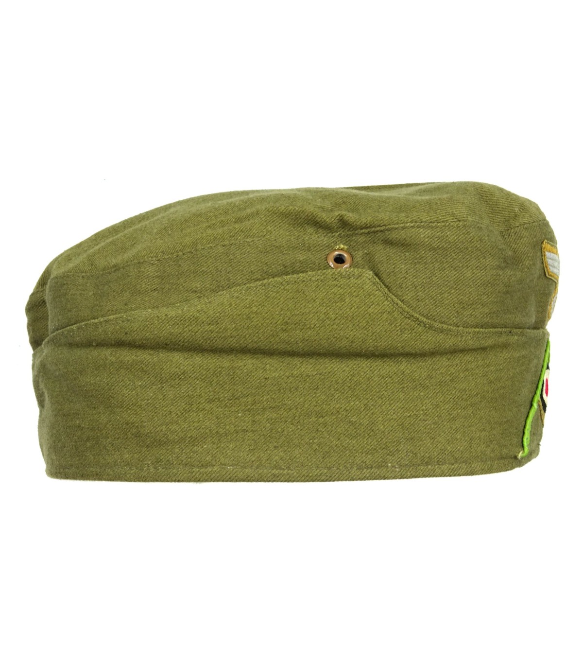Complete. Machine woven bevo insignias. Green Panzergrenadier chevron. Red lining, well marked. Size 56. Grey pot metal grommets. Unissued.