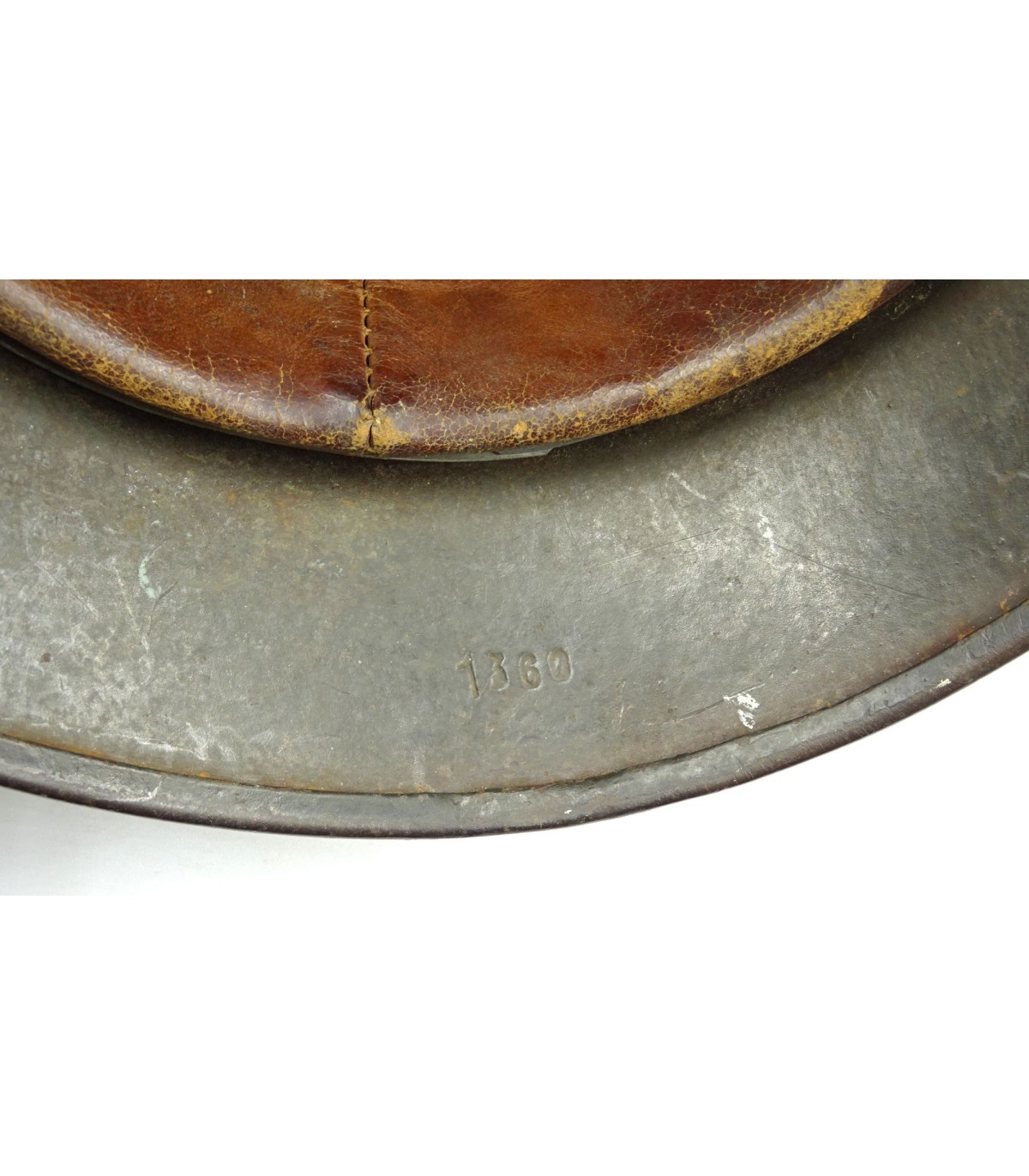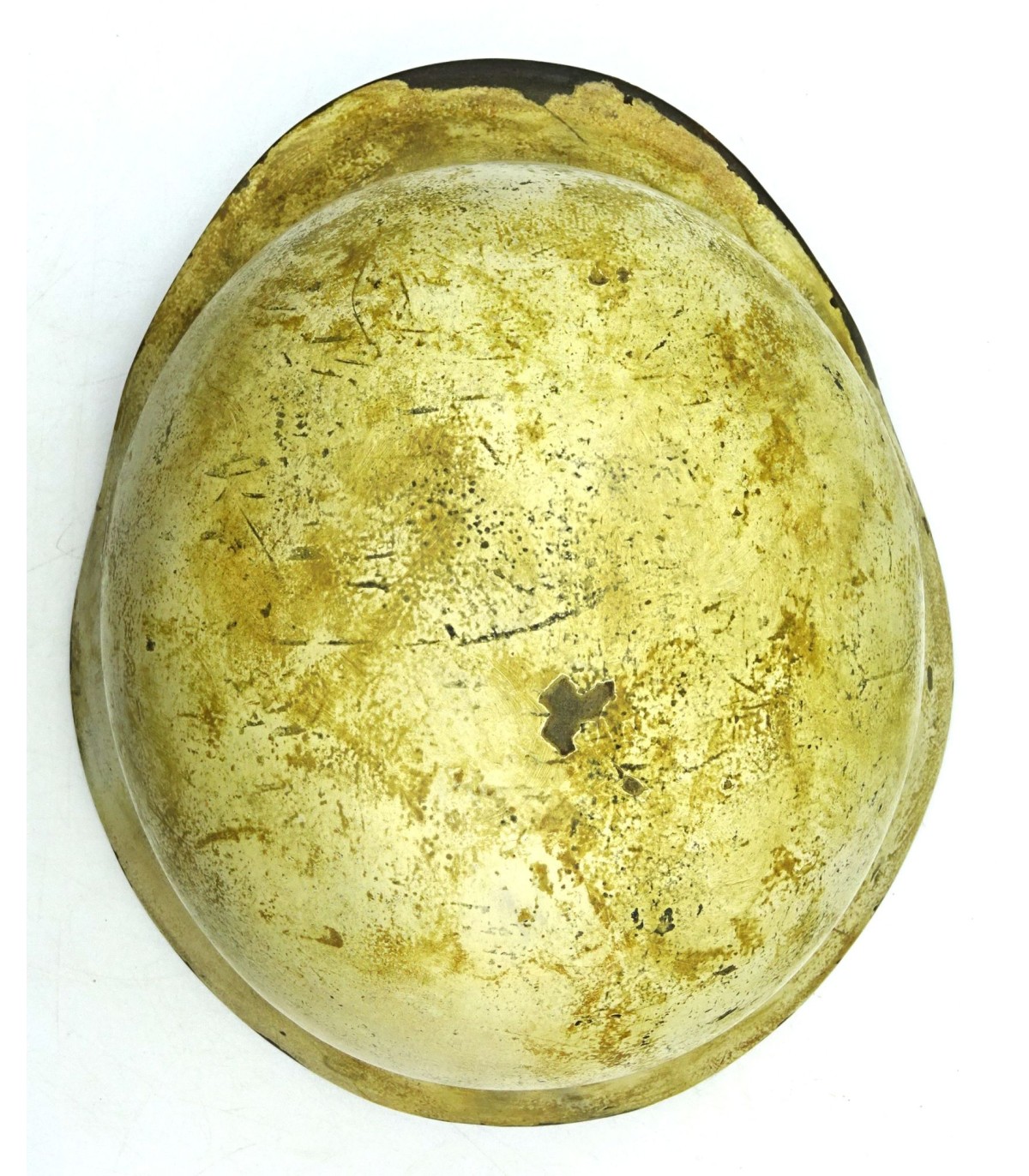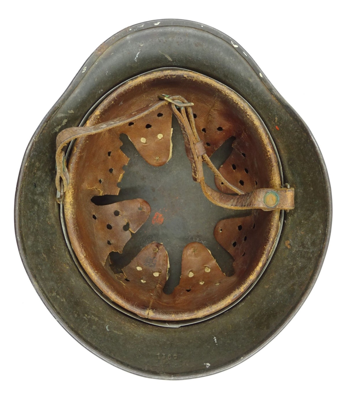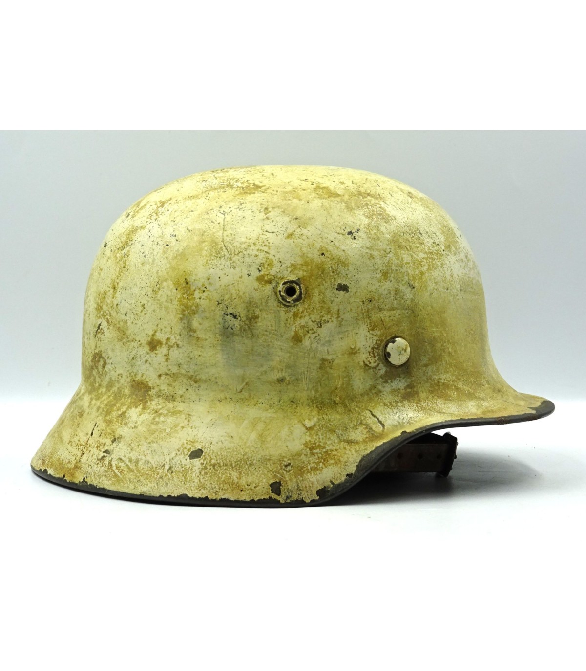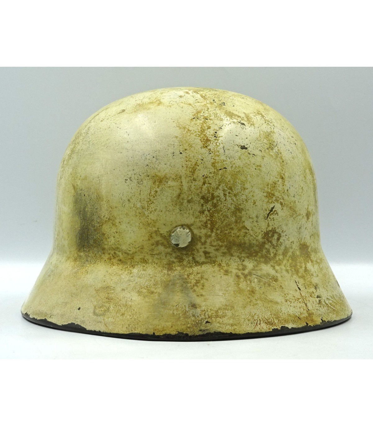Complete. EF62, #1360. Foreign captured chin strap (finish?). Size 55. Damaged liner, partly repaired. Retains 90% of white camouflage. Trace of LW eagle 2nd model on the side. Hard to find. GC.