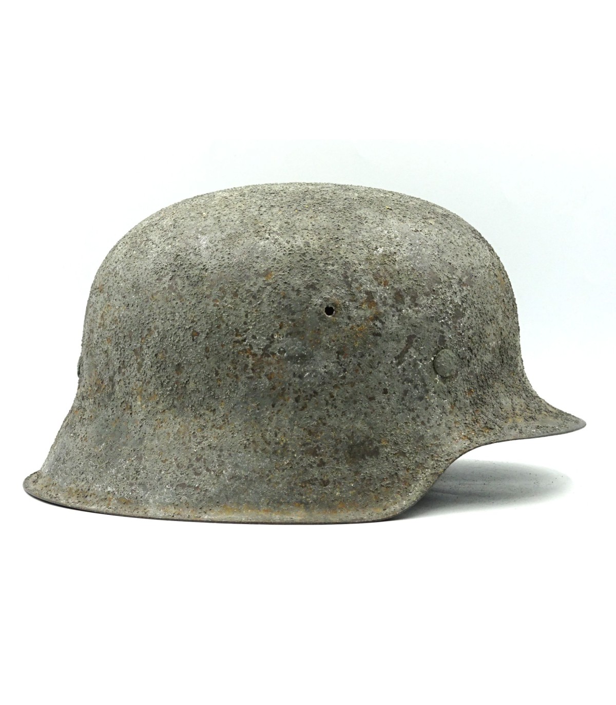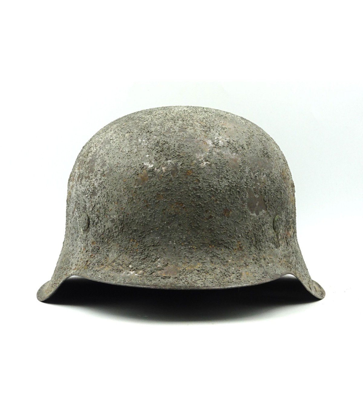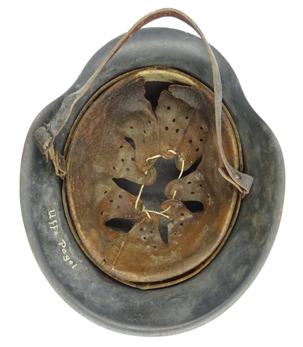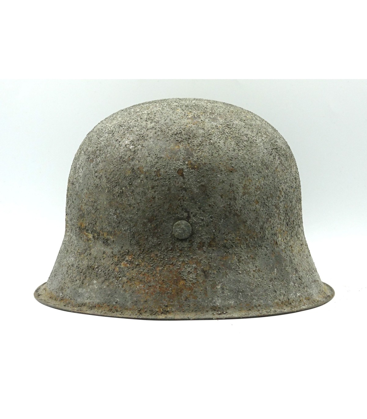 Complete. Markings not found. Pigskin headgear, torn at the front. Concrete-like paint at 80-90%. Owner's name painted on. Average. Good combat helmet.