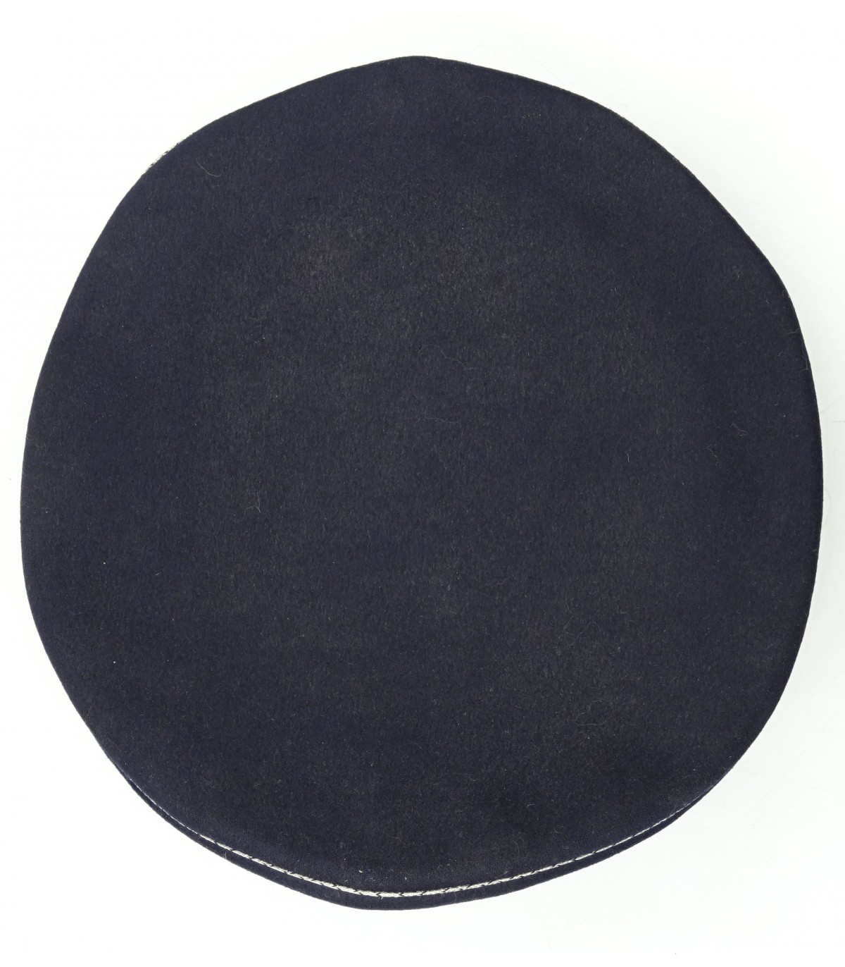 Complete. Dark blue body, black mohair band, aluminium piping w/dark blue dots. Aluminium insignias. Aluminium cord. Leather peak. Teno emblem on the lining. Gorgeous. VGC.