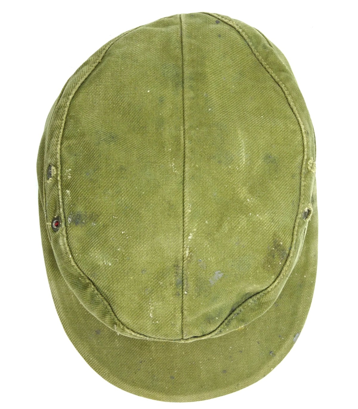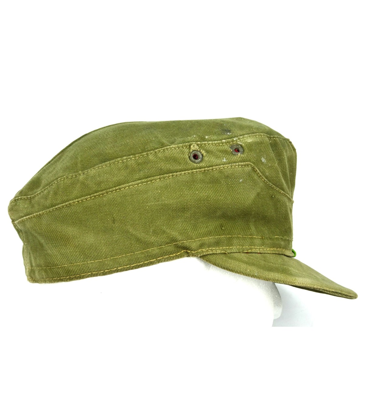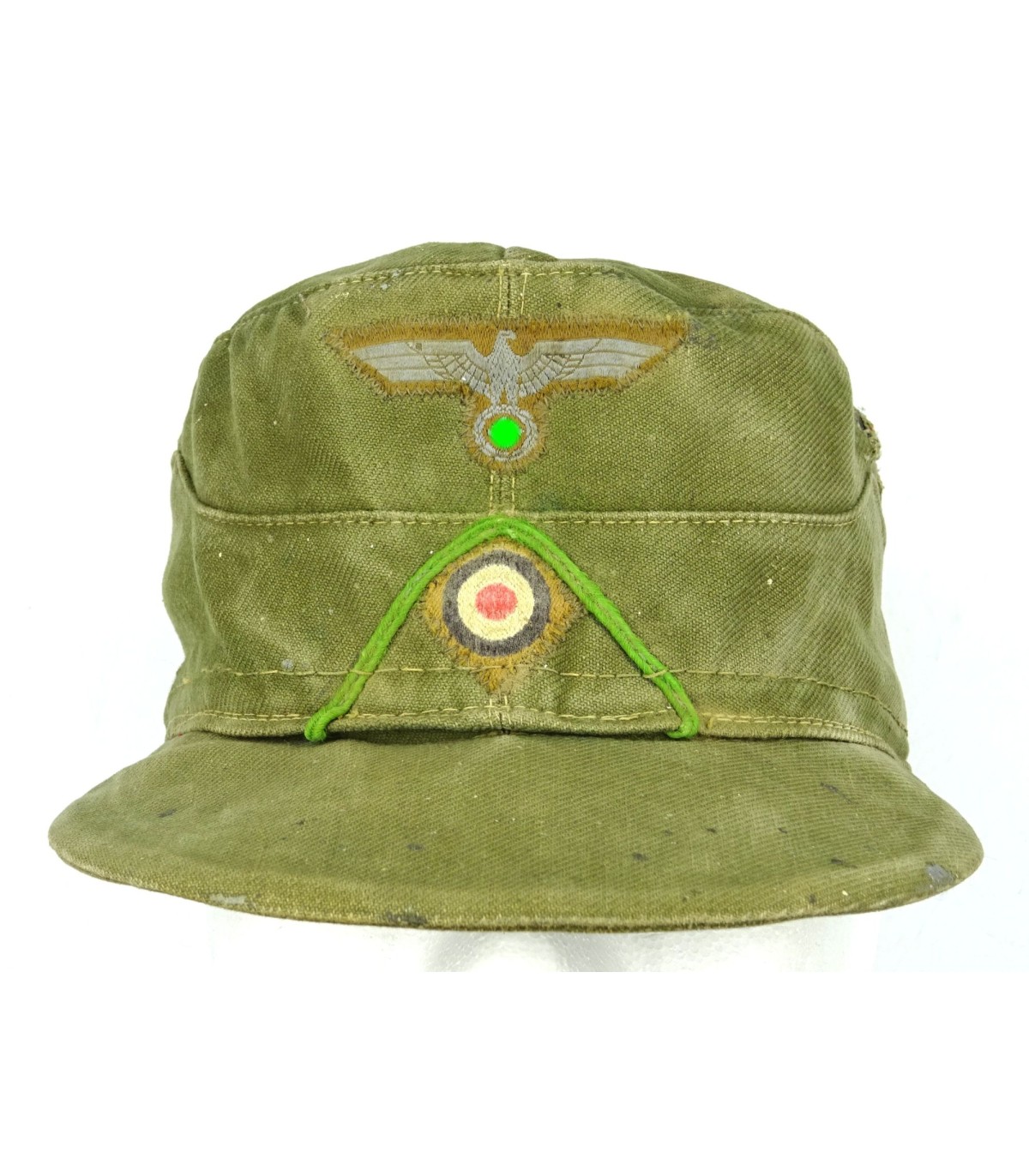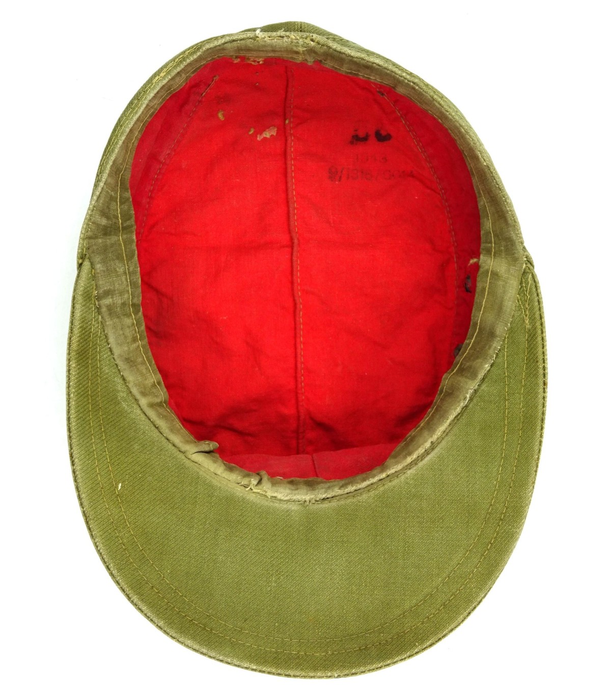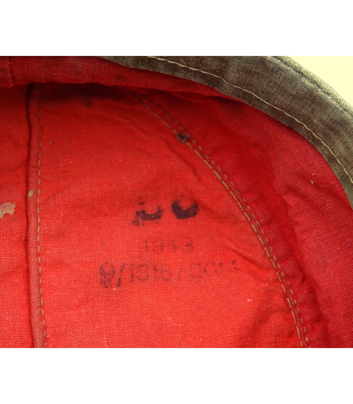 Complete. Oliv-green cotton, red lining. Machine woven bevo eagle and cocade. Insignias are machine sewn. Panzergrenadier-green chevron. Zinc grommets (one missing). Cloth sweat band. 1943 dated. Size 56. (In 1942, the motorised infantry was recalled Panzergrenadier). Rare. GC-.