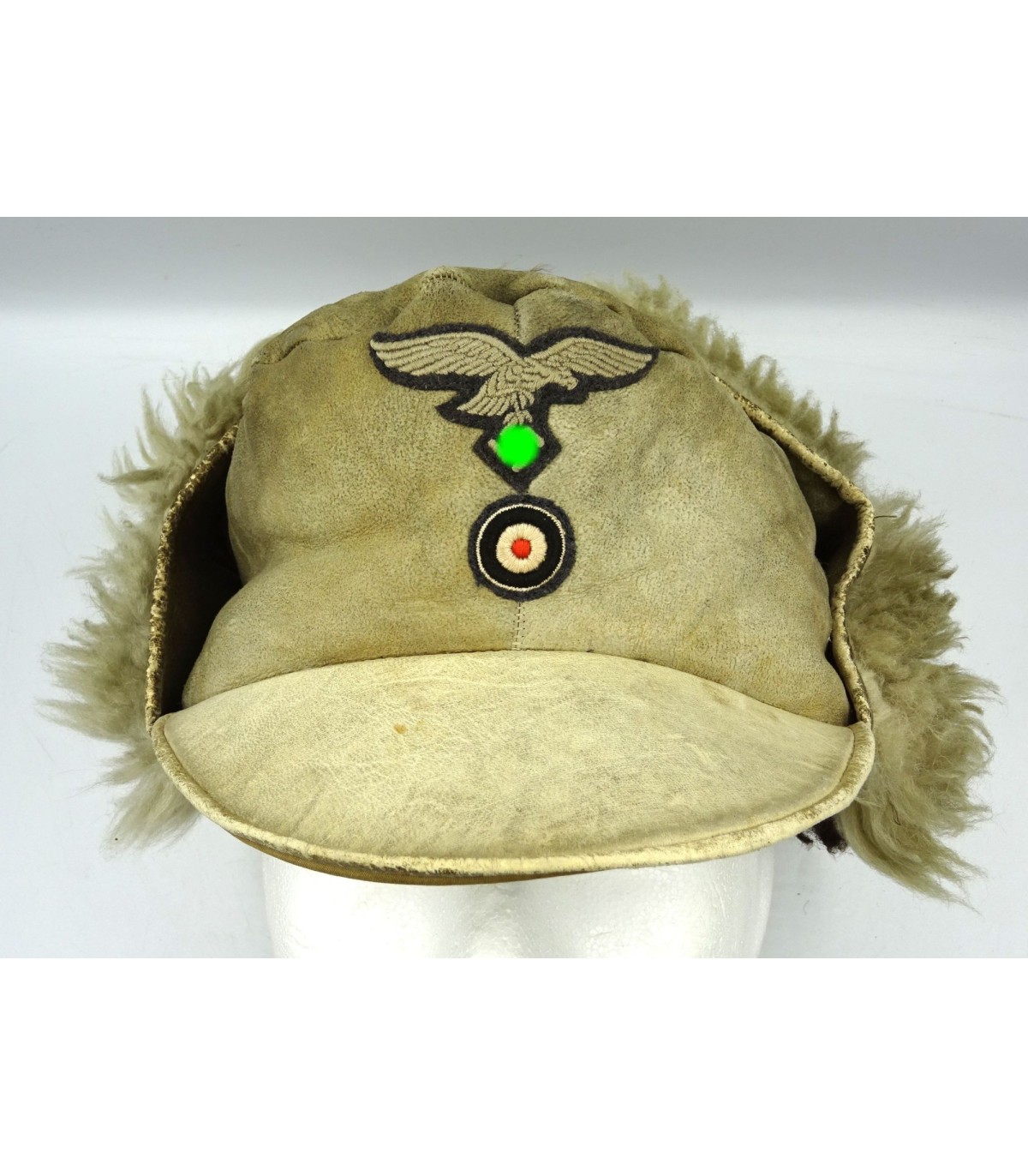 Complete. Visor covered in white leather. Machine embroidered and machine stitched insignias. GC.