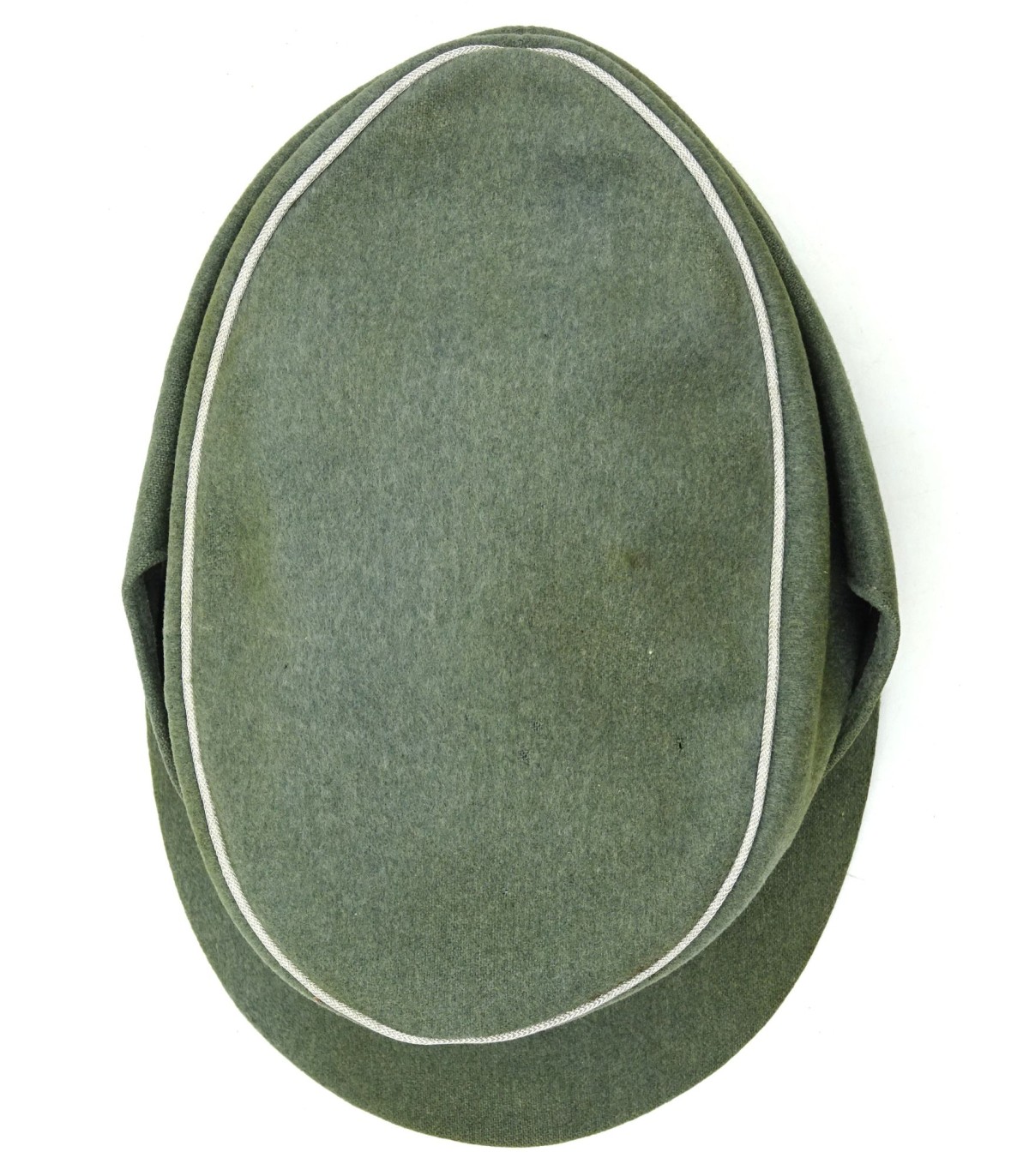 Beautiful, high-quality cap in fieldgrey woolen doeskine. Trapezoidal woven Bevo badge, original stitching. Two silver pebbled buttons. Aluminum piping. Grayish satinette lining, half-moon sweatband. Size 59. VGC.