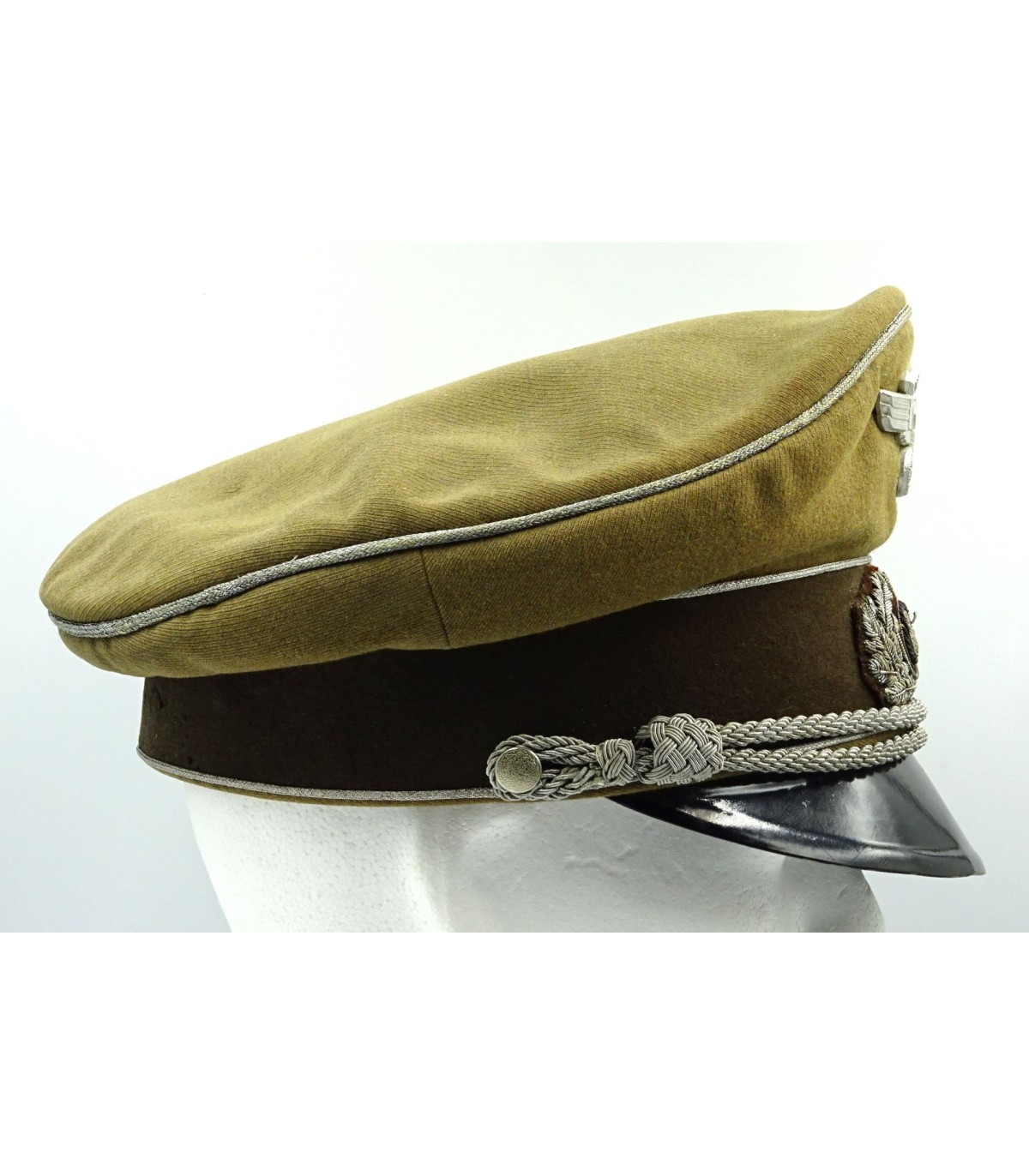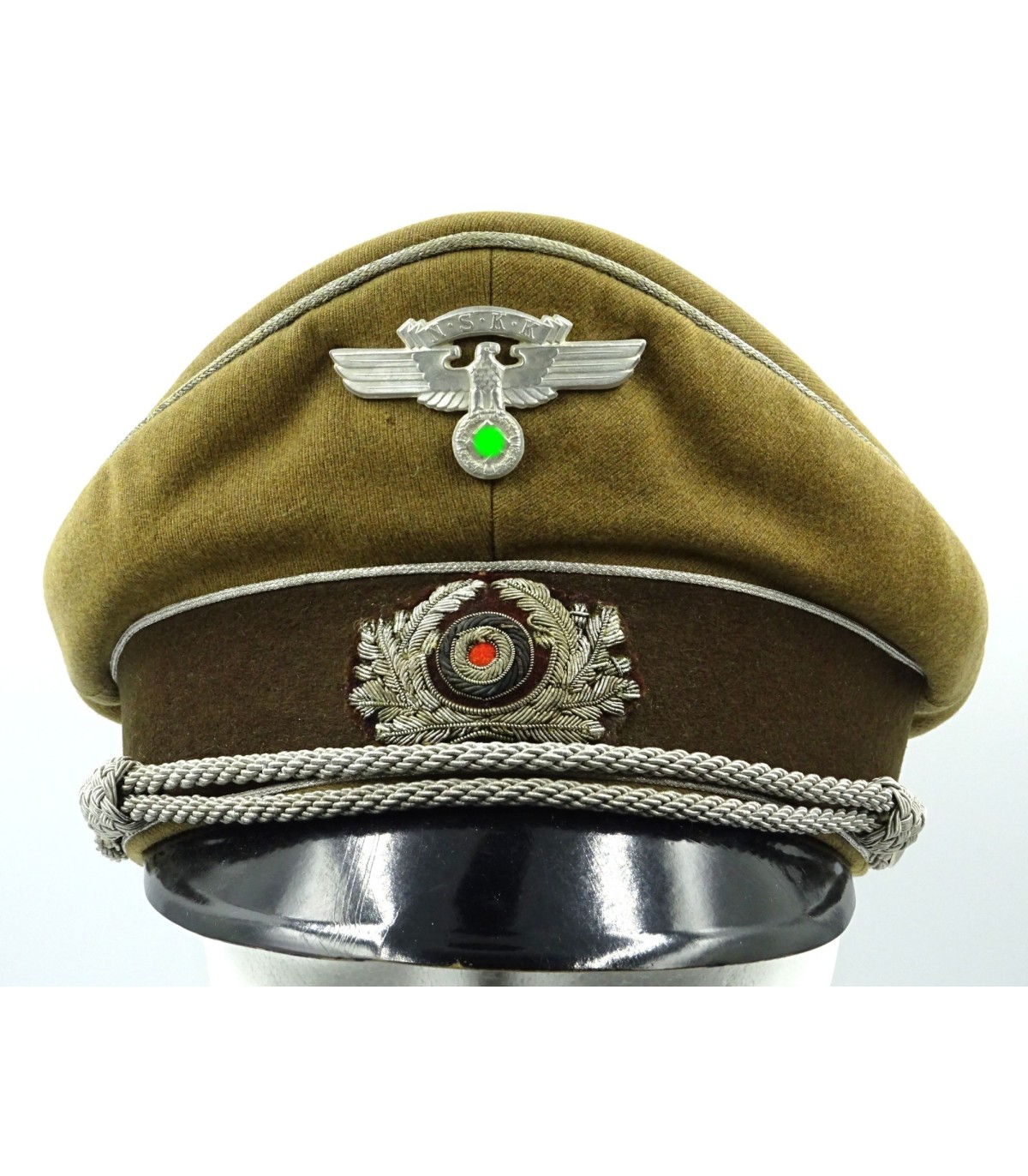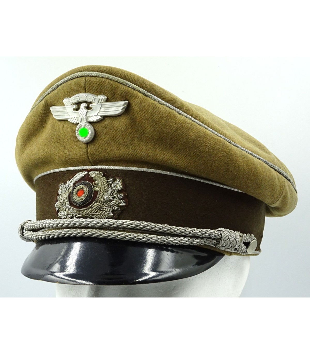 Introduced on may the 31th 1941 to replace the coffee can for NSKK officers. Light brown gabardine body and dark brown band. Aluminium piping. Hand embroidered wreath, army style, on dark brown underlay. Sattelform. Made by Erel Berlin. Scarce. GC-.