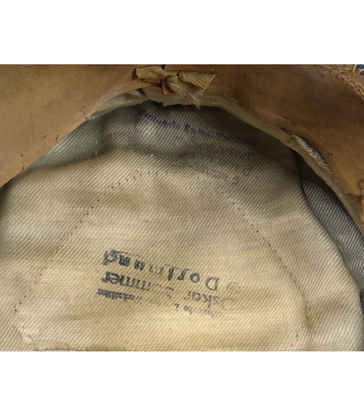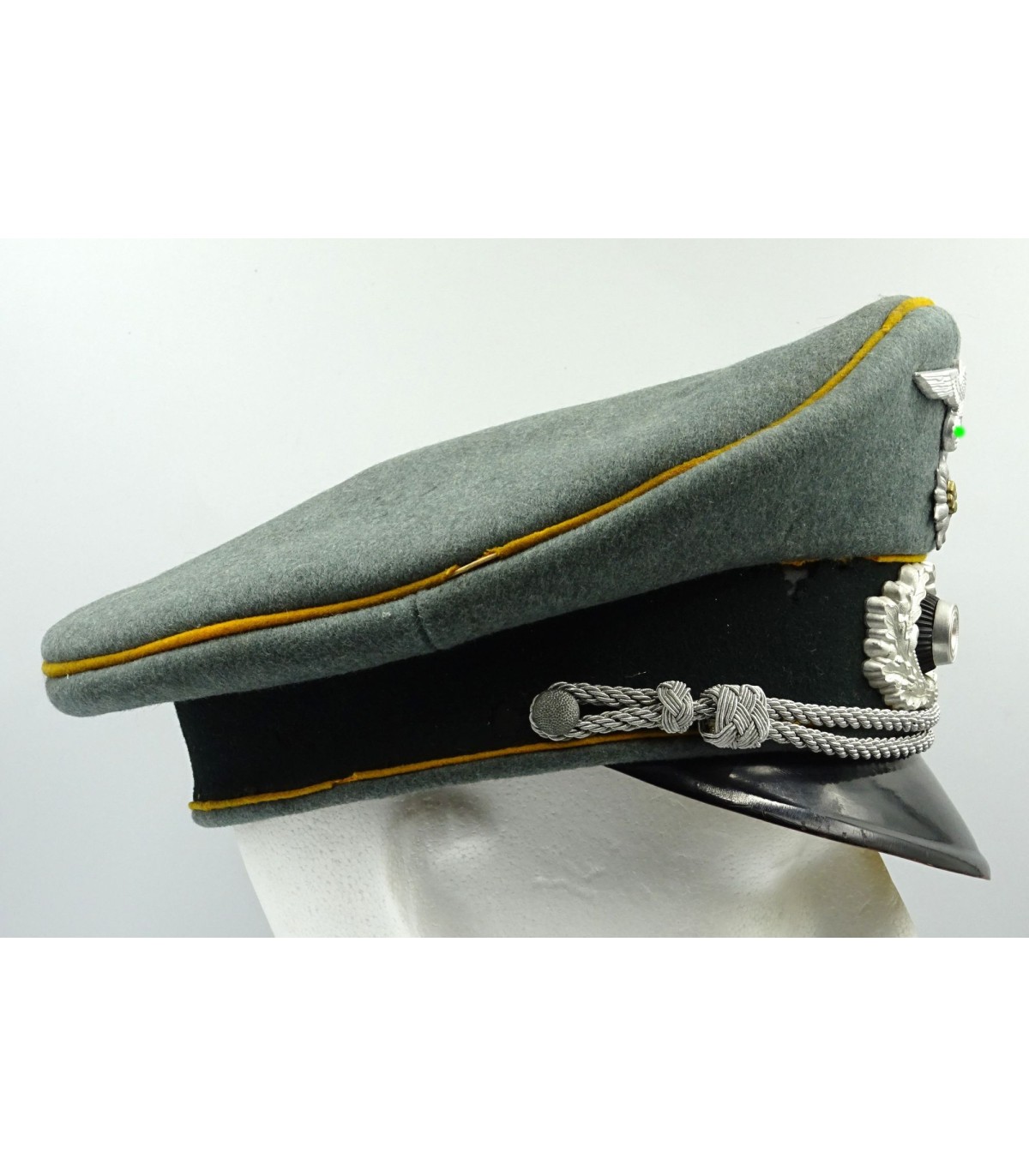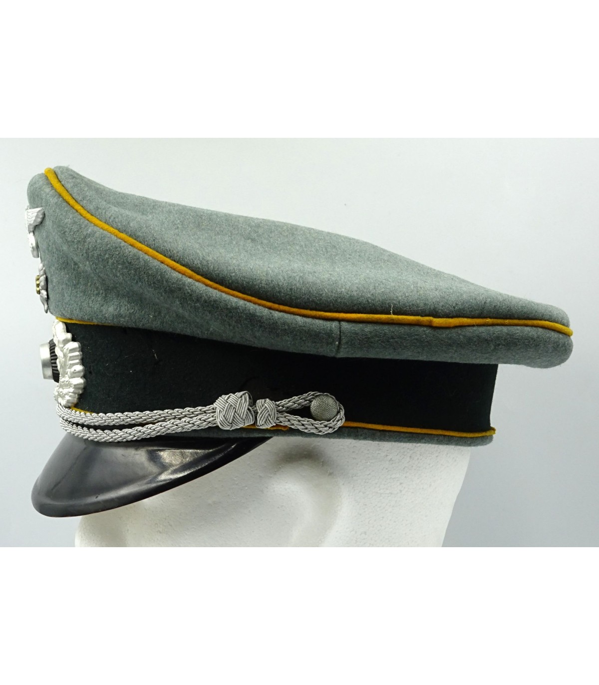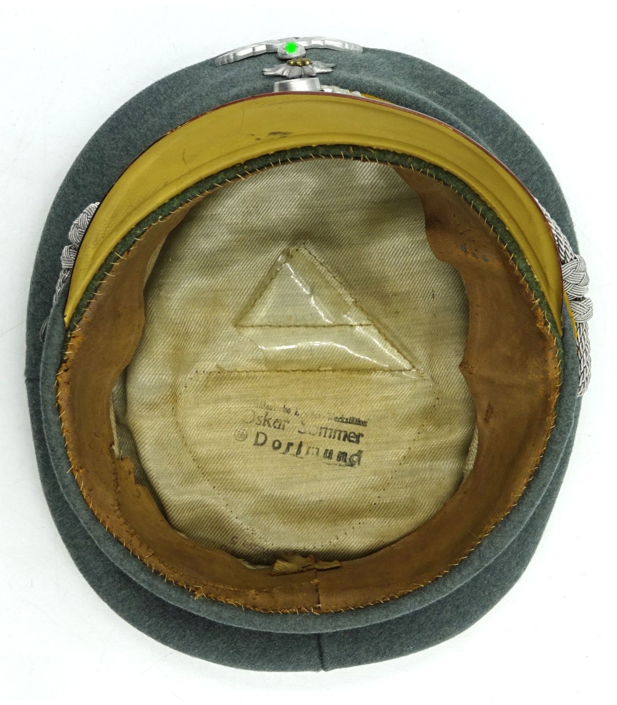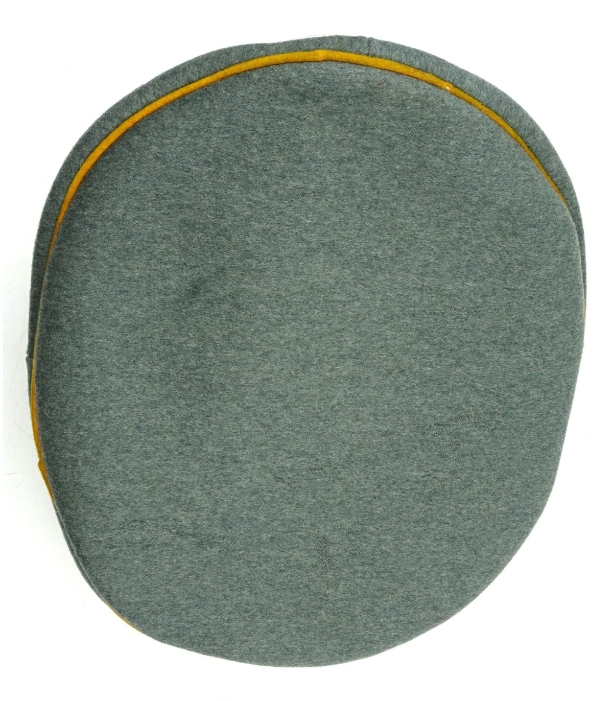 Complete. Metal insignias. Fieldgrey doeskine body. Gold yellow piping. Repaired sweat band. Some moth holes. Nice shape. Average.