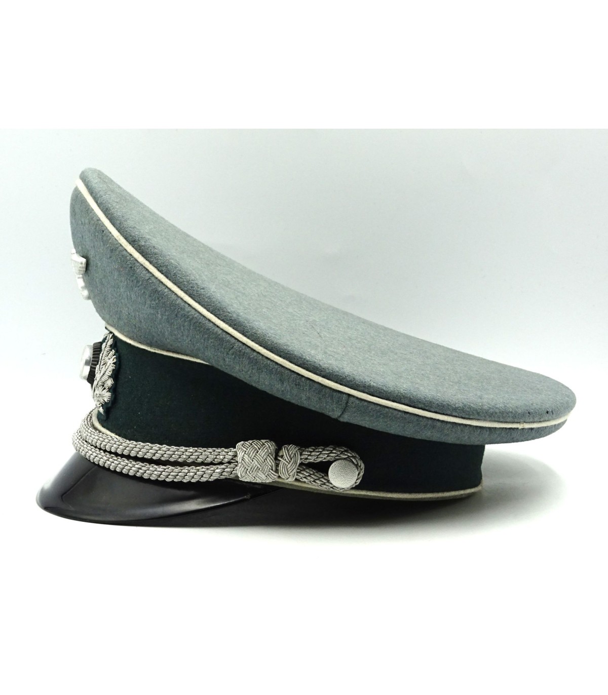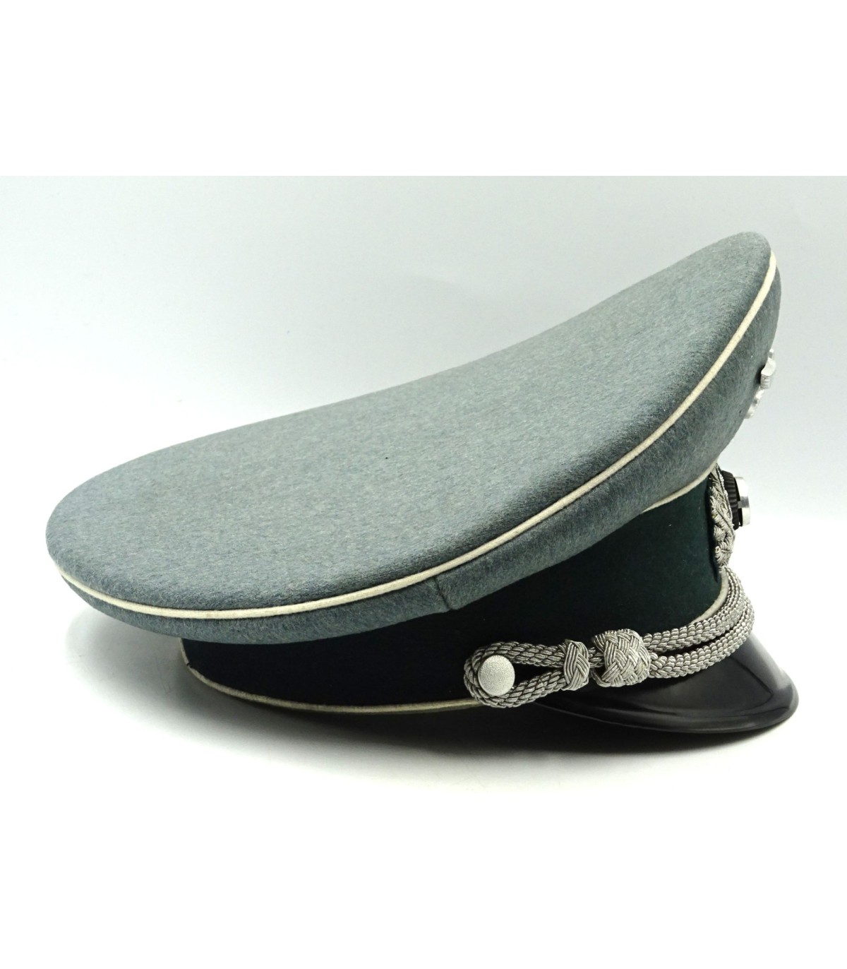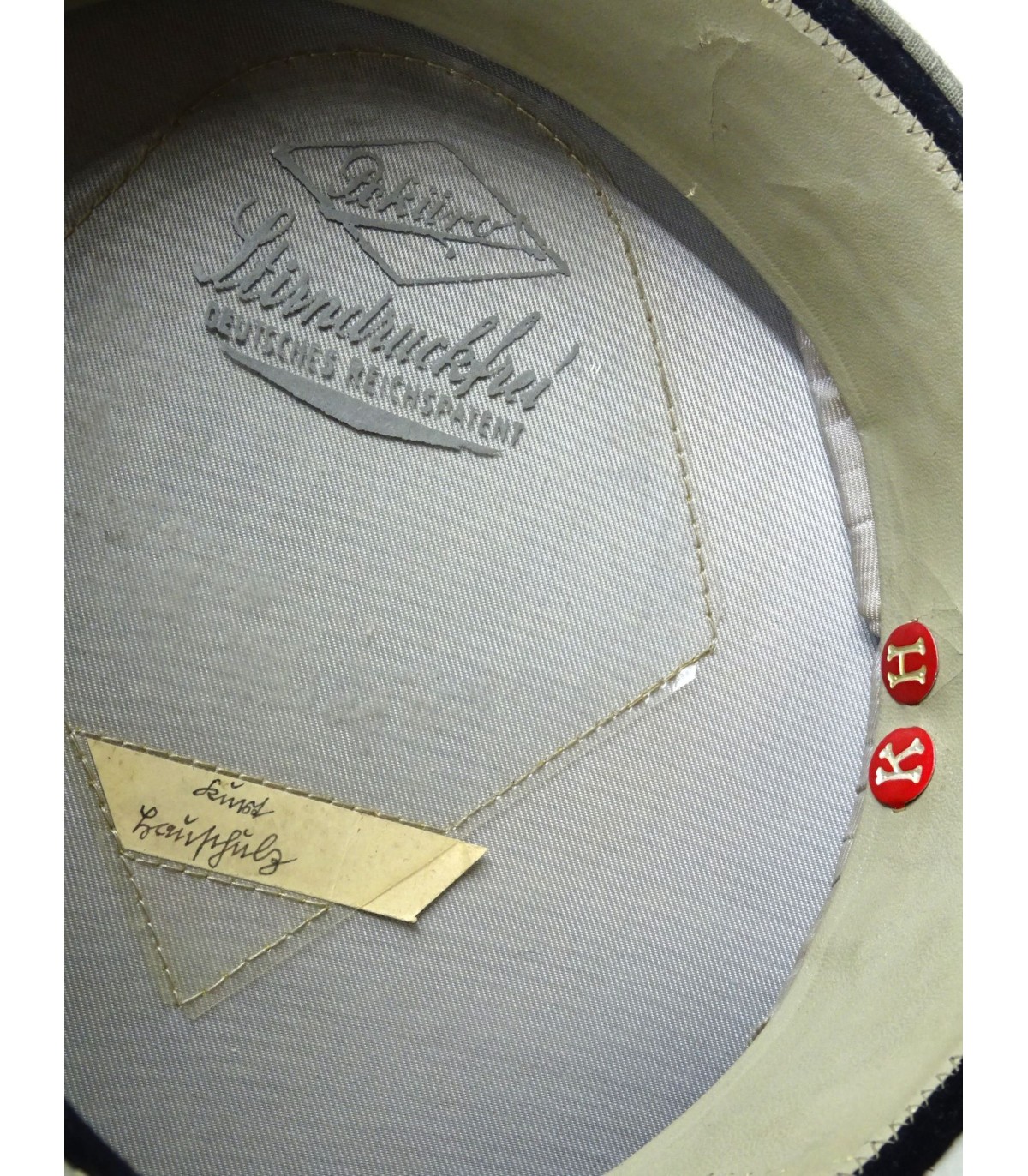 Superb infantry officer's cap, field gray in doeskin, hand-embroidered oak leaves, aluminium cocade and eagle, in excep^tional condition, formerly belonging to Colonel (Generalmajor on December 1, 1944) Kurt Hauschulz (recipient of numerous decorations including the prestigious German Cross). Name tag with his initials KH. A rare headgear of a high-ranking officer. VGC.