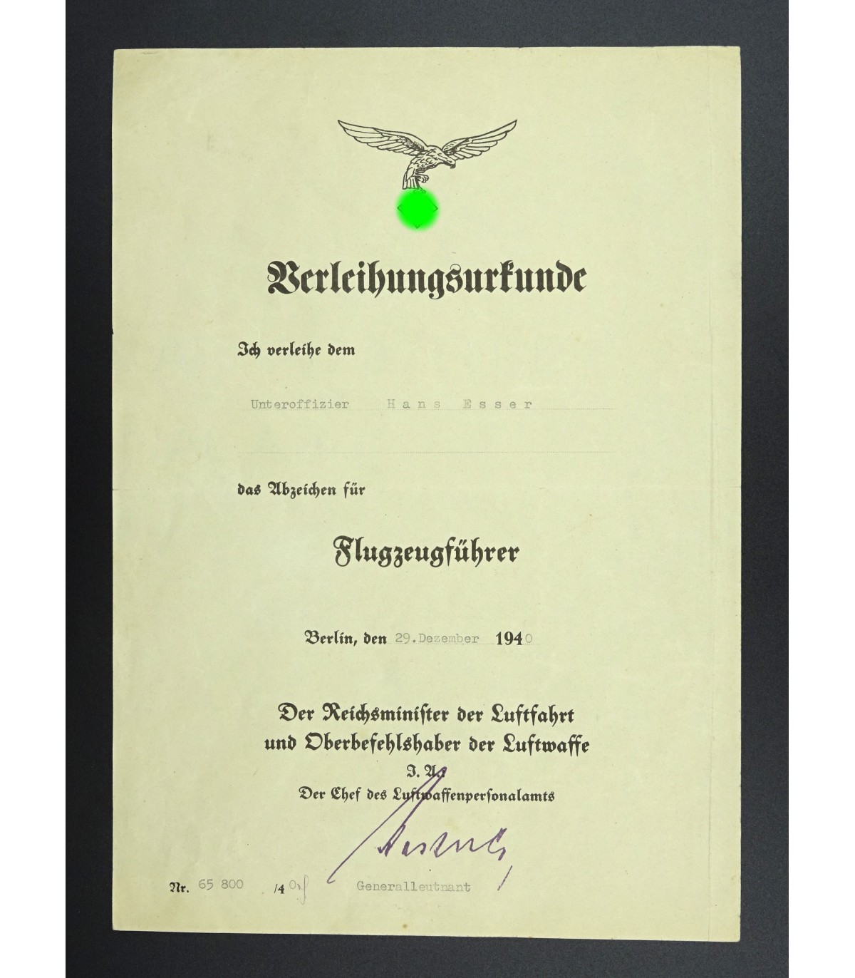 Attribuated to a Unteroffizier in december 1940. Signed by a Generalleutnant. Size A4. VGC.