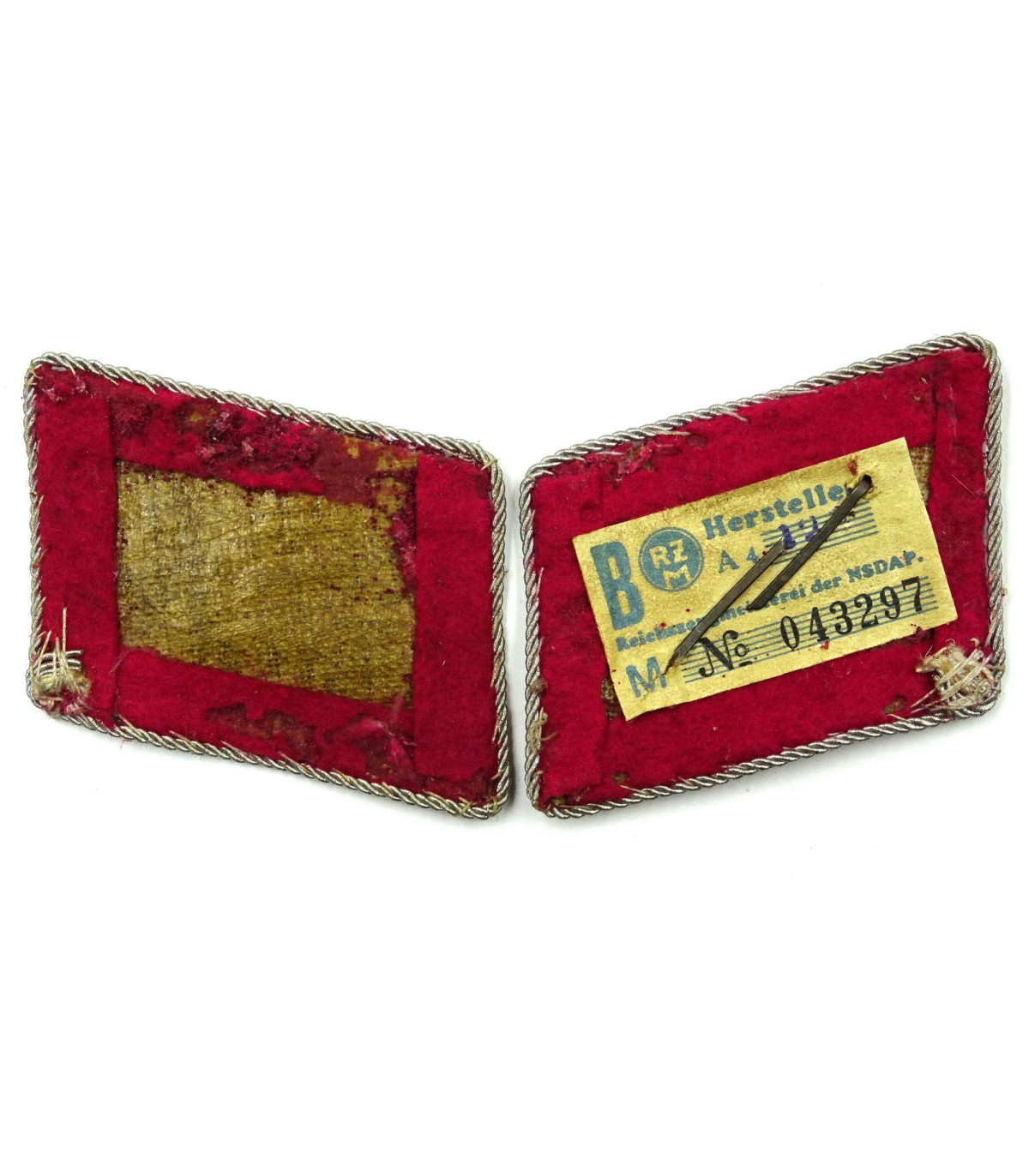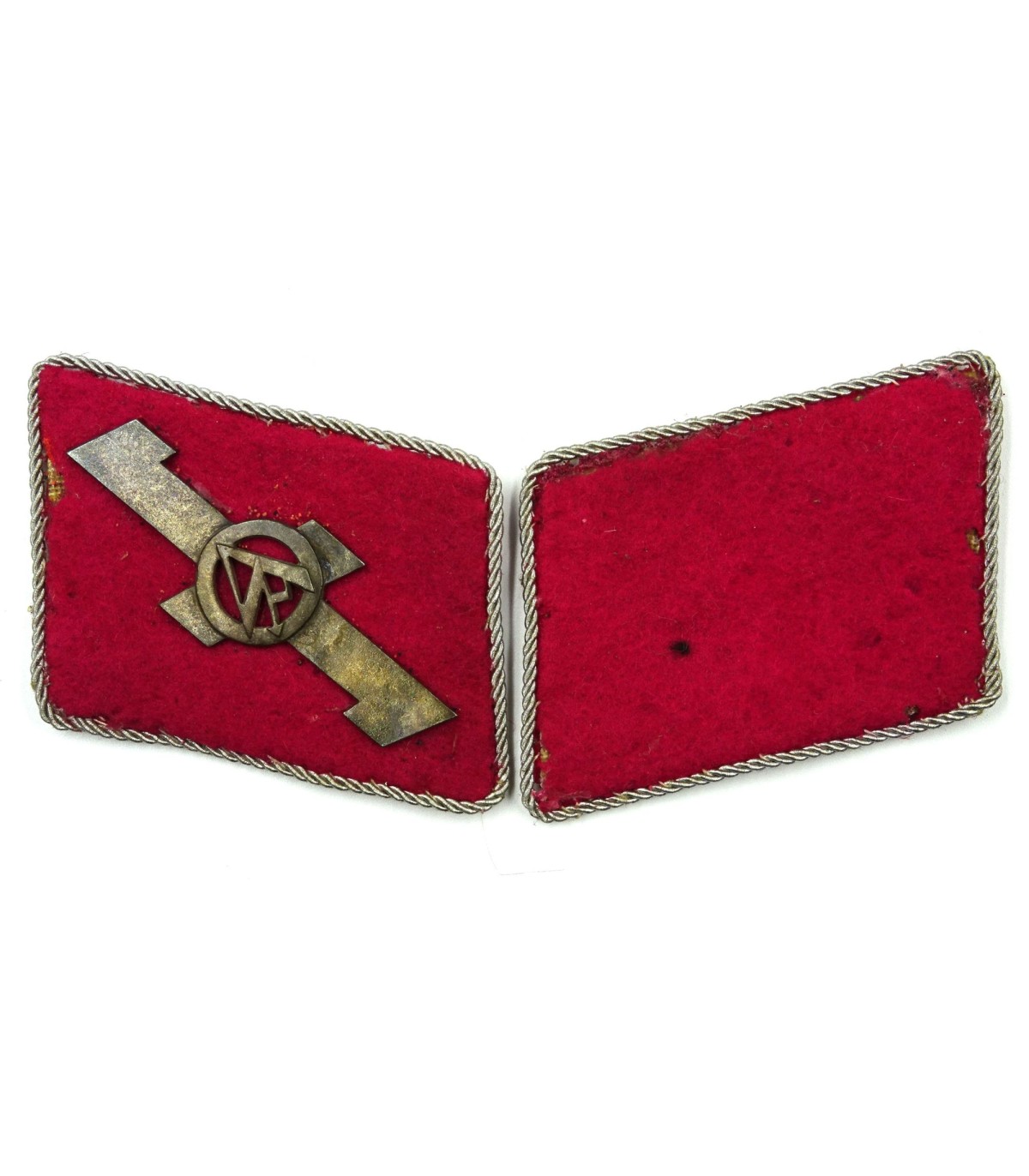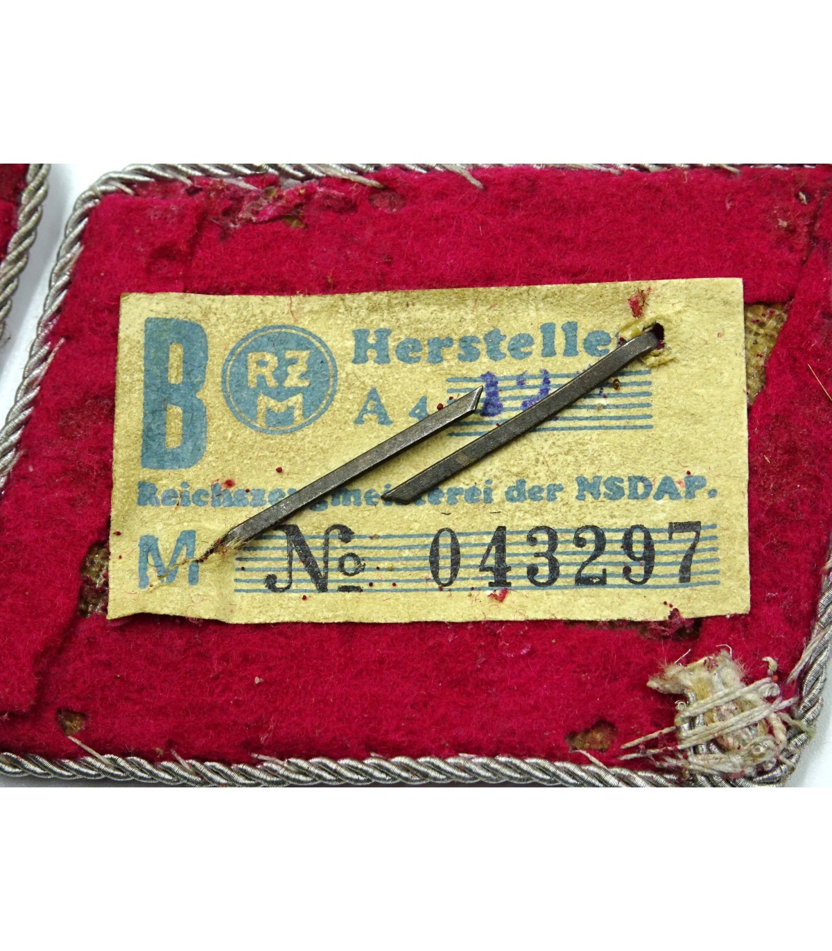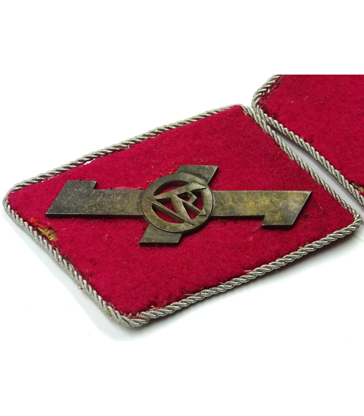 Rune and SA sign in metal. Crimson underlay with few moth holes. RZM label. Scarce. Average.