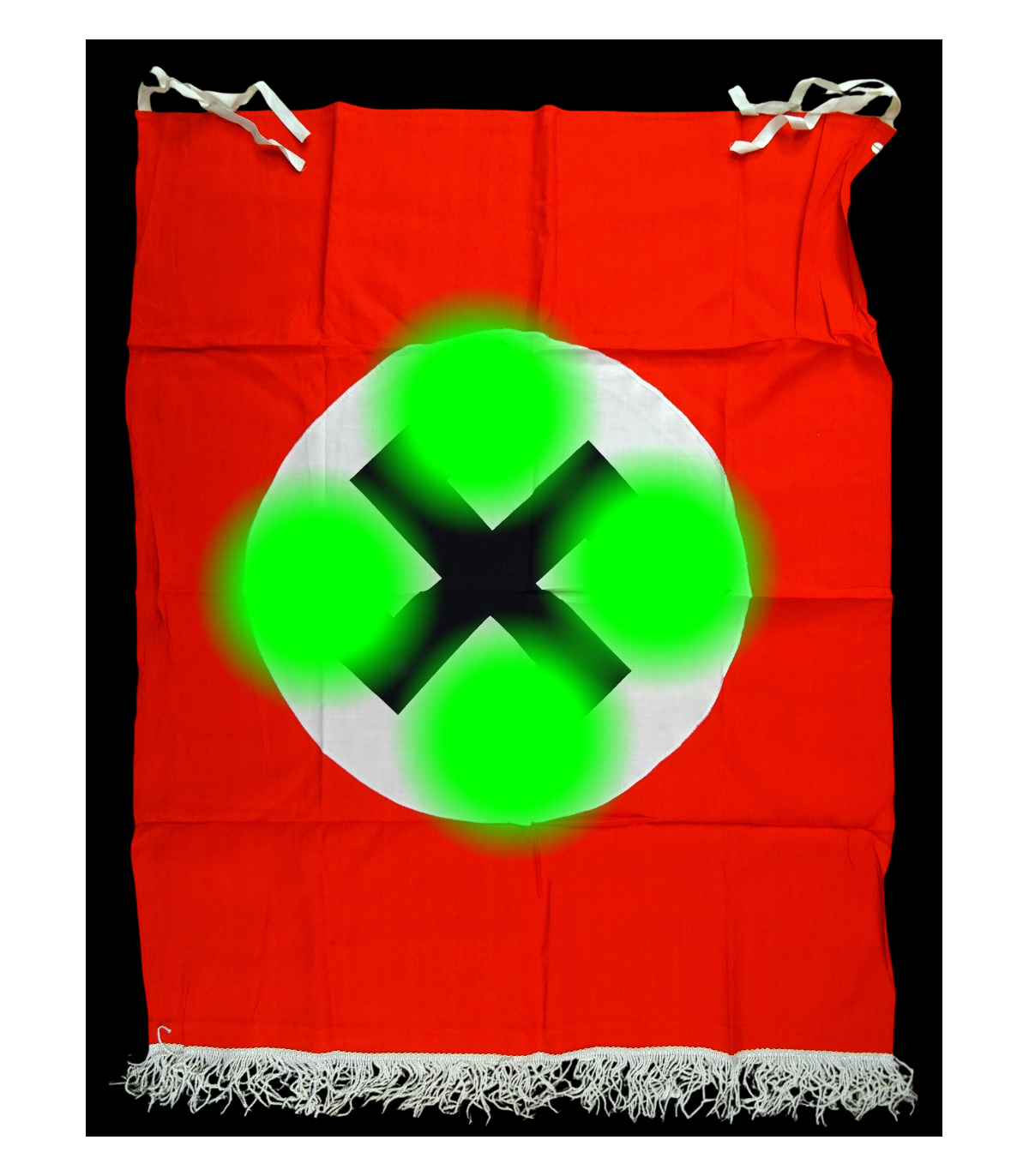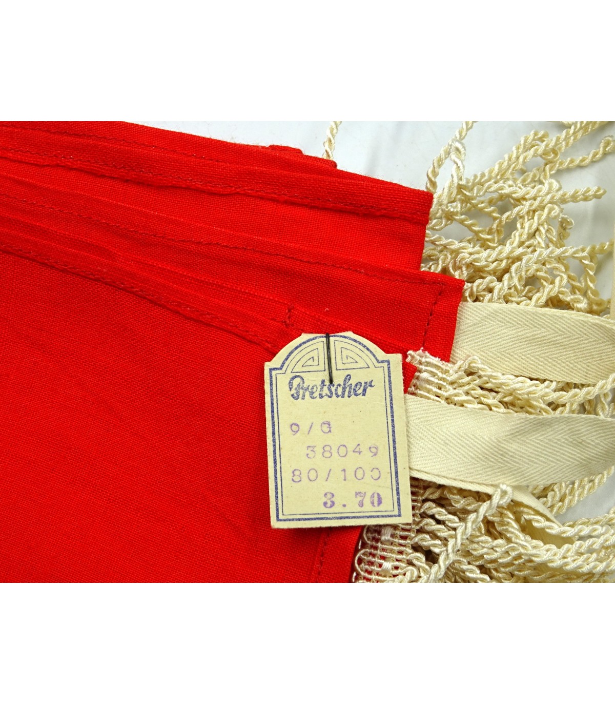 Gorgeous NSDAP tribune flag, 100x80. One side. White fringes. 2 mounting brackets. Still with orginal price paper tag (3,70 Reichsmark). 1945 GI pick up. Guaranteed original.