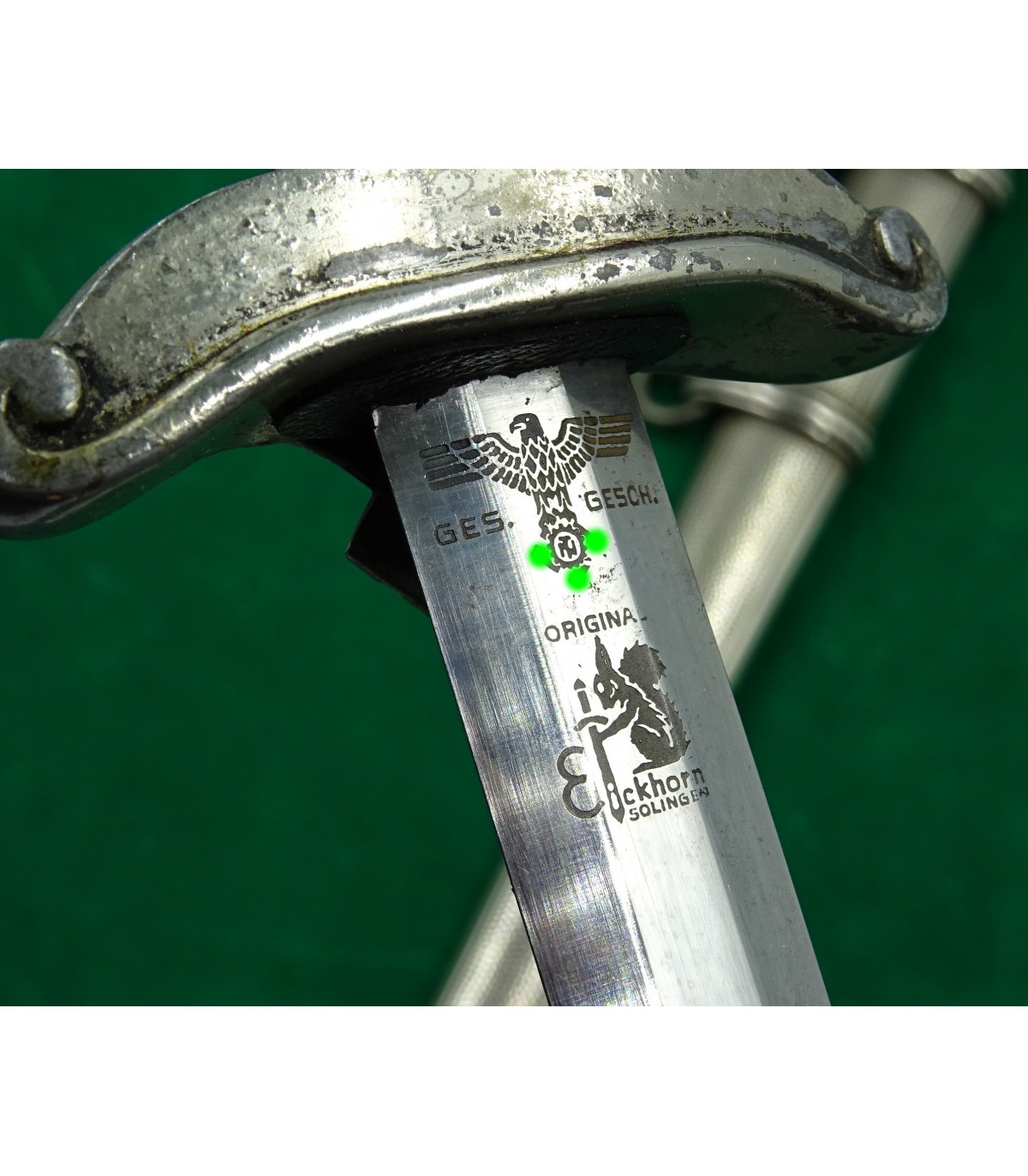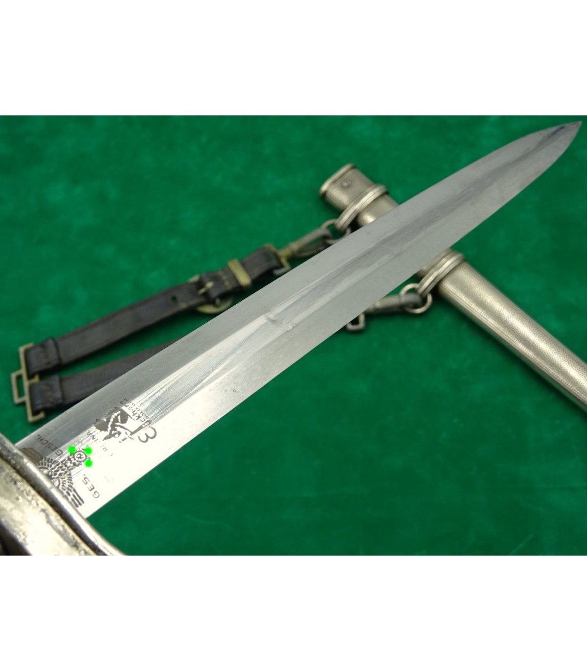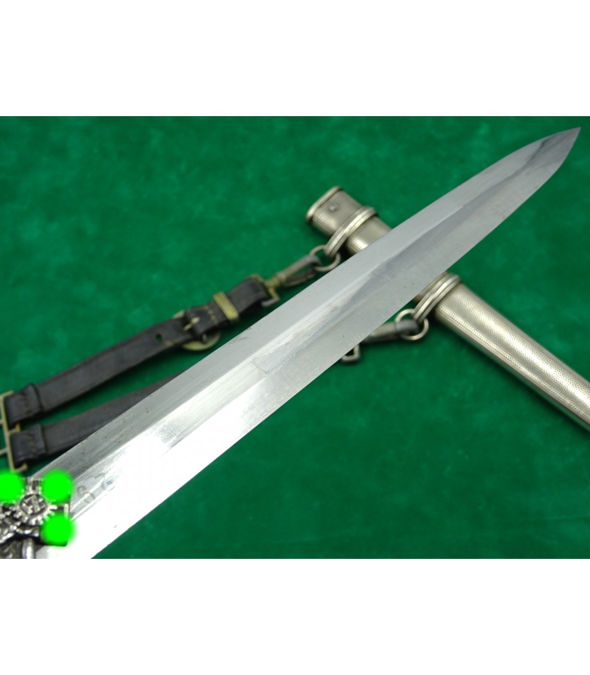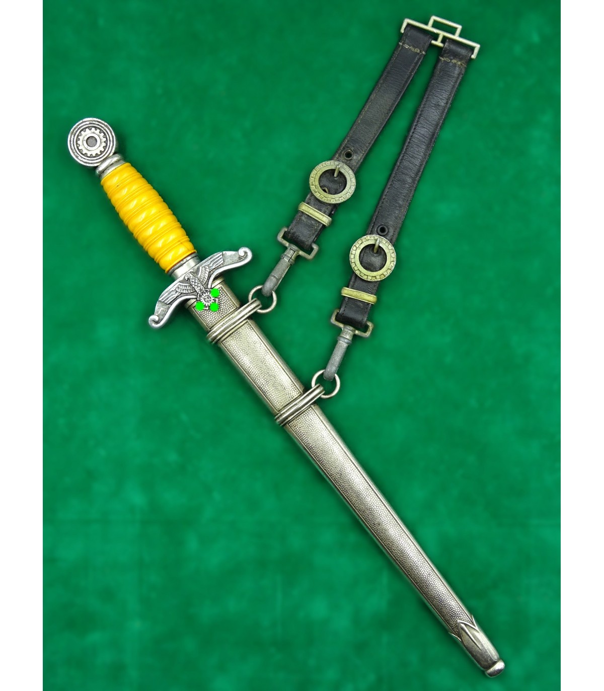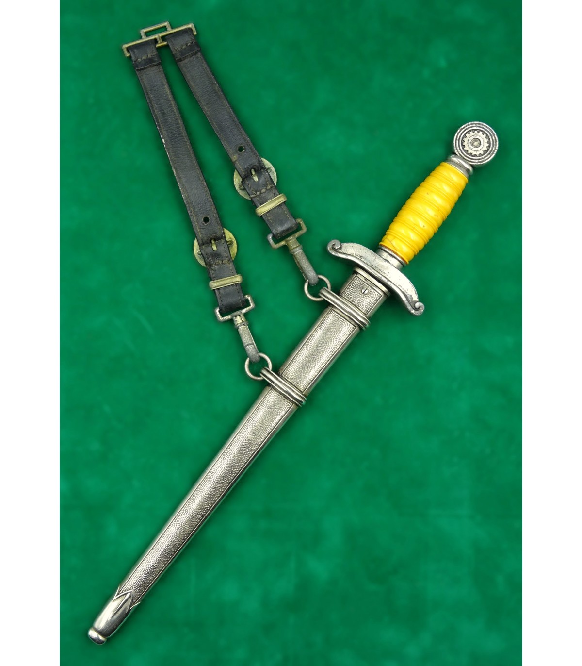 Bellissimo e raro pugnale da ufficiale Teno di Eickhorn Solingen. Fuso giallo con piccoli peli sul dorso in basso. N° 2917 sulla lama e all'ingresso del fodero. Bella lama. Con chiusura in cuoio, anelli Assmann. BE-TBE.