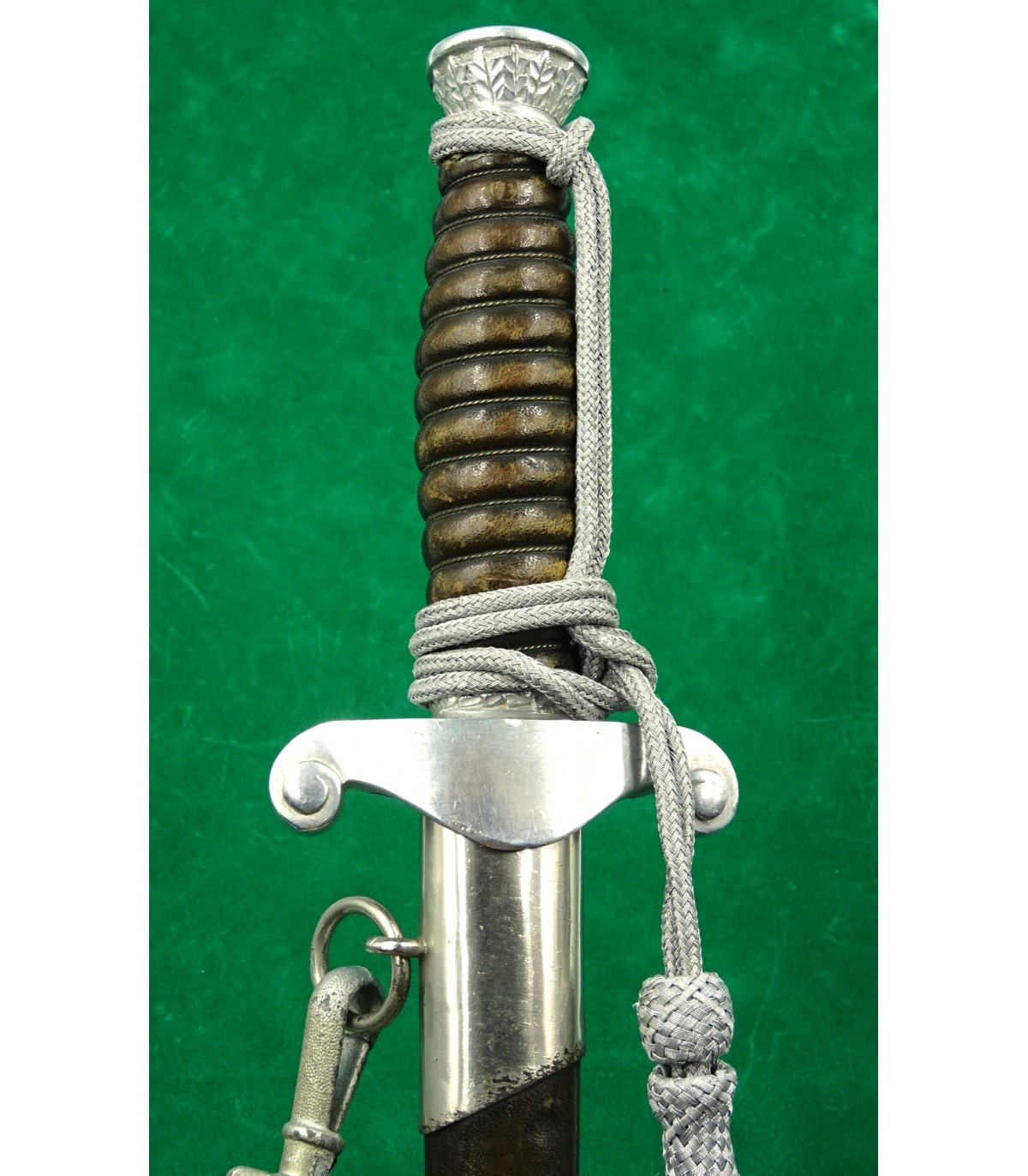 Impugnatura in alluminio. Spoletta e fodero rivestiti in pelle verde. Elsa verde e argento. Con il suo cinturino specifico. BE-TBE.