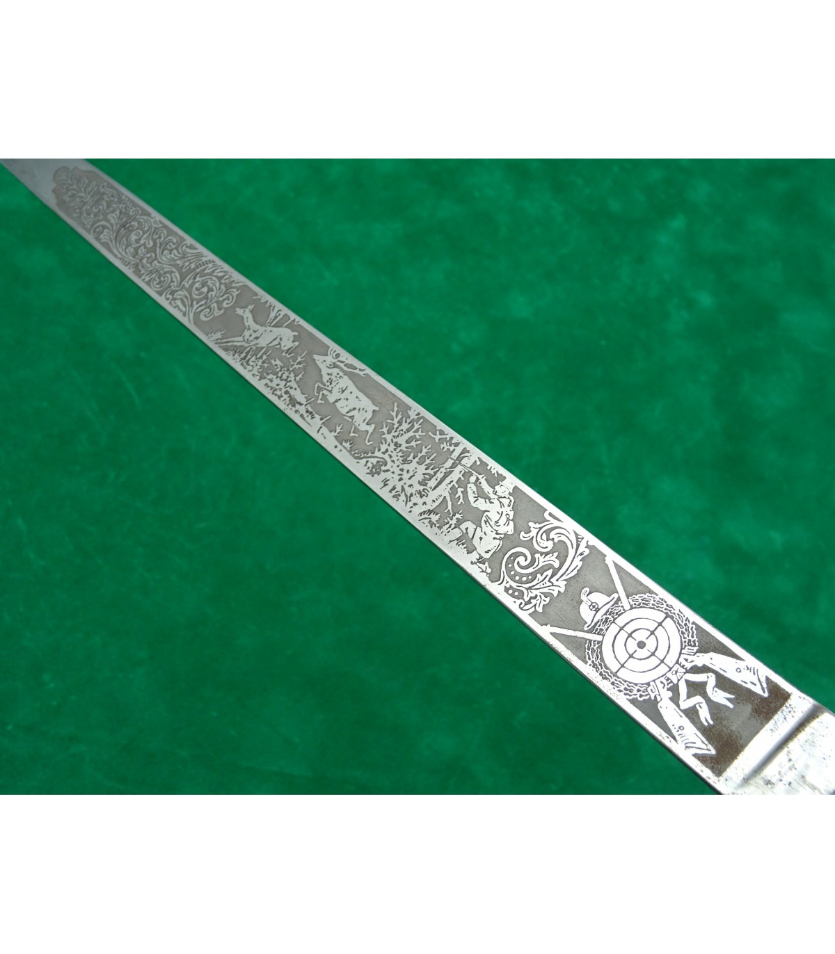 Manico in corno con emblema dell'organizzazione, bella lama incisa su 2 lati. Fodero in pelle verde. BE-TBE.