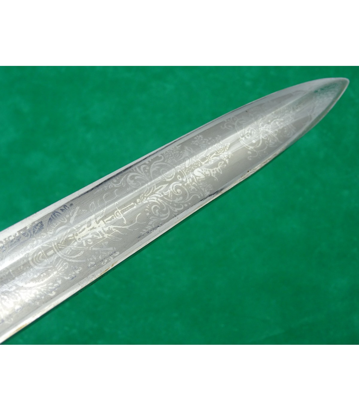 Incisione della lama su due lati. Placche del manico in corno. Fodero in pelle con finiture in oro. BUONE CONDIZIONI.