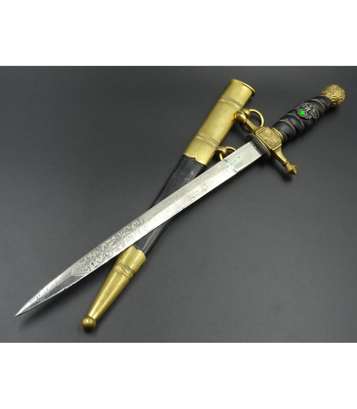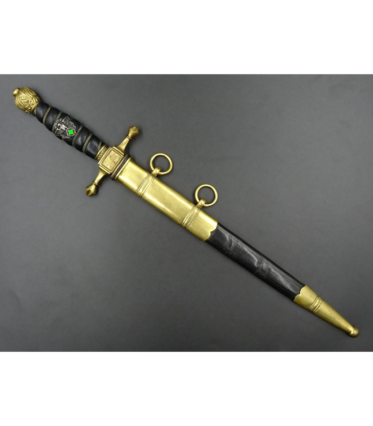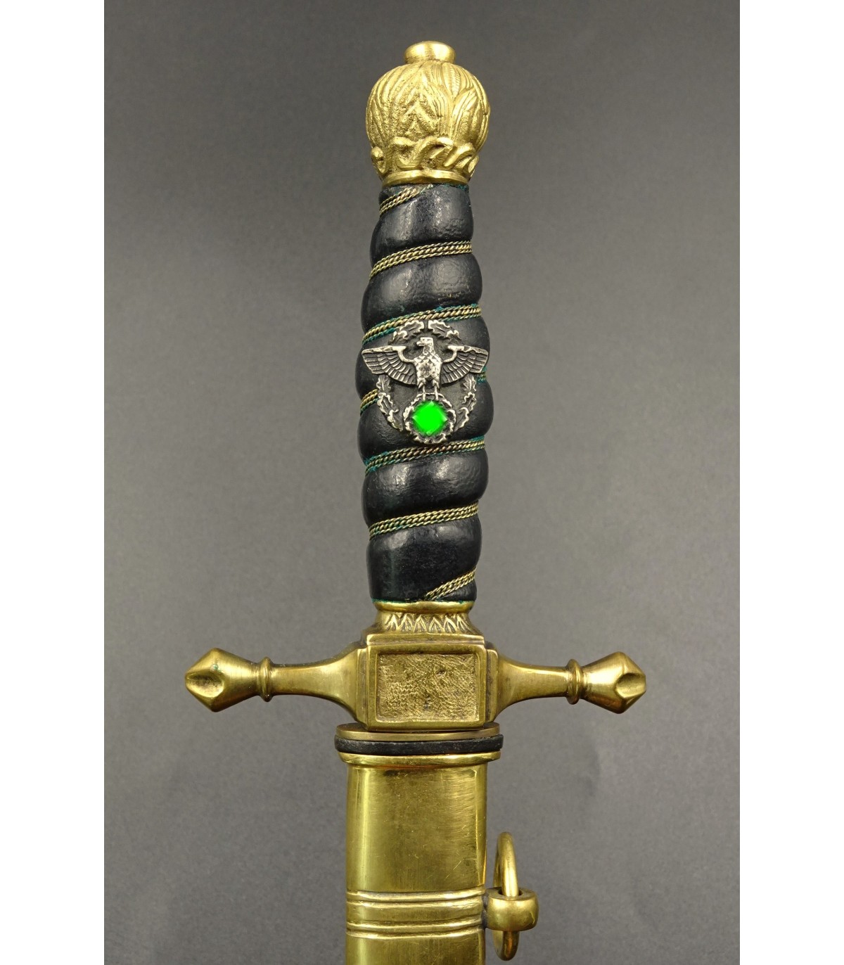 Fodero e spoletta in pelle nera, finiture in ottone sul fodero e impugnatura in bronzo dorato. Aquila della polizia in argento sulla spoletta. Bella lama a doppia incisione. Non rintracciabile. Probabilmente uno dei pugnali più rari del 3° Reich. BE-TBE.