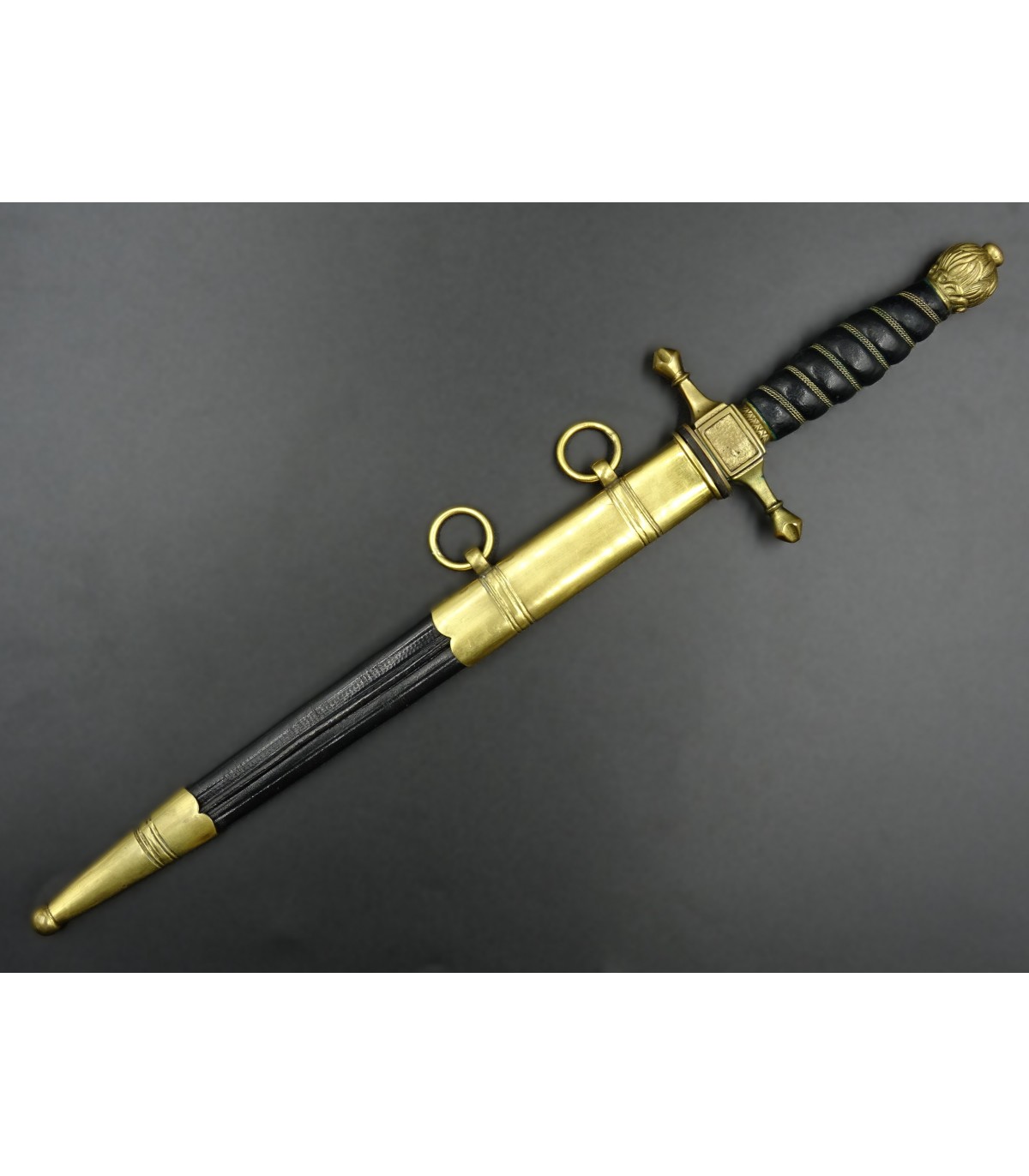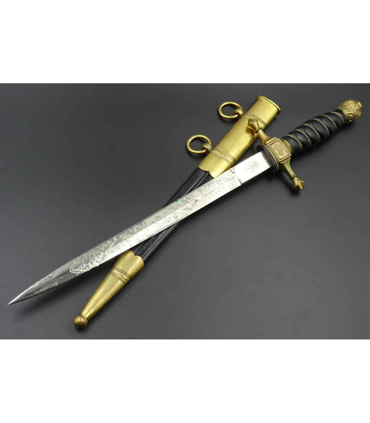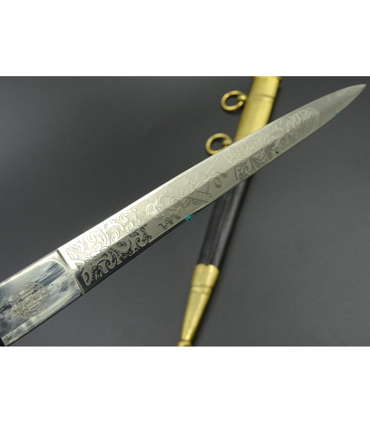 Fodero e spoletta in pelle nera, finiture in ottone sul fodero e impugnatura in bronzo dorato. Aquila della polizia in argento sulla spoletta. Bella lama a doppia incisione. Non rintracciabile. Probabilmente uno dei pugnali più rari del 3° Reich. BE-TBE.