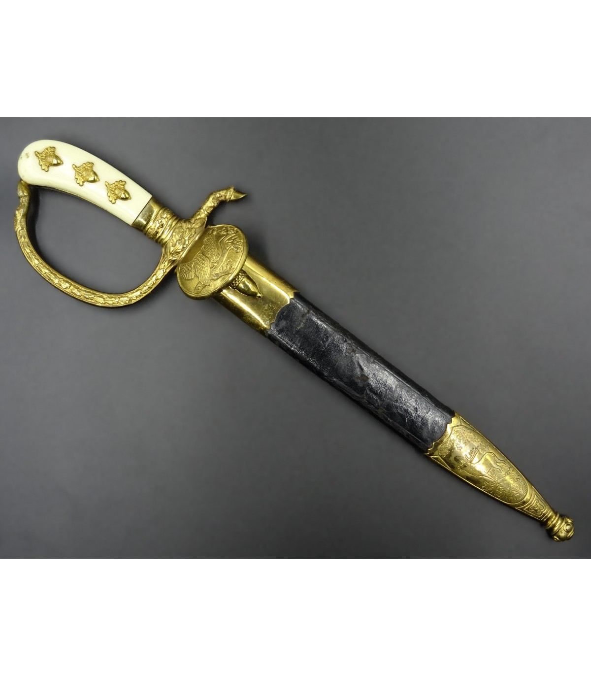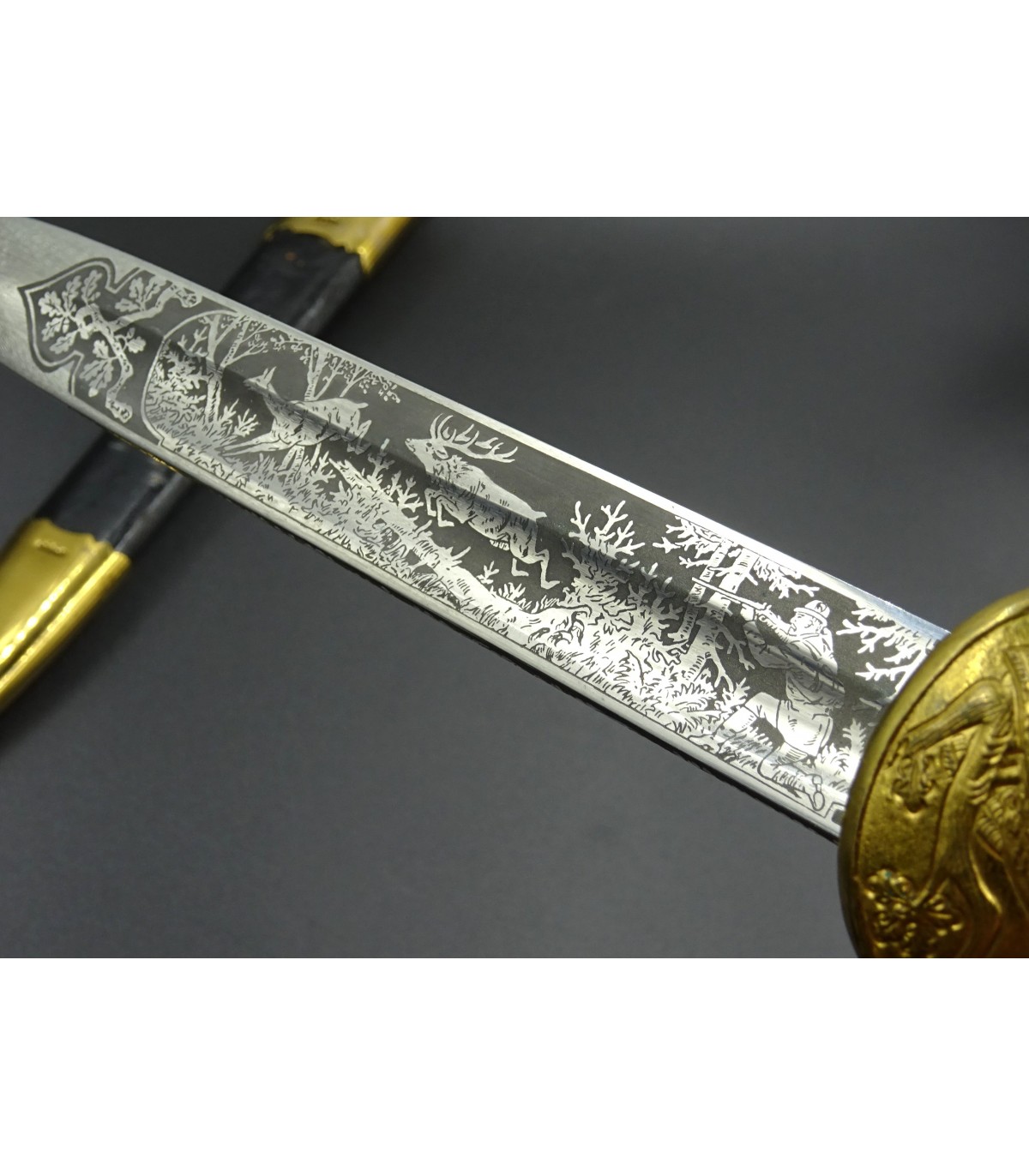 Lama incisa su entrambi i lati. Accessori in bronzo dorato. Fodero in pelle ABE, altrimenti TBE.